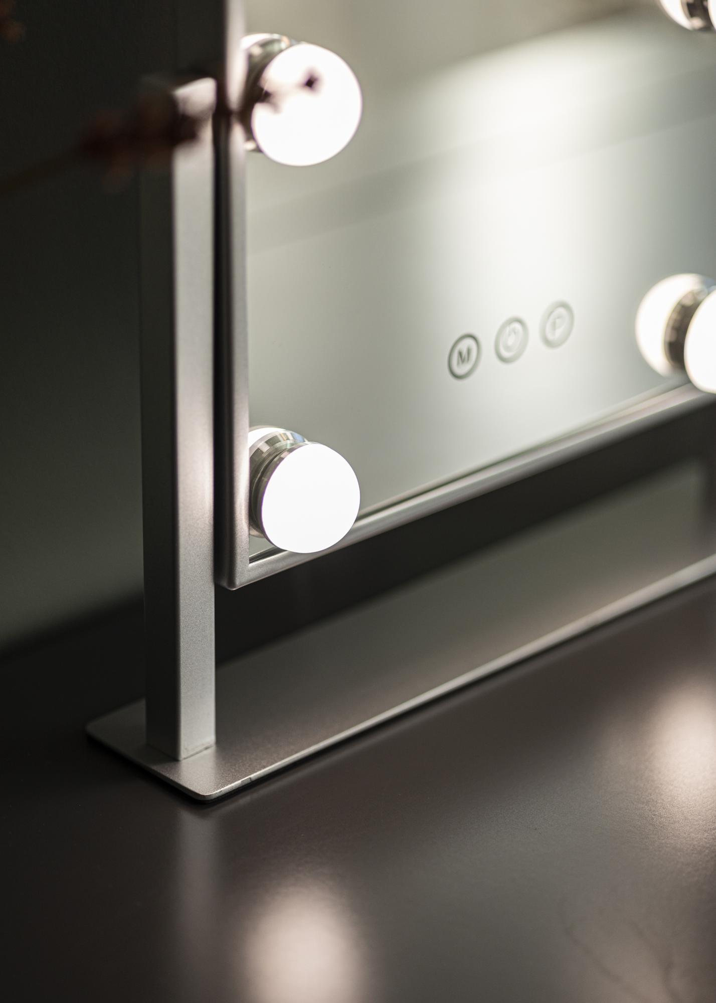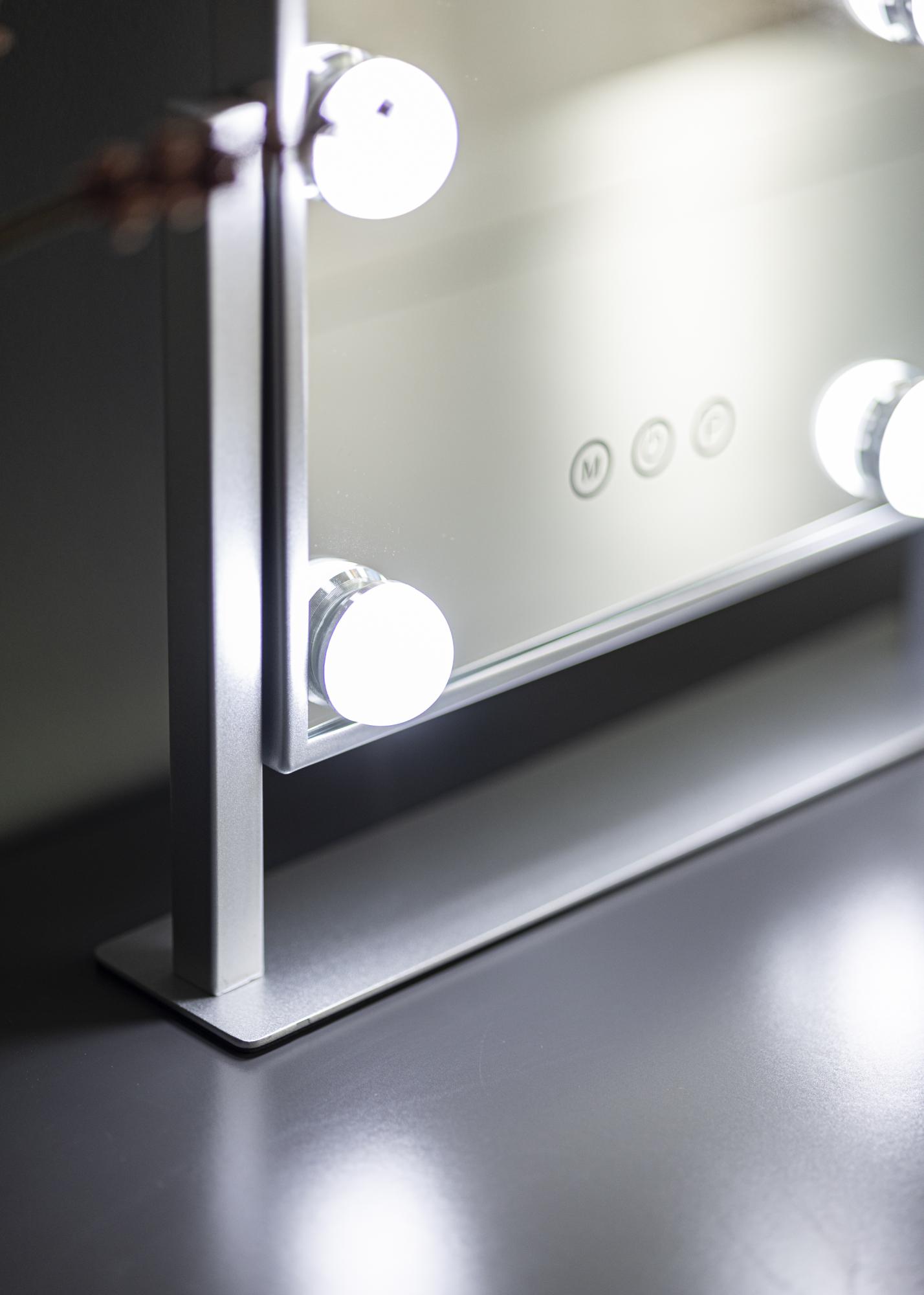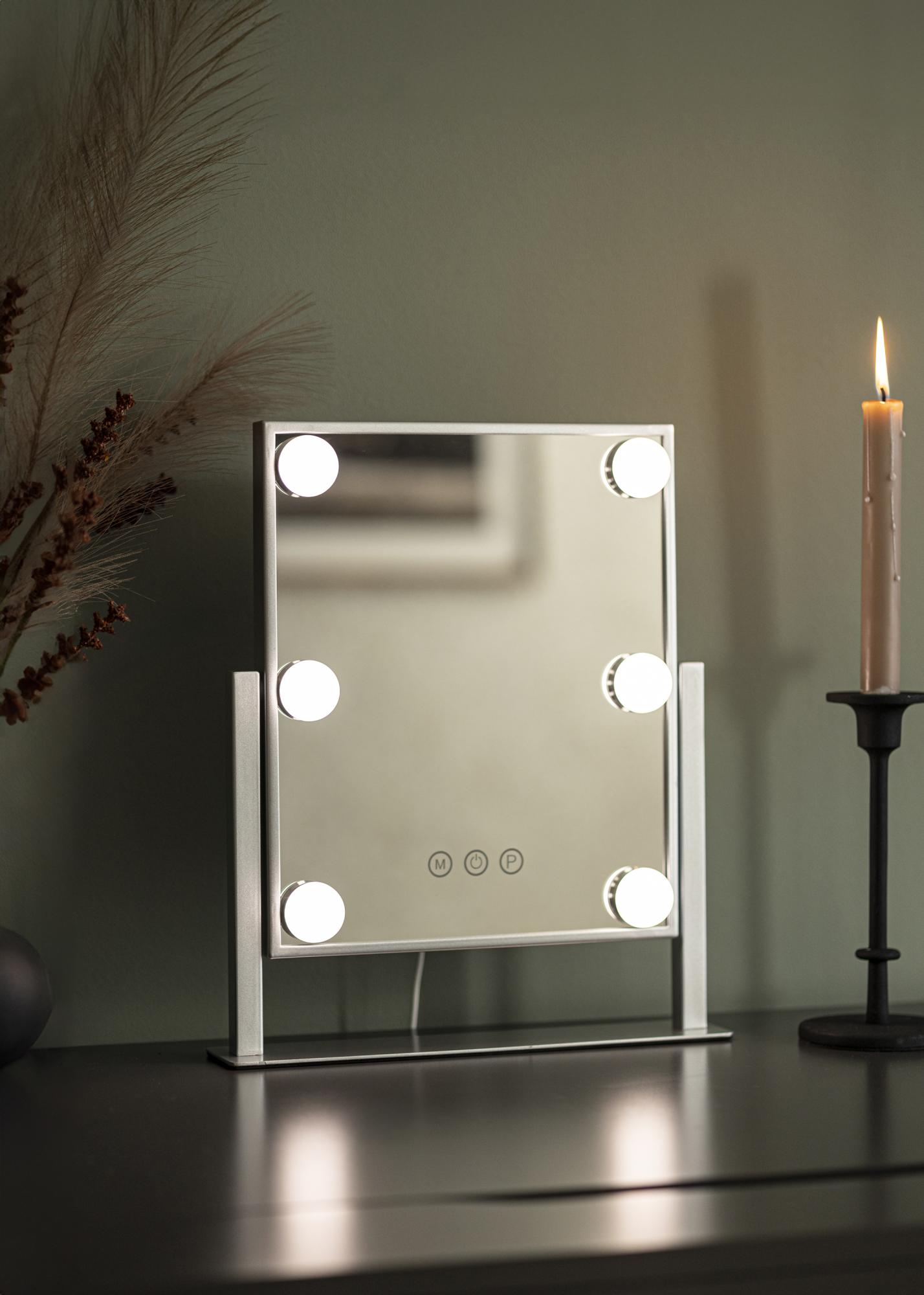 To ogledalo za ličenje iz KAILA dodaja stil in glamur vašemu domu! Njegova majhna velikost omogoča, da se dobro prilega tako v spalnici kot v dnevni sobi, odvisno od tega, kje raje nanašate ličila in se pripravljate na dan. Ogledalo je v elegantni srebrni barvi in je opremljeno s 6 LED-lučkami, ki stilsko uokvirjajo površino ogledala. Ogledalo ima na sprednji strani gumbe na dotik, s katerimi lahko prižgete lučko ter nastavite osvetlitev. Gumb z oznako "M" prilagaja temperaturo barve, gumb z oznako "P" pa nastavlja svetlost.