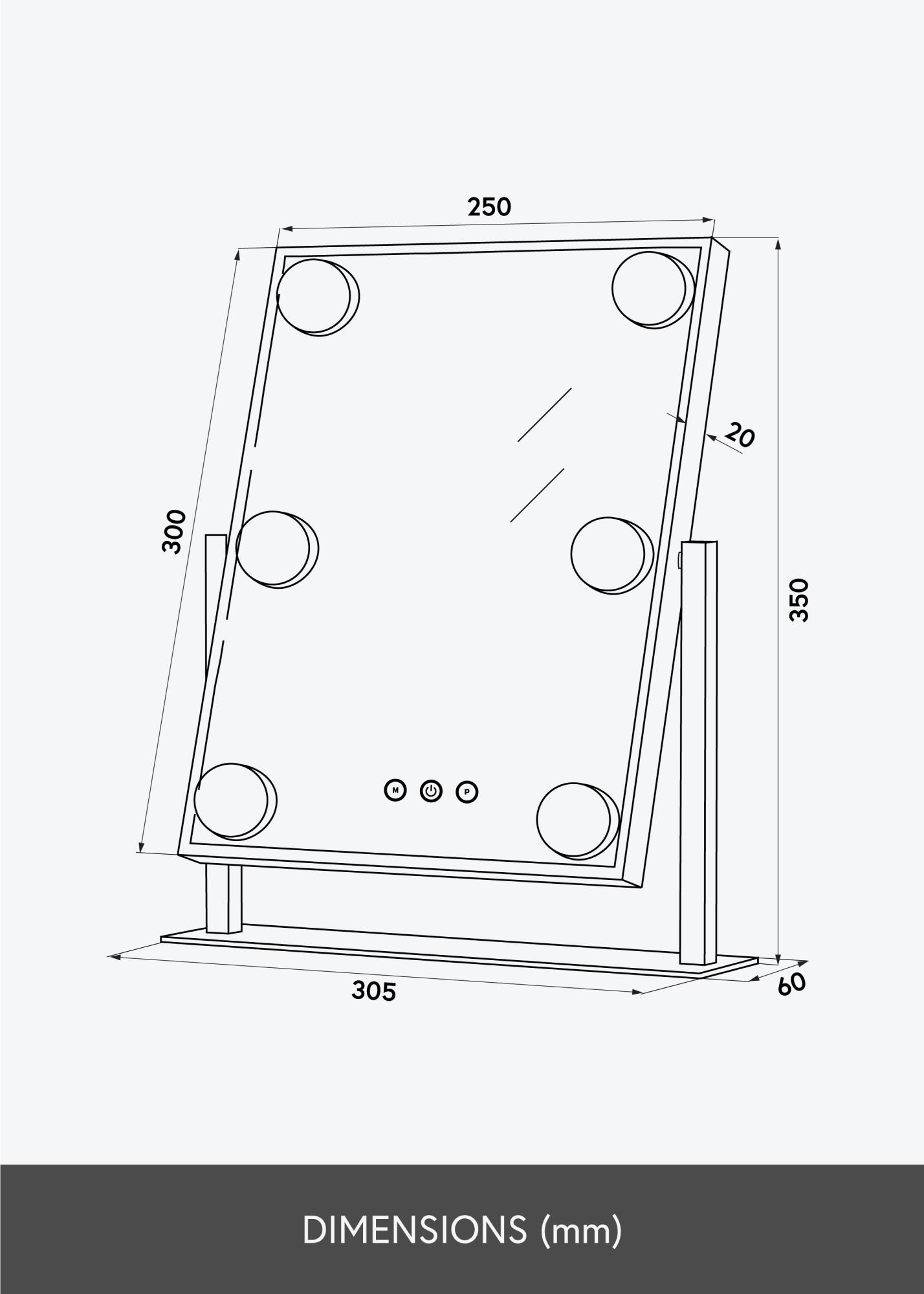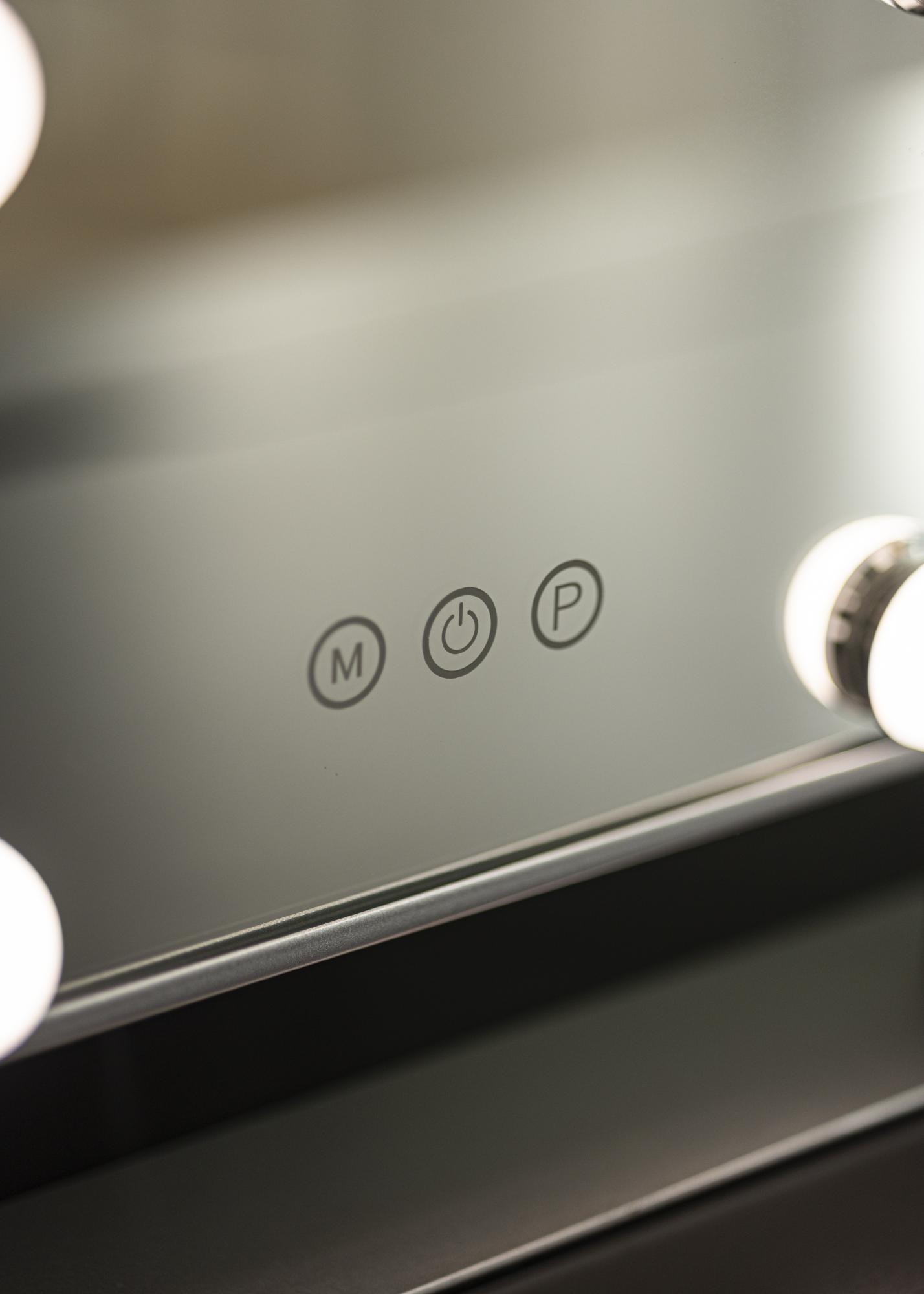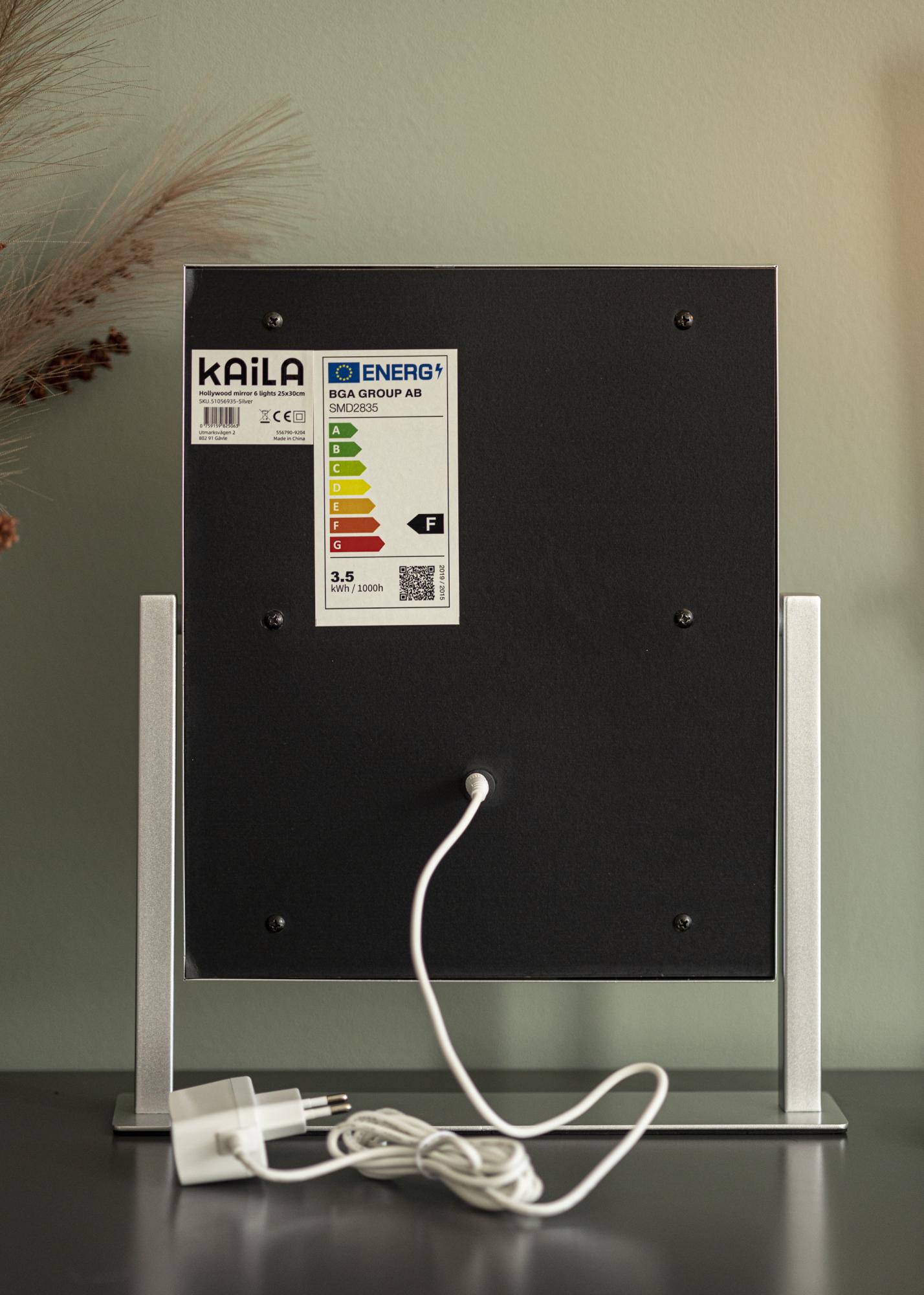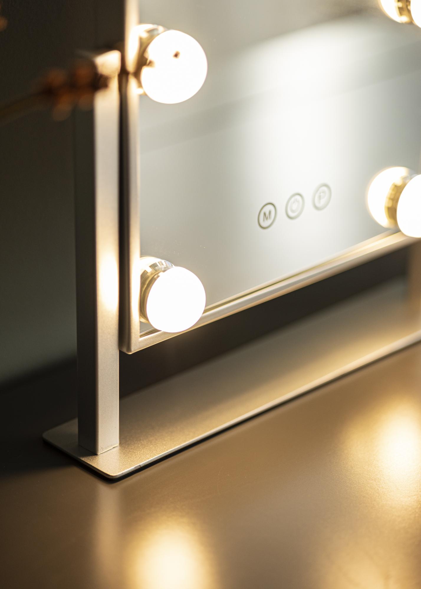 To ogledalo za ličenje iz KAILA dodaja stil in glamur vašemu domu! Njegova majhna velikost omogoča, da se dobro prilega tako v spalnici kot v dnevni sobi, odvisno od tega, kje raje nanašate ličila in se pripravljate na dan. Ogledalo je v elegantni srebrni barvi in je opremljeno s 6 LED-lučkami, ki stilsko uokvirjajo površino ogledala. Ogledalo ima na sprednji strani gumbe na dotik, s katerimi lahko prižgete lučko ter nastavite osvetlitev. Gumb z oznako "M" prilagaja temperaturo barve, gumb z oznako "P" pa nastavlja svetlost.
