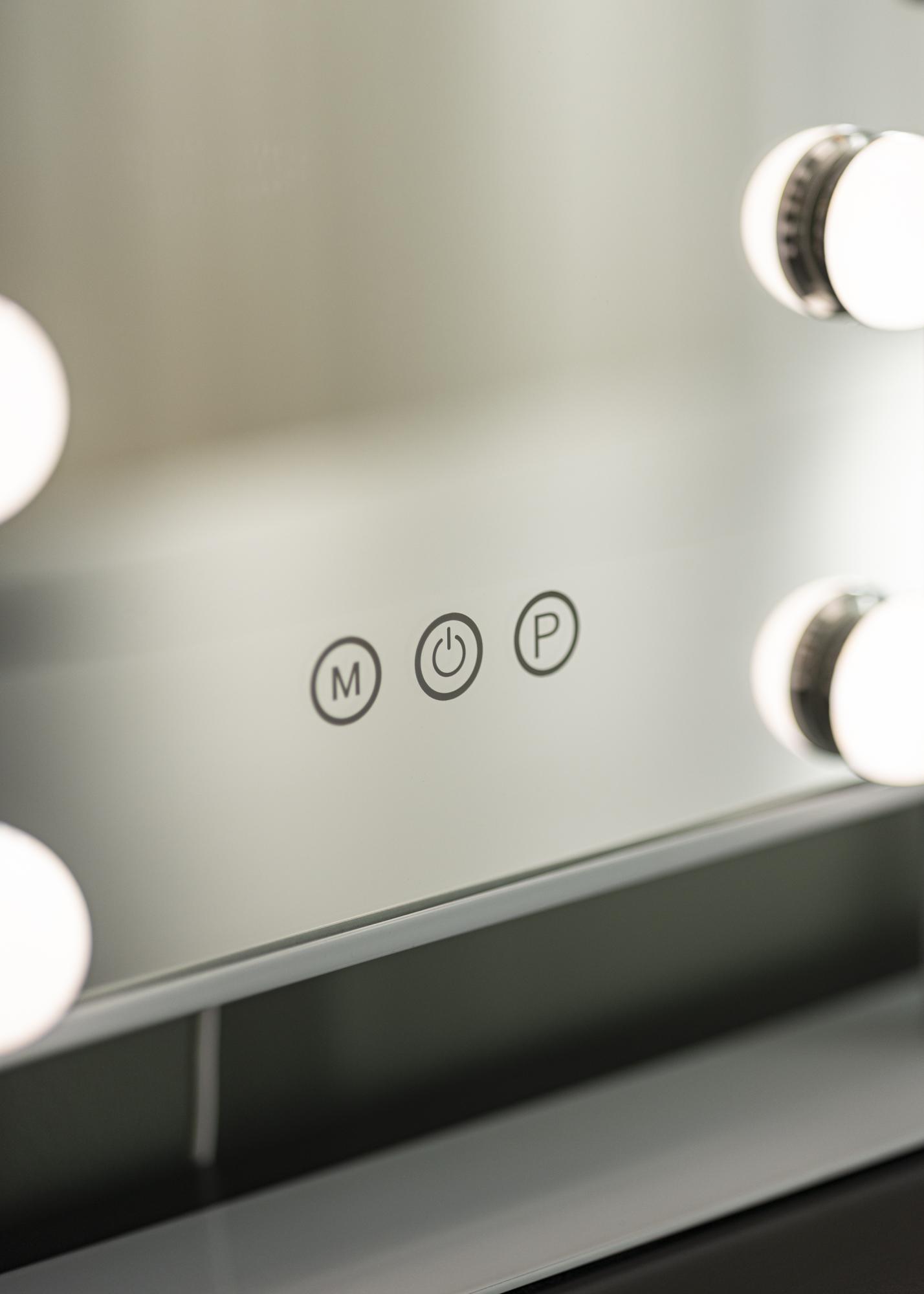 Osvetlitev se prižge preko na dotik občutljivega gumba na sprednji strani ogledala. Obstajajo tudi na dotik občutljivi gumbi za nastavitev svetilnosti in barvne temperature, da lahko nastavite svetlobo točno tako, kot želite. Gumb označen s ”P” vam omogoča zatemnitev svetlobe, medtem ko lahko z gumbom, označenim z ”M”, prilagodite barvno temperaturo osvetlitve. Ogledalo se priključi z vtičem.