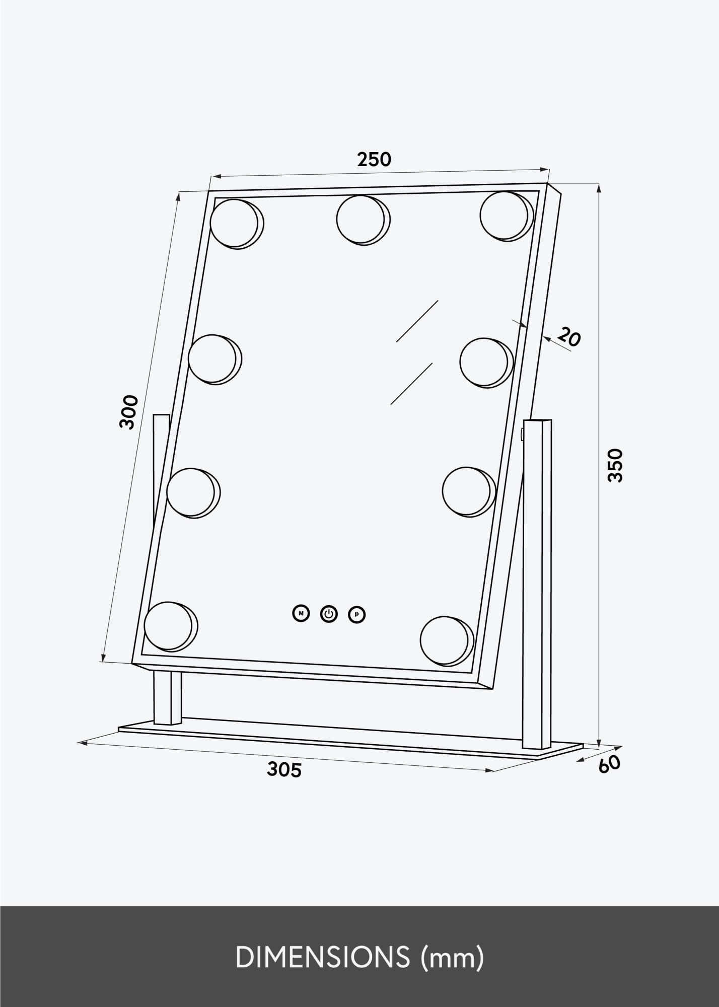 Ogledalo ima integrirano LED-osvetlitev, kar je energetsko učinkovit alternativ z dolgo življenjsko dobo. Osvetlitev vklopite s priročnim gumbom na dotik. Nato imate možnost nastavitve svetlosti in barvne temperature po lastnih željah, prav tako s pomočjo gumbov na dotik (gumb ”M” spreminja barvno temperaturo, gumb ”P” pa spreminja svetlost). Električni priklop se izvede s pomočjo vtiča.