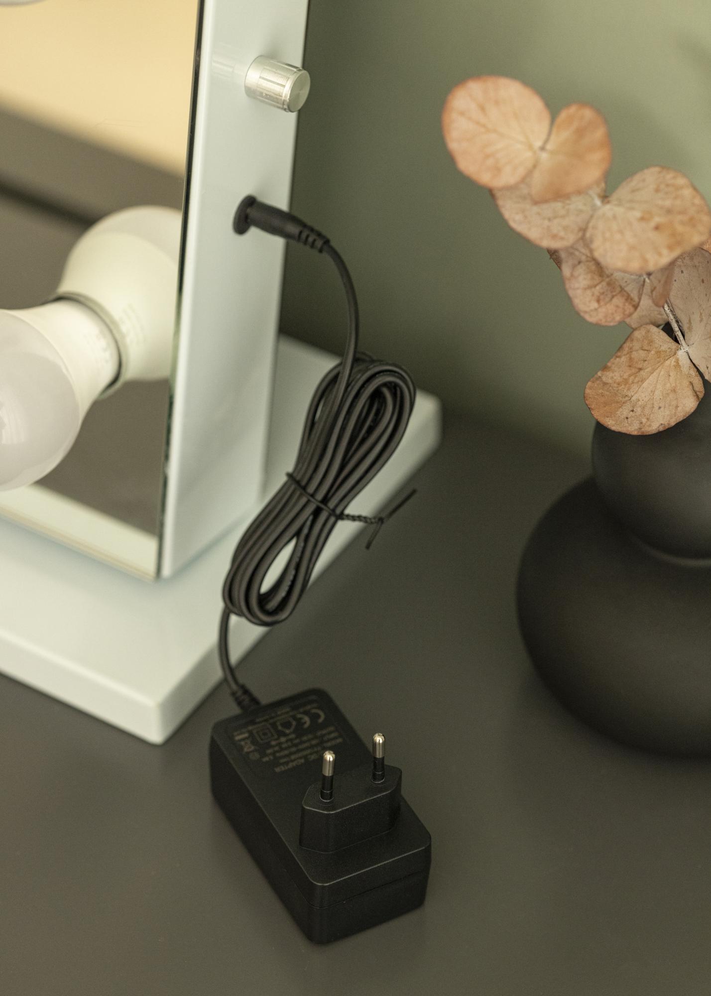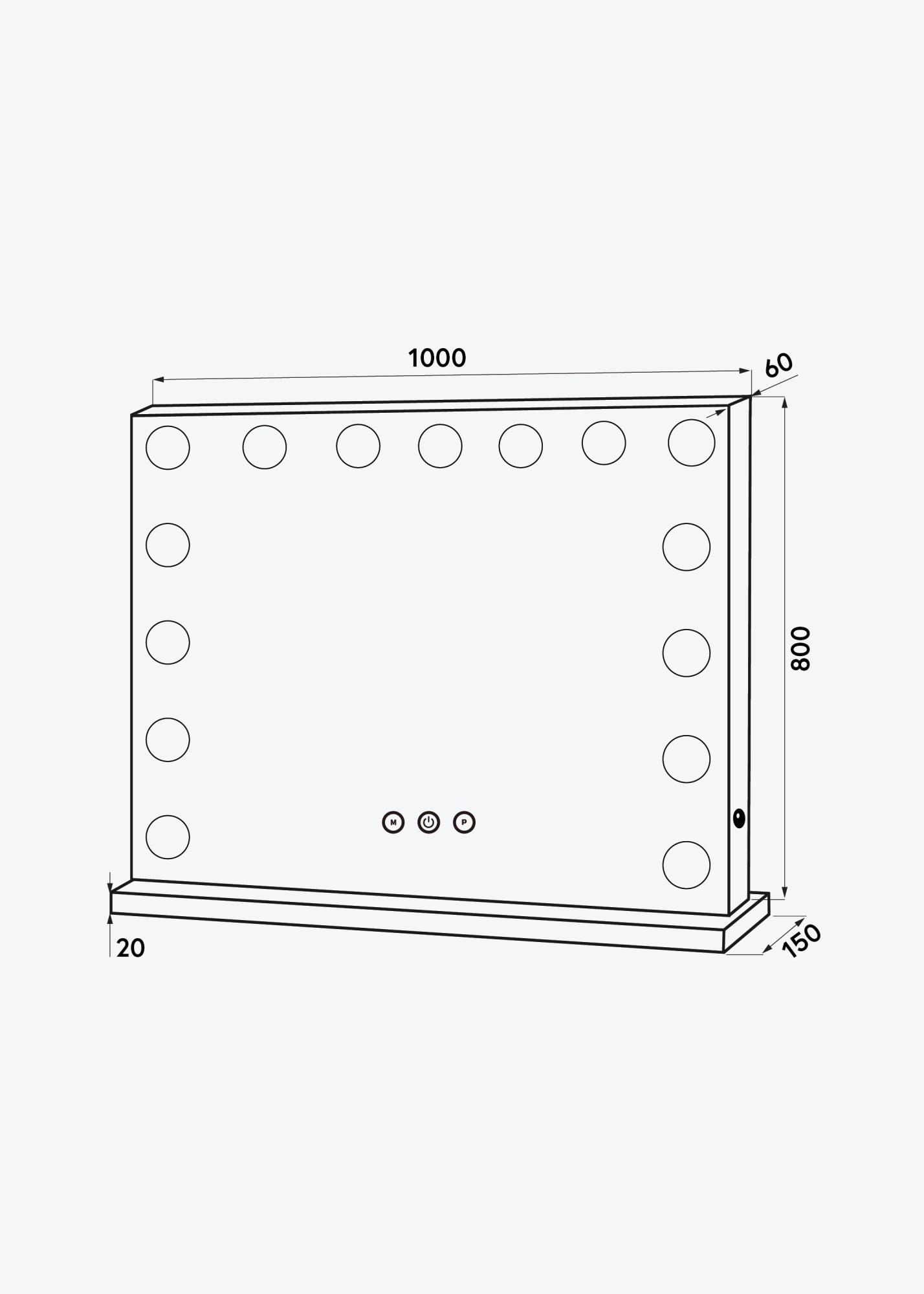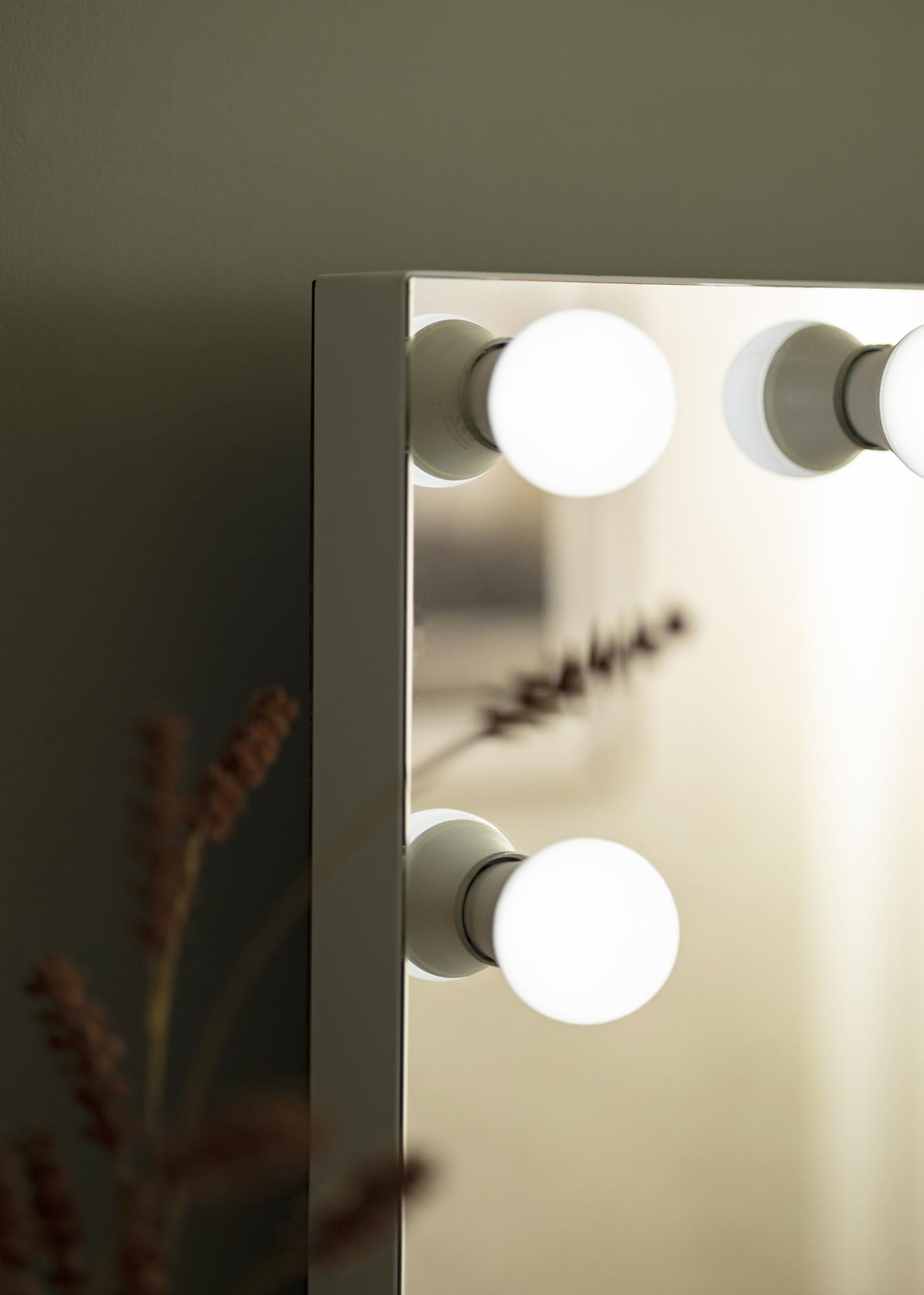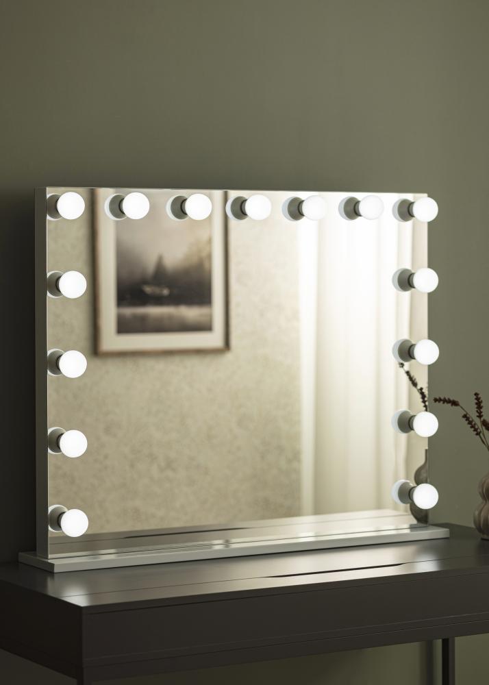 To Hollywood-navdihnjeno ličilno ogledalo bo dodalo pridih glamurja vašemu ličilnemu kotičku. Dizajn izžareva razkošje, zahvaljujoč veliki površini 100x80 cm in vgrajeni osvetlitvi, sestavljeni iz 15 žarnic, ki obkrožajo robove ogledala. Žarnice imajo podnožje E27 in jih je mogoče po potrebi zamenjati. Ogledalo je mogoče postaviti v stoječi položaj, kar ga naredi odlično za postavitev na komodo v spalnici, omaro v dnevni sobi ali katero koli drugo sobo, kjer želite elegantno ogledalo. Če želite ogledalo namestiti na steno, lahko odstranite nogo.