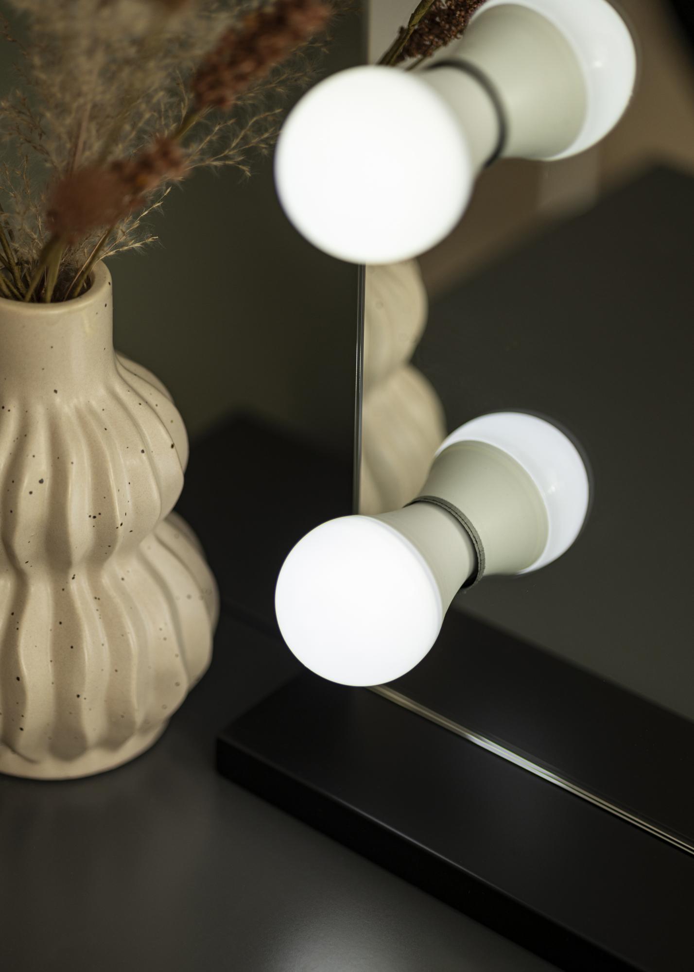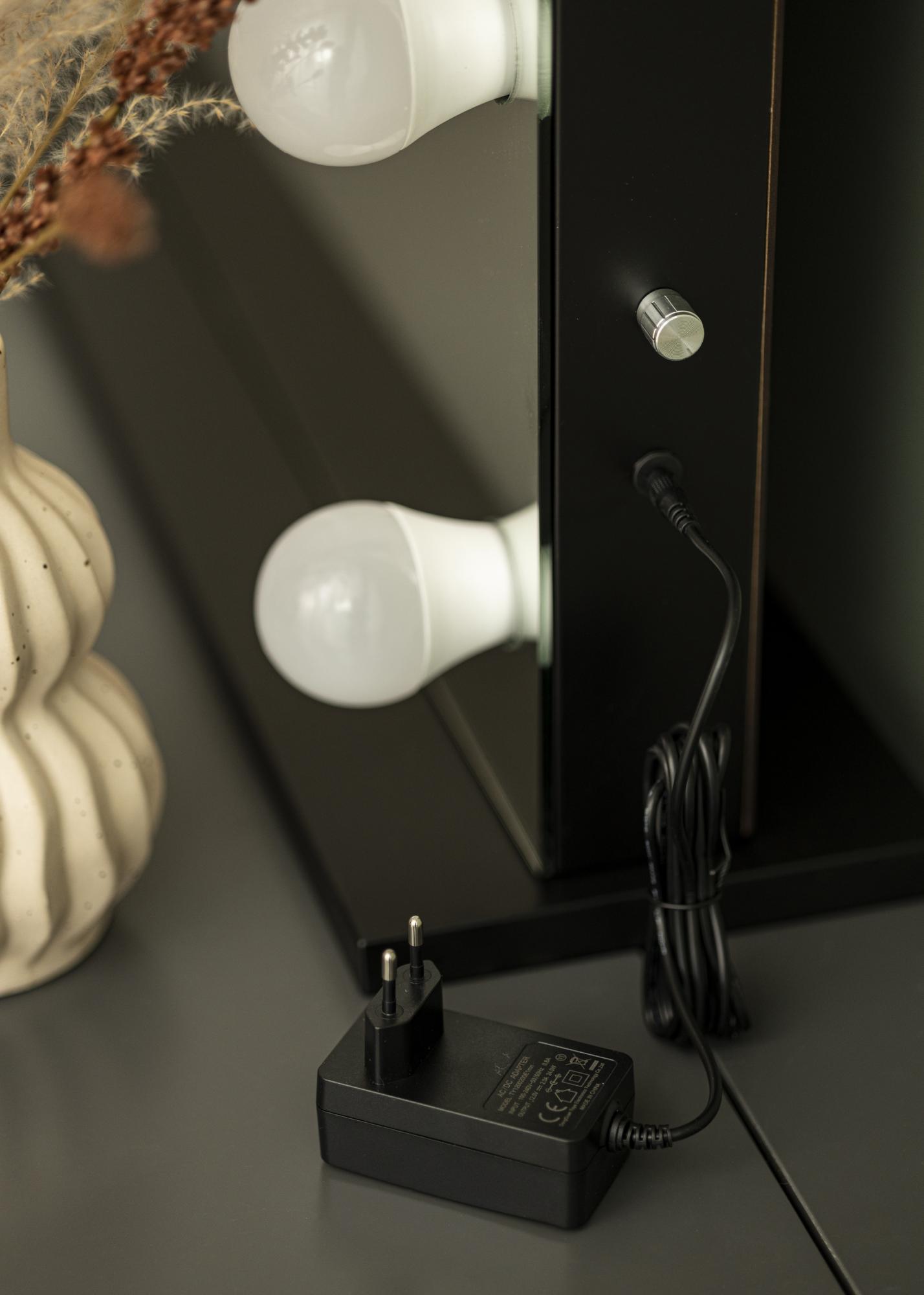 Z večjim ogledalom za ličenje lahko dodate slog in funkcionalnost v spalnico ali dnevno sobo. To ogledalo ima površino, ki meri kar 100x80 cm, ki je lepo obrobljena s 15 žarnicami z grlom modela E27. Elegantna zasnova v klasični pravokotni obliki z lučmi vzdolž stranic ogledala spominja na glamurozni Hollywood. Žarnice oddajajo hladno belo svetlobo. Osvetlitev je mogoče enostavno prilagoditi na želeno svetlost s pomočjo gumba za vrtenje na eni strani ogledala.