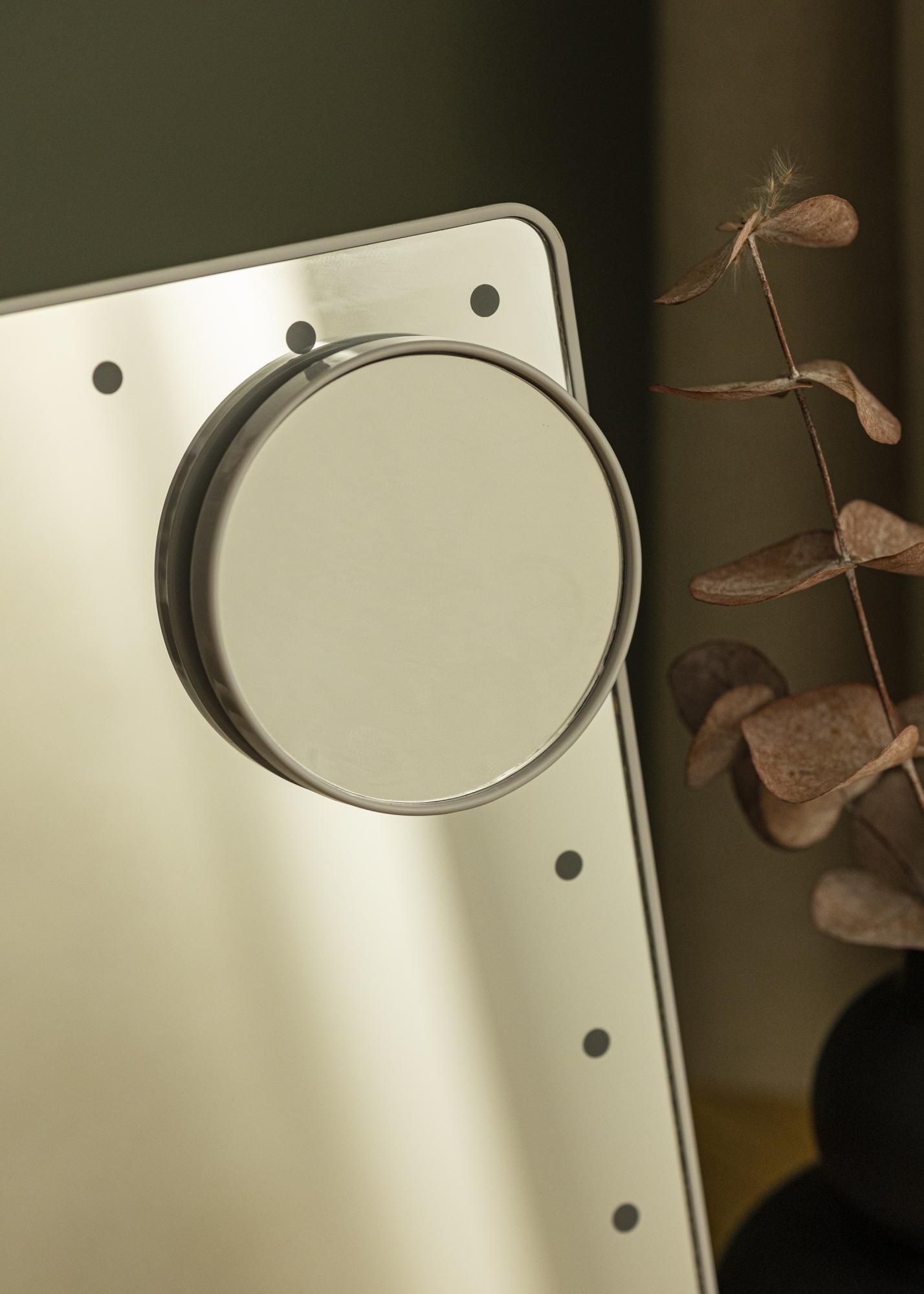 Ogledalo ima kompaktno velikost z ogledalno površino 16,5x25 cm, kar omogoča, da ga enostavno premikaš. Ogledalna površina se lahko obrača in nagiba, da lahko nastaviš kot, ki ti ustreza. Priloženo je manjše ogledalo z 2x in 3x povečavo, ki se lahko uporablja samostojno ali pritrdi na steklo večjega ogledala. To ličilno ogledalo ima tudi vgrajeno LED osvetlitev, ki daje hladno belo svetlobo na tvoj obraz, ko se ogleduješ. Osvetlitev se lahko vklopi in izklopi preko stikala na zadnji strani ogledala, prav tako pa imaš možnost zatemnjevanja svetlobe. Ogledalo je napajano z vgrajeno baterijo, ki se polni preko USB priključka. Kabel za polnjenje je priložen.