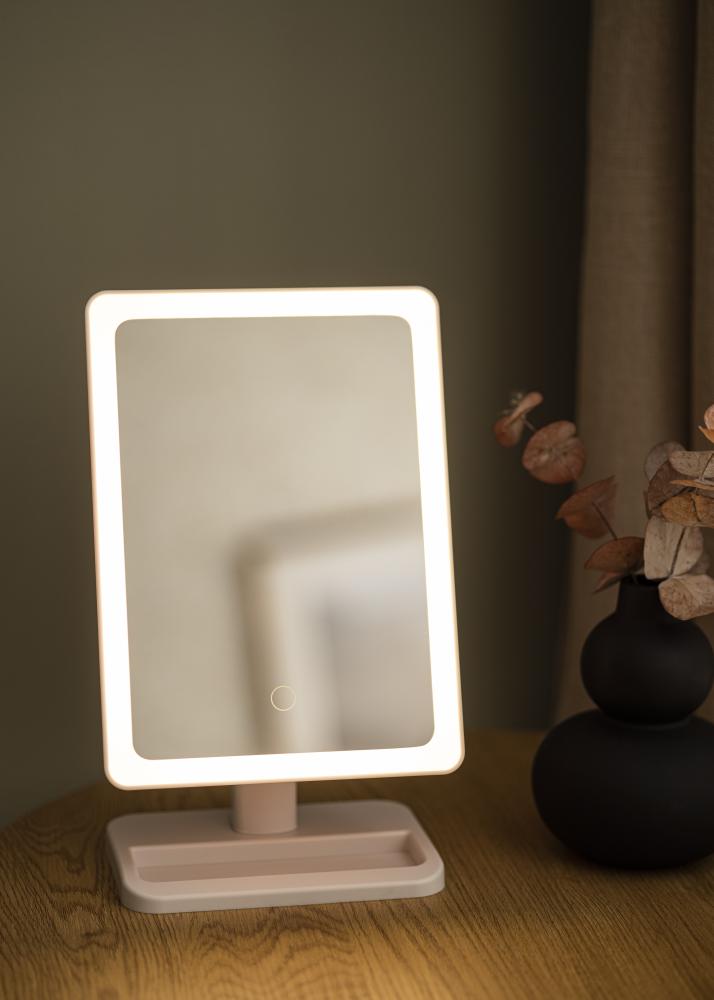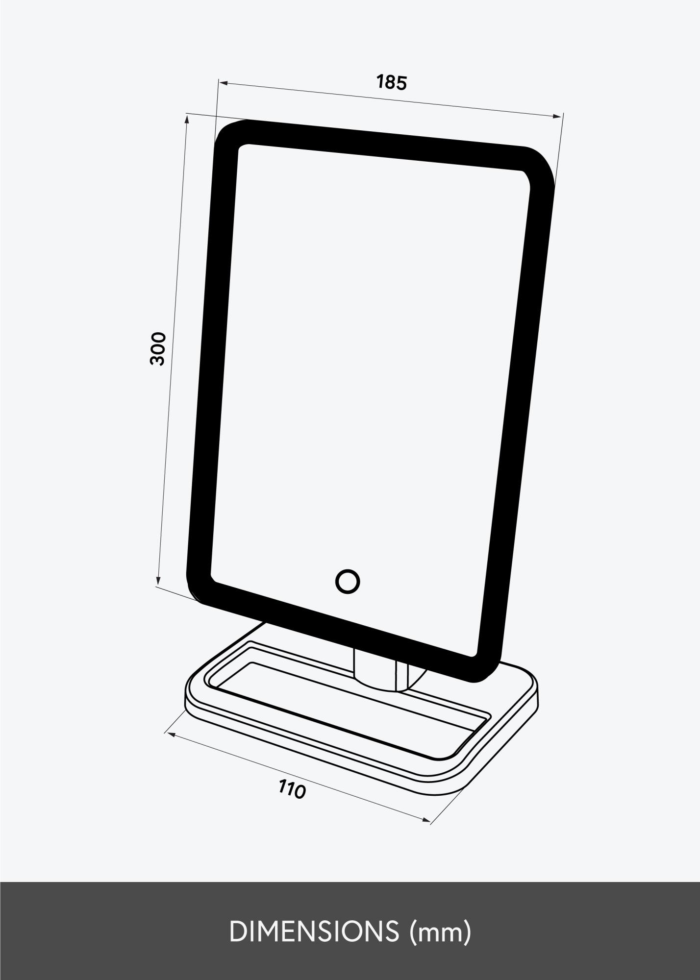 Ogledalo ima eleganten videz z nevtralno belo barvo in LED trakom, ki obdaja površino ogledala velikosti 16,5x25 cm. Osvetlitev je mogoče zatemniti s pritiskom na gumb na površini ogledala za nekaj sekund. Na ta način lahko nastavite svetlost, ki vam najbolj ustreza. Pametna zasnova ogledala omogoča, da zavrtite in nagnete površino ogledala, kot želite, in lahka teža omogoča enostavno premikanje. Priloženo je manjše ogledalo z 10-kratno povečavo. To je popolno, kadar želite podrobno ogledati del svojega obraza. Ogledalo napaja vgrajena baterija, ki se polni preko priloženega polnilnega kabla.