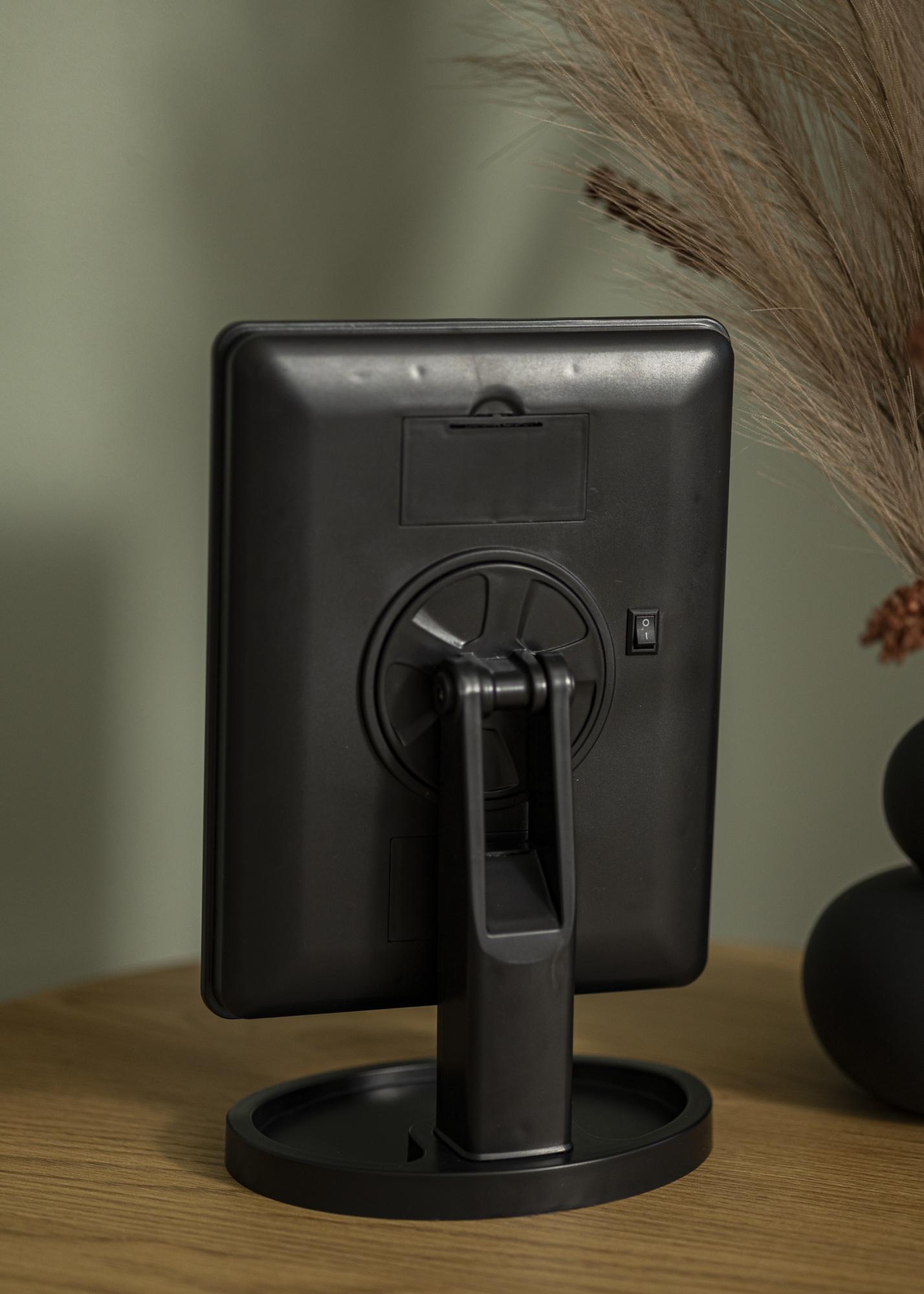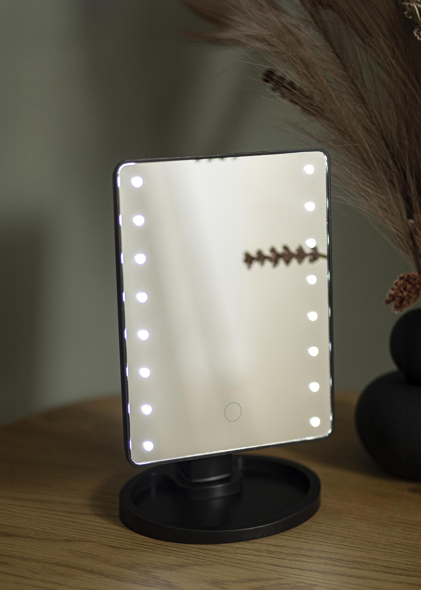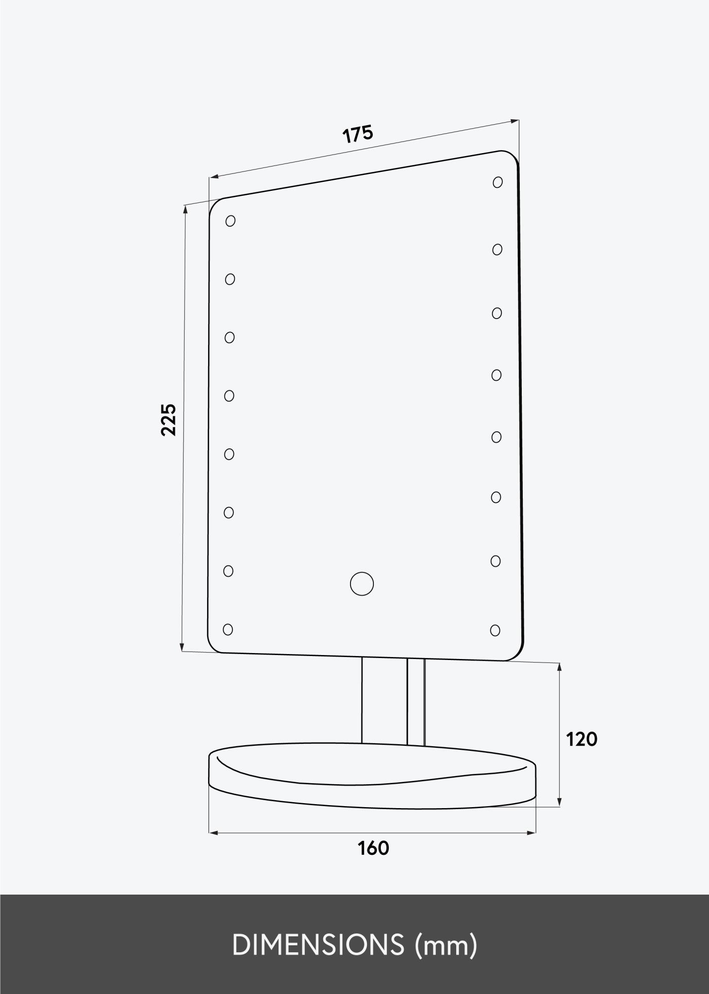 To je priročno ličilno ogledalo na stojalu, opremljeno z integrirano LED-osvetlitvijo, ki obdaja površino ogledala 17,5x22,5 cm. Elegantna zasnova z nevtralno črno barvo naredi ogledalo lep dekorativni element, ki se dobro poda v vsak prostor. Ogledalo je mogoče nagibati, kar je odlično, ko želite nanesti ličila in se pripraviti na dan. Prenosna oblika omogoča, da je ogledalo tudi enostavno za prenašanje.
