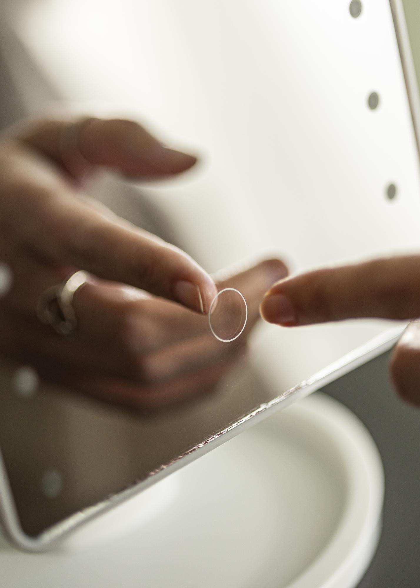 Ogledalo ima LED-osvetlitev. Dve prednosti LED-osvetlitve sta, da je energetsko varčen vir svetlobe z dolgo življenjsko dobo. Ogledalo se prižge z gumbom za vklop/izklop na zadnji strani ogledala. Nato imate možnost zatemniti svetlobo, kot želite. To enostavno storite tako, da nekaj sekund držite gumb na dotik na sprednji strani ogledala.