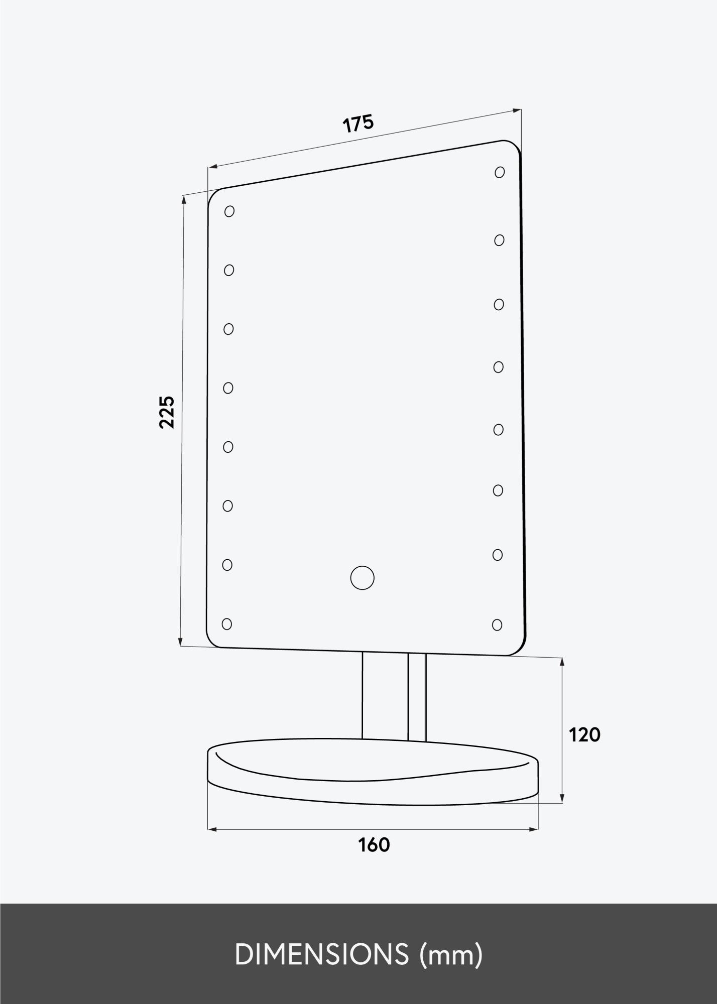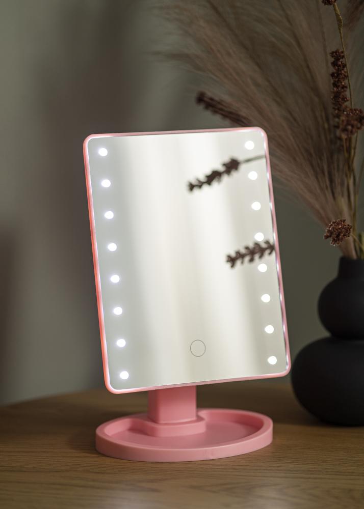 To zrcalo za ličenje je odlična izbira za tiste, ki želijo imeti manjše zrcalo v elegantnem modelu. Rožnata odtenek je čudovit barvni dodatek, medtem ko integrirana LED osvetlitev nudi enakomerno, hladno belo svetlobo, ko se ogledate. Zrcalo vklopite z gumbom za vklop na zadnji strani naprave. Osvetlitev je mogoče tudi zatemniti, tako da lahko nastavite svetlost, ki vam ustreza. Za zatemnitev svetlobe se dotaknite gumba na sprednji strani.