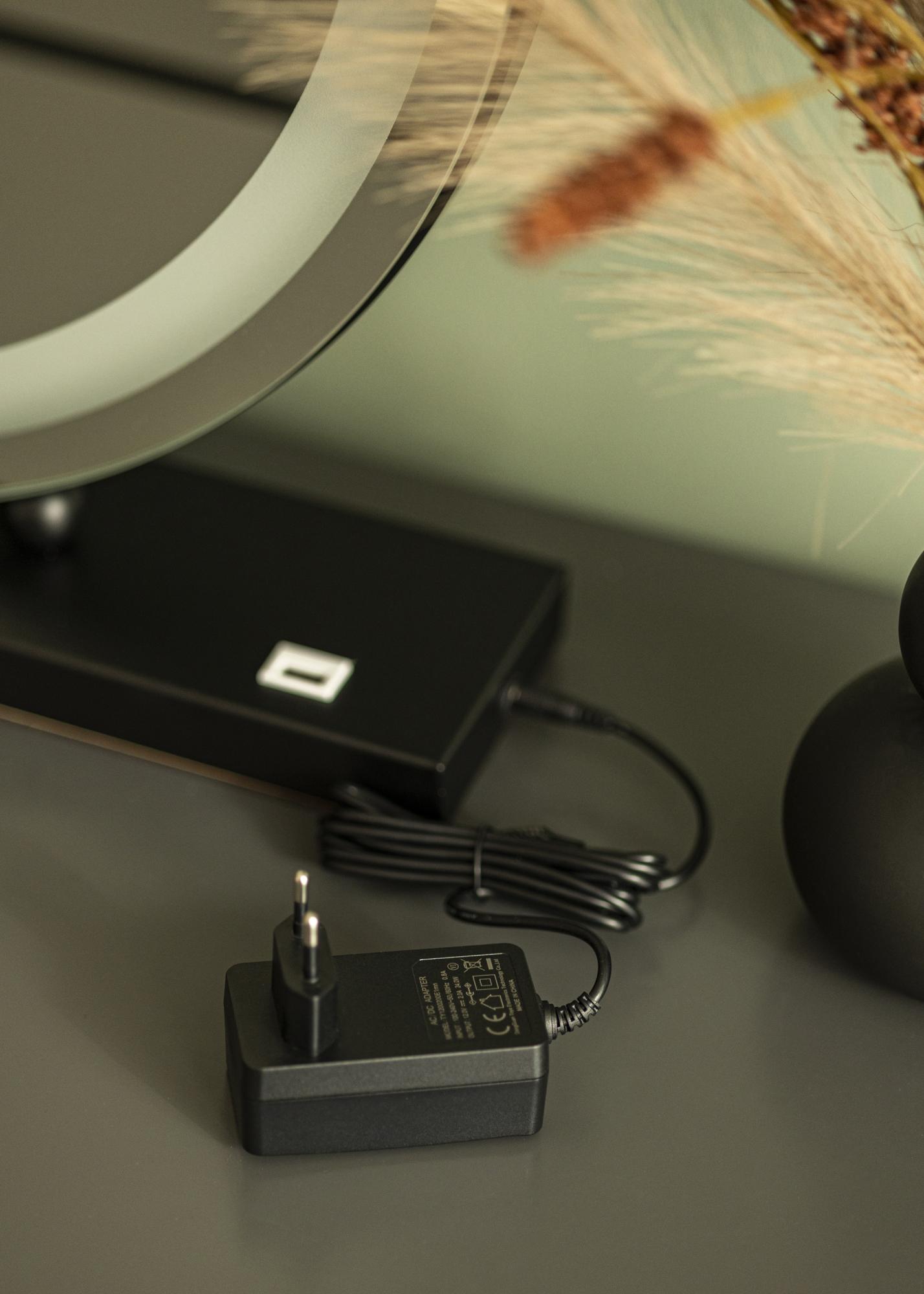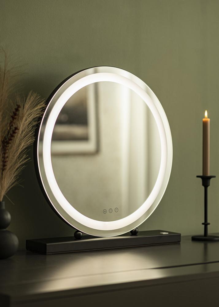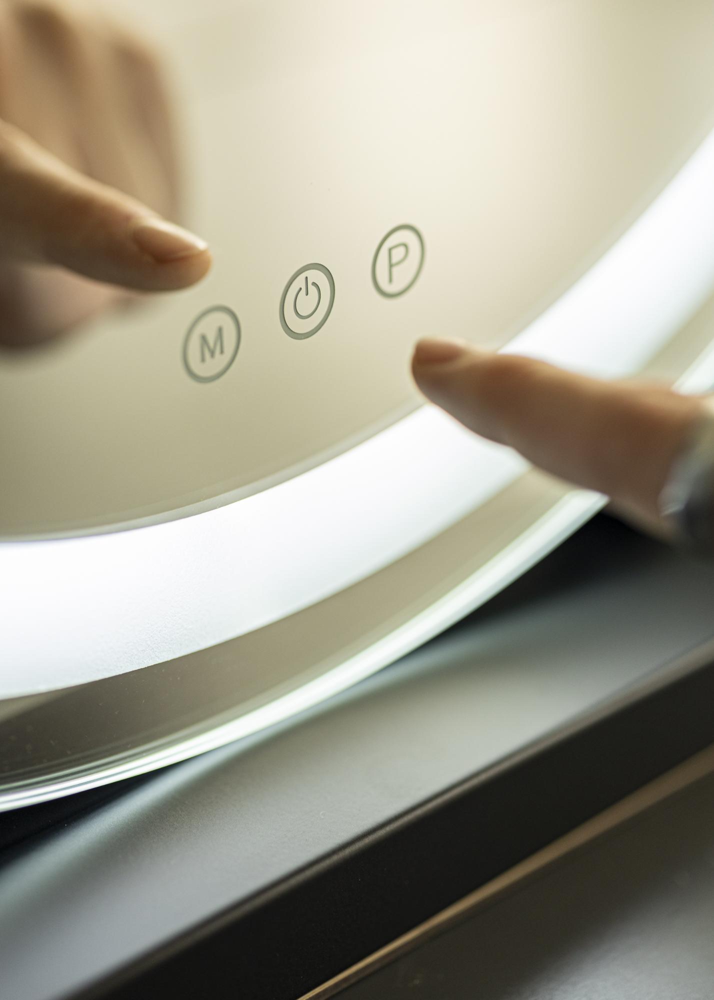 To je lično ogledalo v pokončnem modelu, s stojalom v nevtralni črni barvi, ki jo je mogoče preprosto ujemati s preostalim delom notranje opreme. Površina ogledala ima klasično okroglo obliko s premerom 50 cm, ki je lepo uokvirjena z integriranim LED trakom. Na spodnjem robu površine ogledala so trije gumbki na dotik - gumb za vklop/izklop, ki prižge in ugasne osvetlitev, gumb "M" za prilagajanje barvne temperature svetlobe in gumb "P", ki omogoča zatemnitev svetilnosti osvetlitve po želji. Električna povezava je izvedena z vtičem.