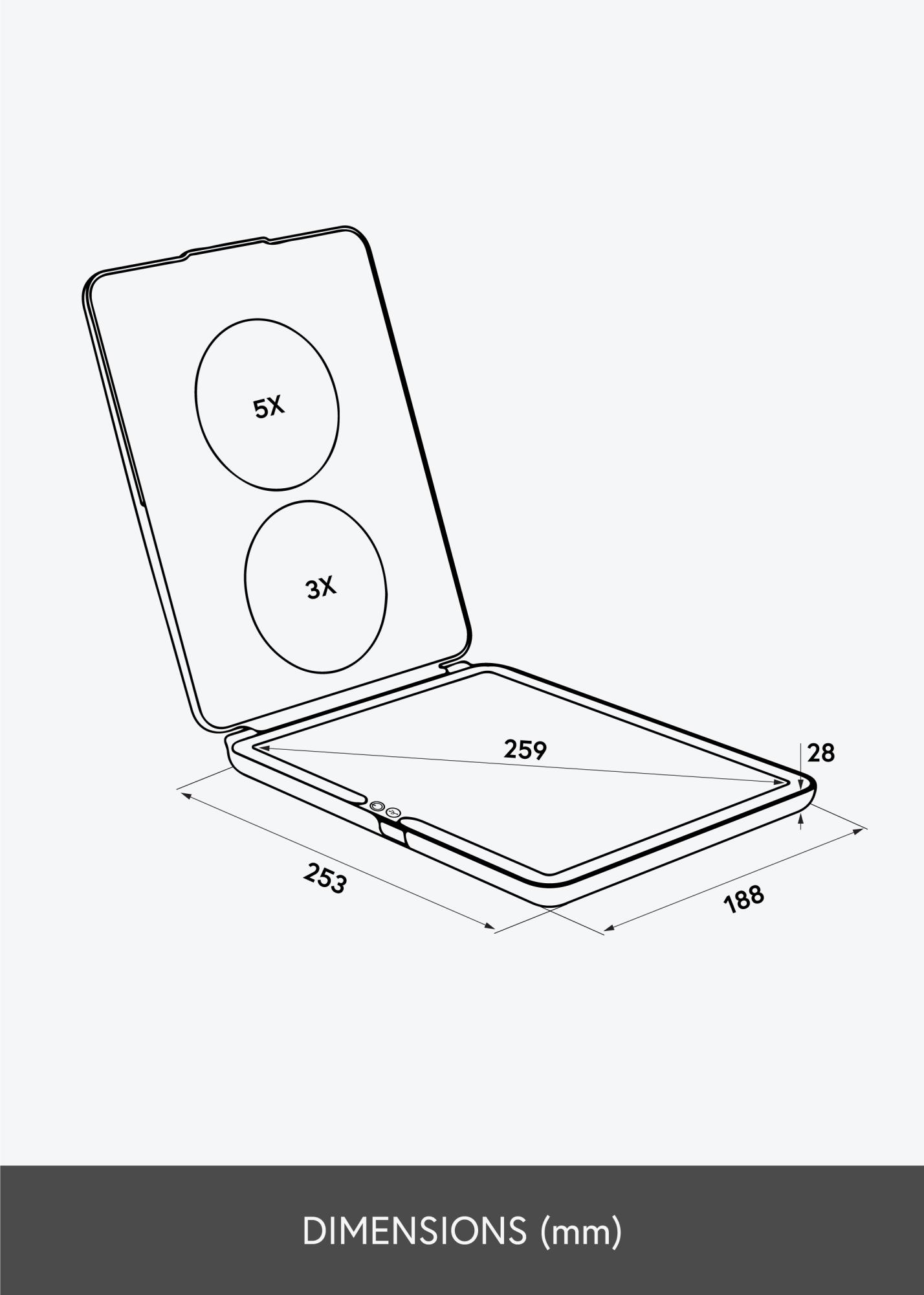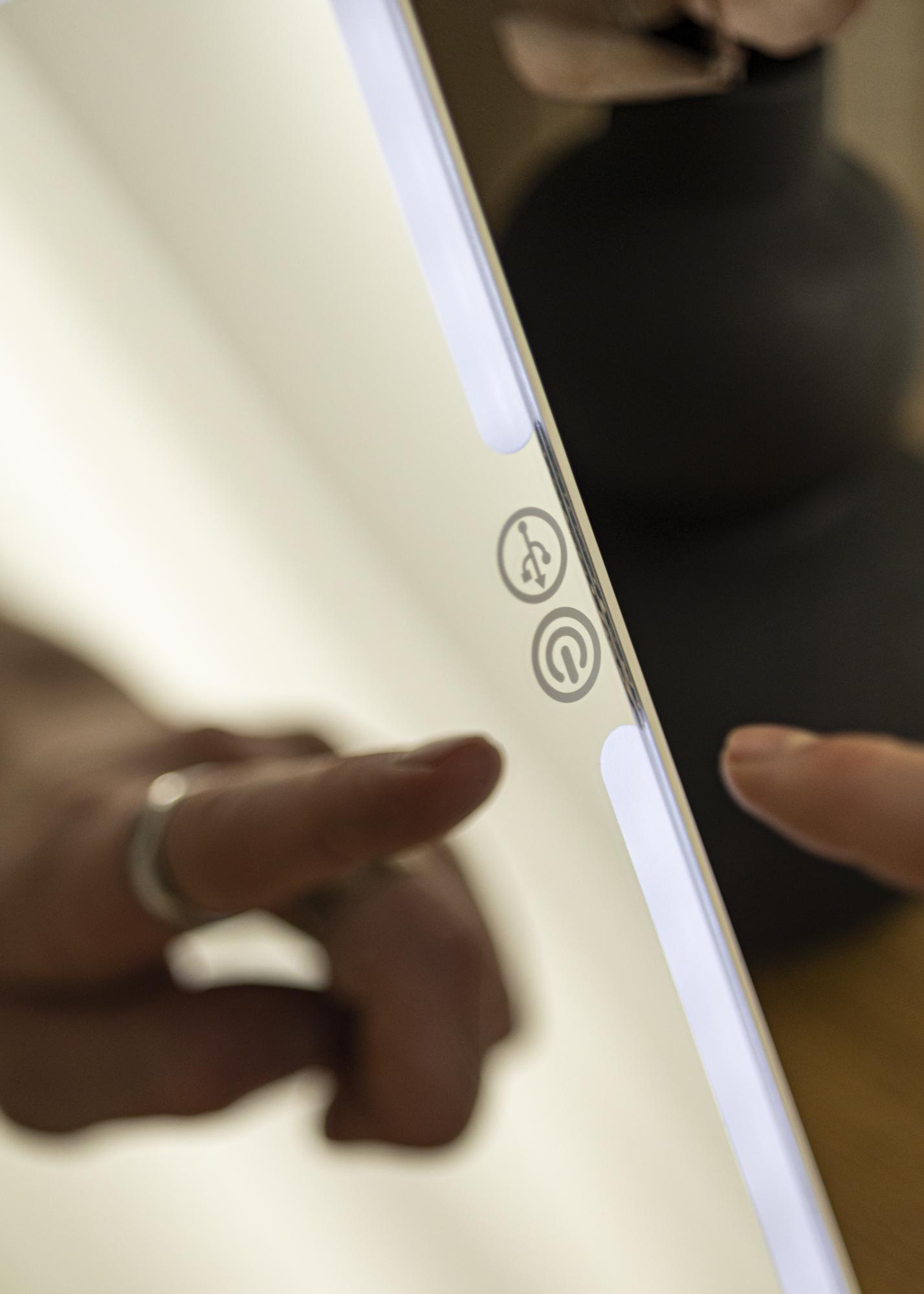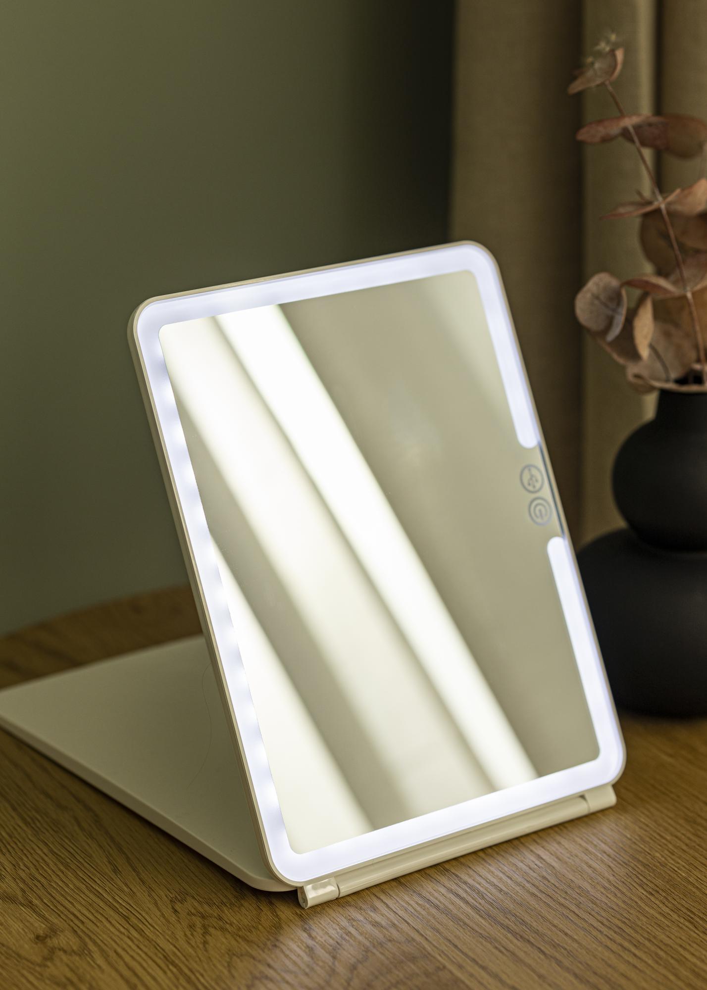 To je manjše kozmetično ogledalo s pametno zložljivo zasnovo, ki omogoča enostavno nagibanje ogledala med uporabo. Zložljiva zasnova prihrani tudi prostor in zaščiti površino ogledala, ko je ogledalo v torbici. To je odlično ogledalo, ki ga imate pri sebi, ko potujete, saj je tako kompaktno, lahko in ima vgrajeno osvetlitev, ki zagotavlja enakomerno svetlobo na vaš obraz, ko si ogledate. Osvetlitev se vklopi in izklopi s pomočjo tipke na dotik ob okvirju ogledala. Če nekaj sekund držite tipko, lahko zatemnite svetlobo in nastavite barvno temperaturo.