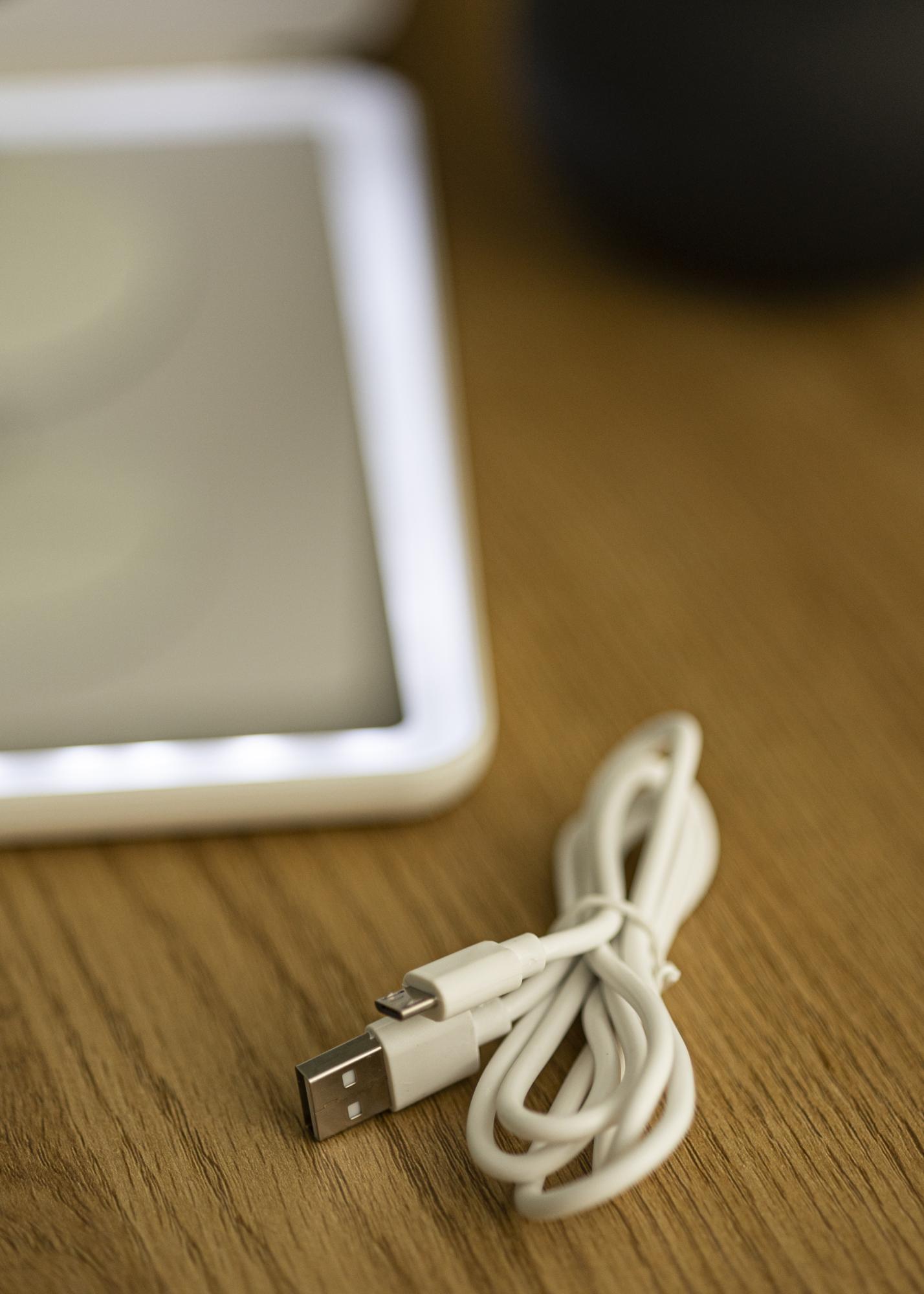 Ko je prižgano ogledalo zloženo, se samodejno preklopi v način varčevanja z energijo, dokler ogledala ne odprete znova. To kozmetično ogledalo deluje na baterije in se polni prek USB-povezave.