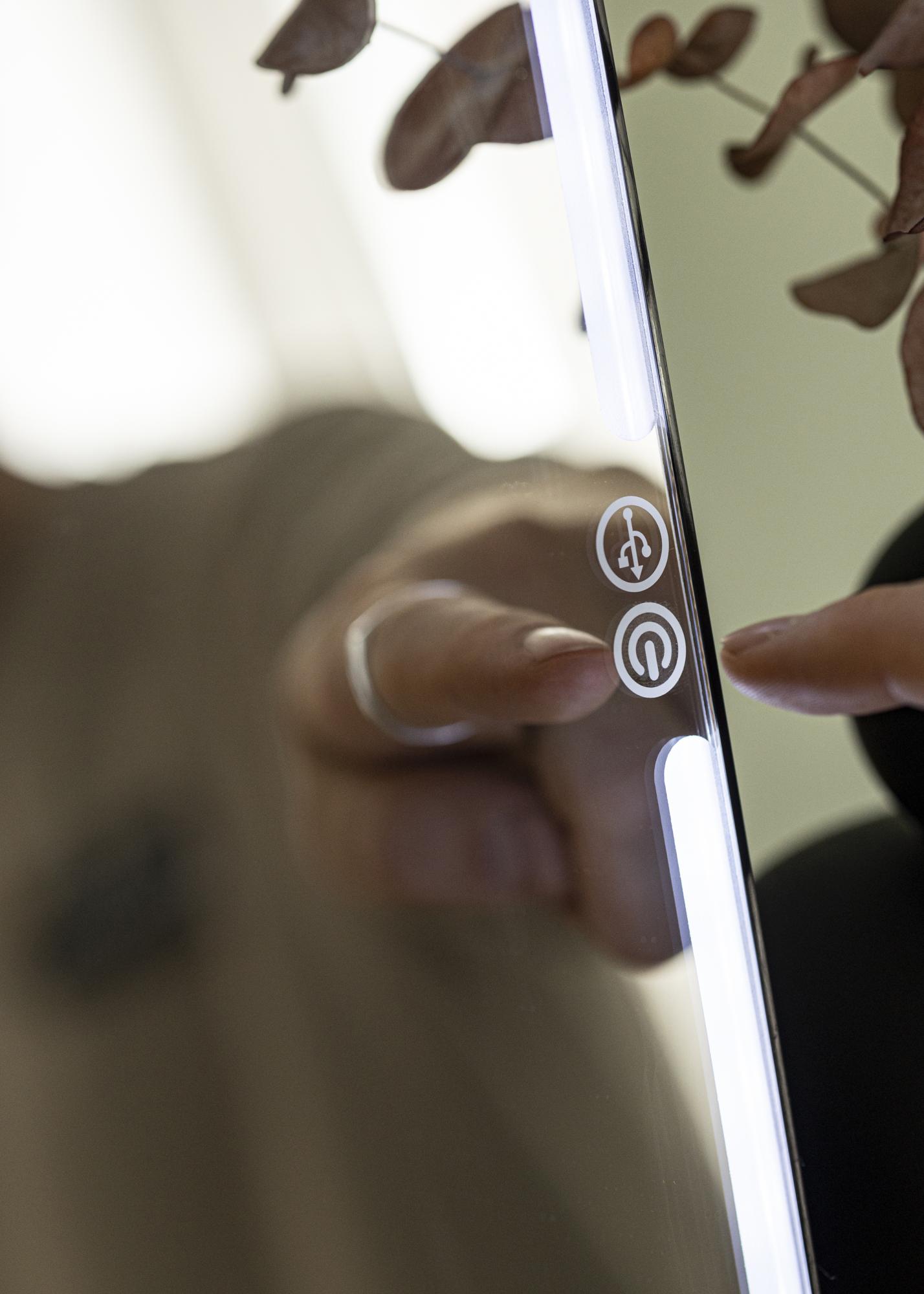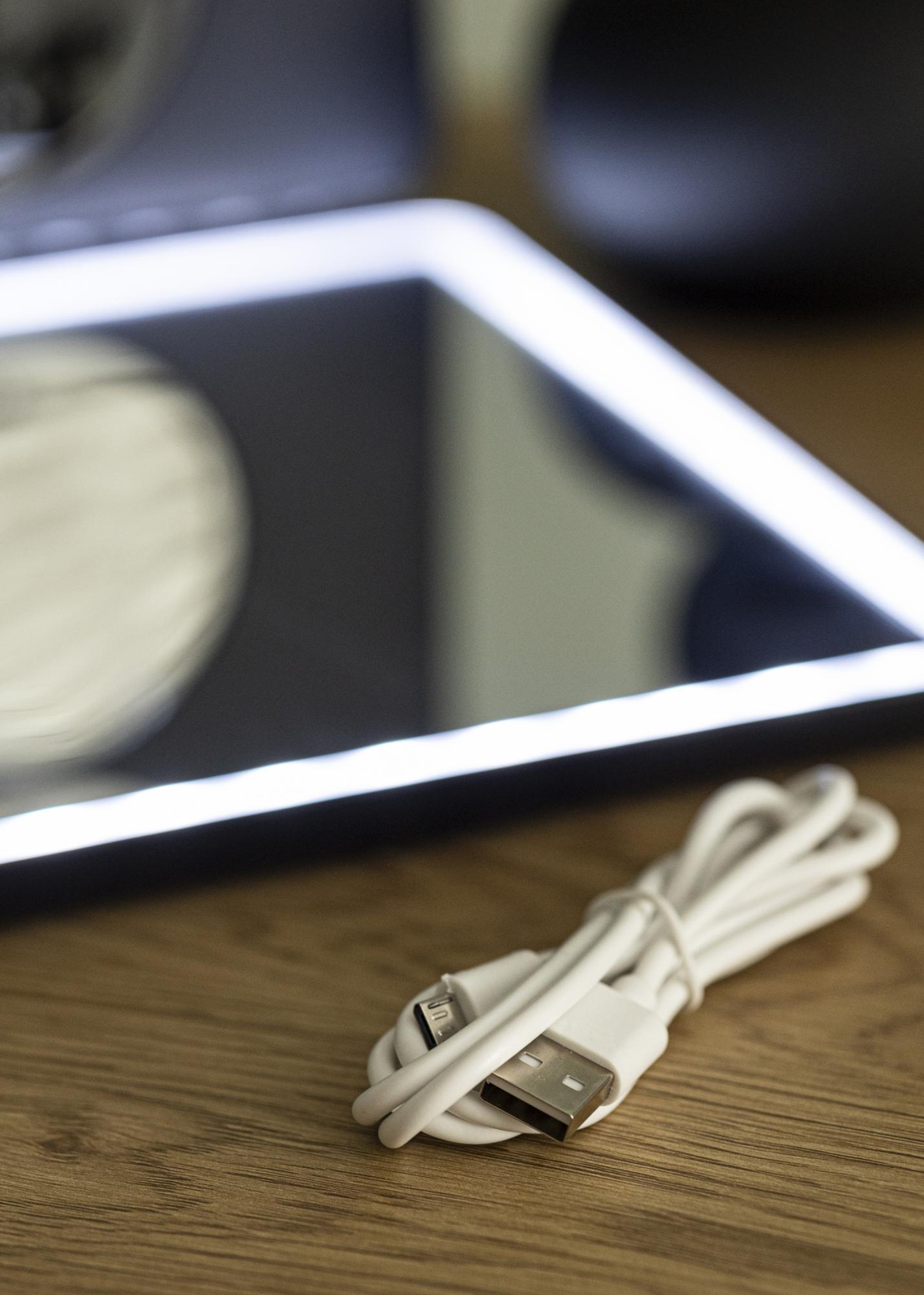 To kozmetično ogledalo ima elegantno črno barvo in vgrajeno LED-osvetlitev. Osvetlitev se prilagaja s pomočjo dotikalnih gumbov ob okvirju ogledala, s katerimi tudi vklopite in izklopite ogledalo. Ko zaprete ogledalo v vklopljenem stanju, se samodejno preklopi v način varčevanja z energijo, da znova zasveti, ko ogledalo ponovno odprete. Ogledalo deluje na baterije in se polni prek USB-povezave.