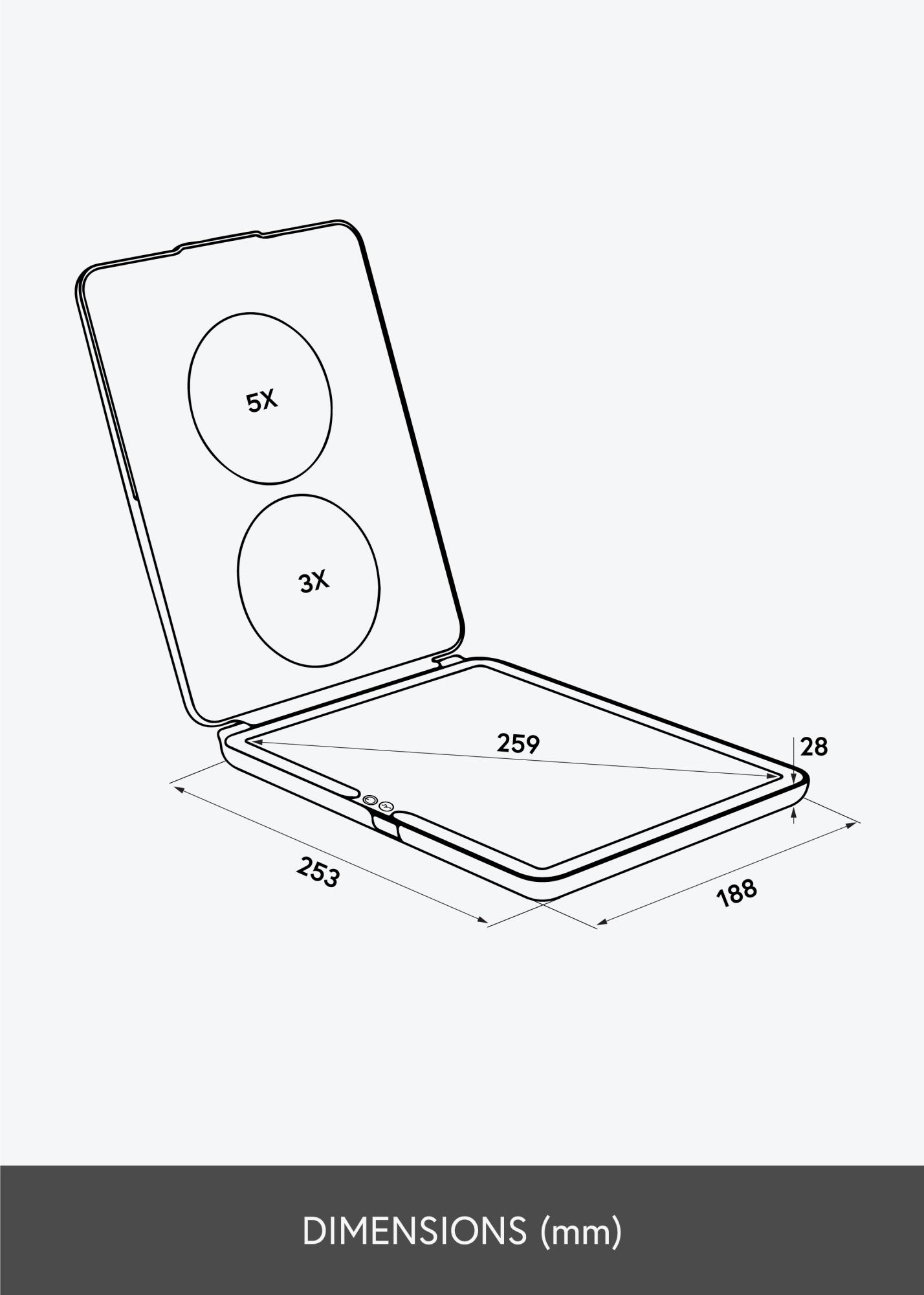 Želite li imeti kozmetično ogledalo v potovalni velikosti, ki se popolnoma prilega torbici? Potem je to kompaktno kozmetično ogledalo prava izbira! Ogledalo ima površino 18,5x25 cm in zložljivo zasnovo, ki ščiti ogledalo pred umazanijo in prahom. Zložljiva zasnova omogoča tudi nagibanje ogledala med uporabo. Poleg običajnega ogledalnega stekla ima ogledalo območje s 5-kratno povečavo in območje s 3-kratno povečavo.