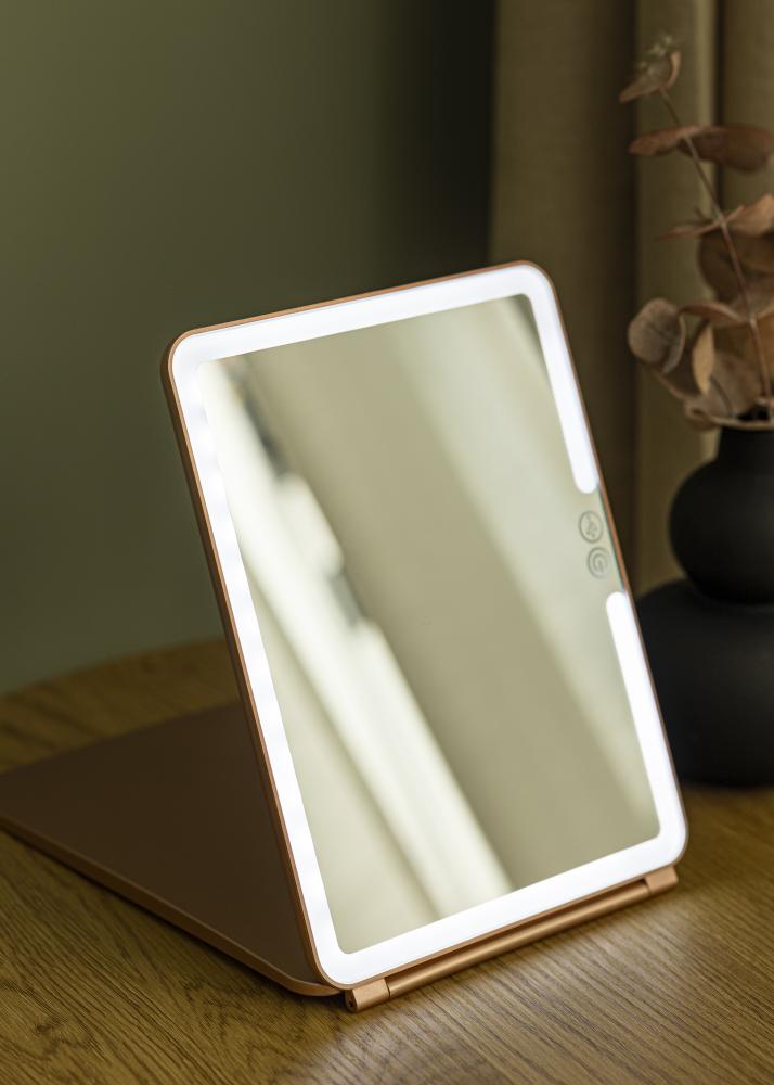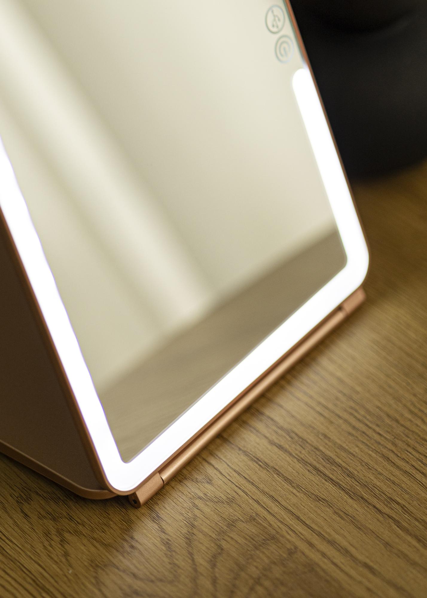 To je ogledalo za ličenje, ki je popolno za uporabo na poti, zahvaljujoč svojemu kompaktni obliki, zložljivemu dizajnu in vgrajeni LED-osvetlitvi. Ima moderno odtenek v rose zlatu. Ogledalo za ličenje se zlahka prilega v vašo torbo, tako za vsak dan kot ko potujete. Zložljiv dizajn ščiti površino ogledala pred praskami in umazanijo ter vam omogoča prilagoditev ogledala v želeni položaj. Ogledalo je opremljeno z običajnim ogledalnim steklom in dvema manjšima ogledalnima površinama; eno s 5x povečanjem in eno s 3x povečanjem.