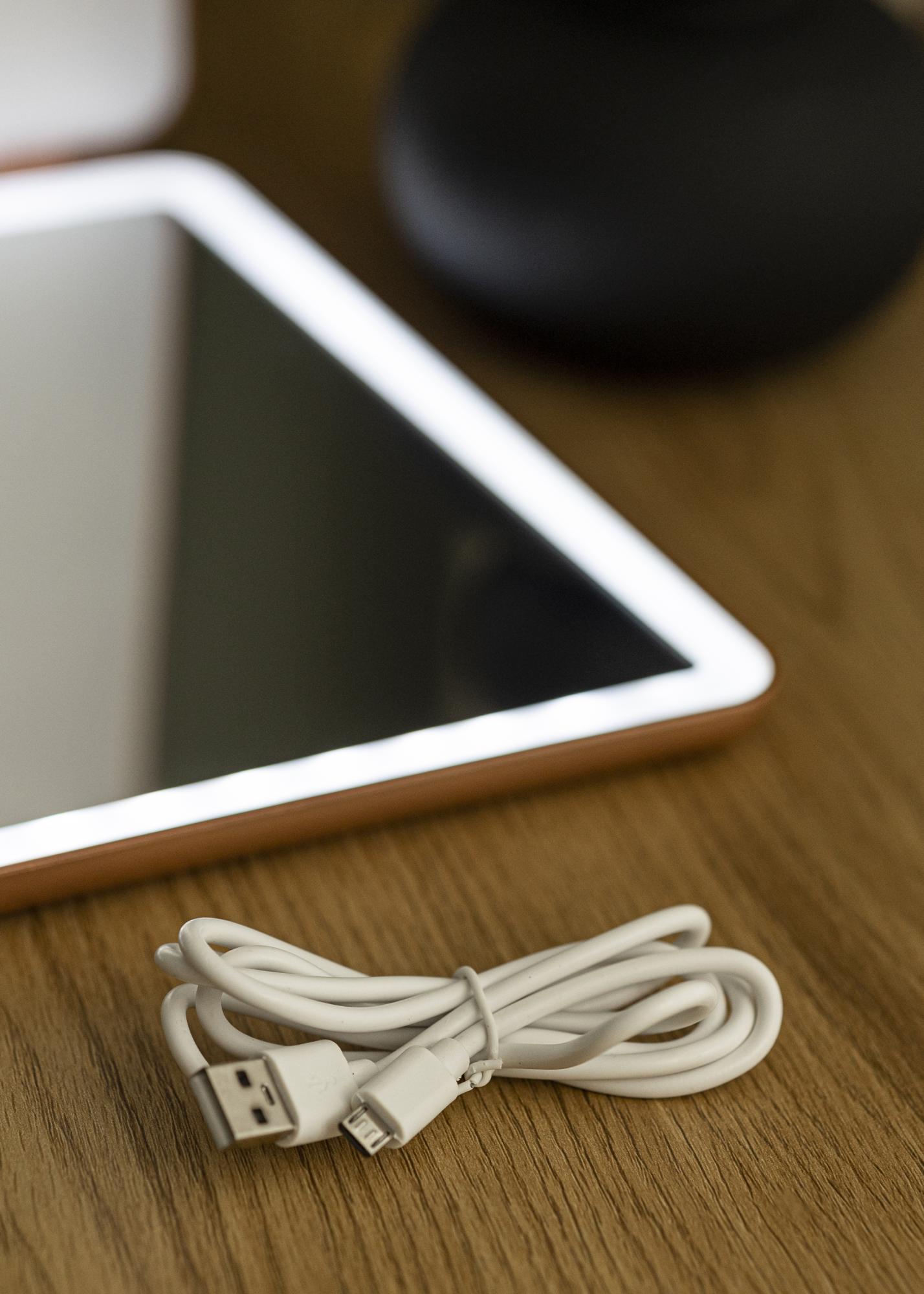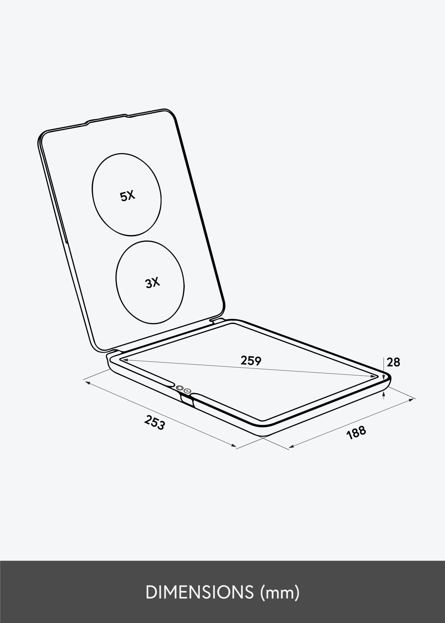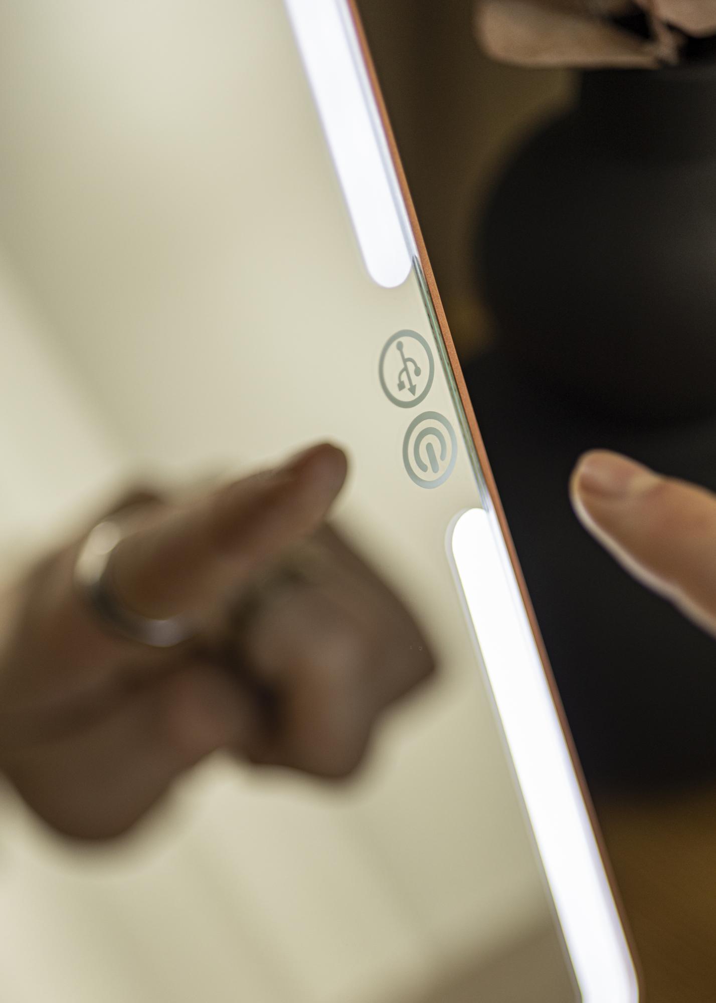 Vgrajen LED-pas nudi prijetno svetlobo med ogledovanjem. Osvetlitev napaja vgrajena baterija, ki se preprosto polni preko USB-povezave. Ogledalo je opremljeno z gumbom na dotik, ki se uporablja za vklop in izklop osvetlitve ter za zatemnitev svetlobe. Ko zložite ogledalo, medtem ko je prižgano, se samodejno preklopi v varčevanje z energijo in lučka se ugasne, dokler ogledala ponovno ne odprete.