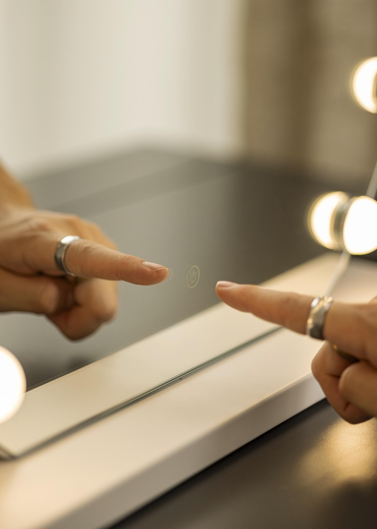 Doživite pridih hollywoodskega glamurja s tem kozmetičnim ogledalom z lučjo, ki na izvrsten način združuje eleganco in funkcionalnost. Kozmetično ogledalo ima svež bel odtenek in je opremljeno z 12 dekorativnimi LED žarnicami, ki oddajajo toplo belo svetlobo pri 3000K, kar ustvarja idealne pogoje za nanos ličil. Svetloba se aktivira in prilagaja z dotikom gumba, in ker uporablja LED tehnologijo, je energetsko učinkovita in zagotavlja naravno svetlobo.