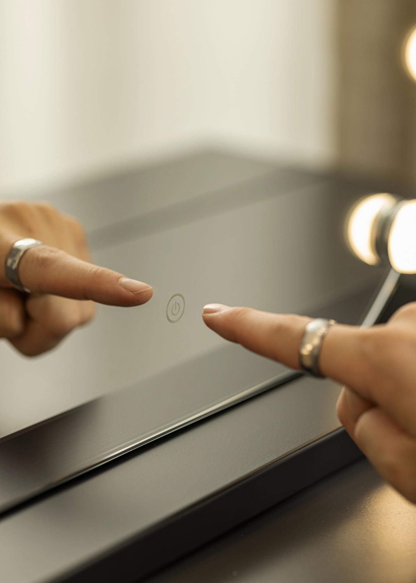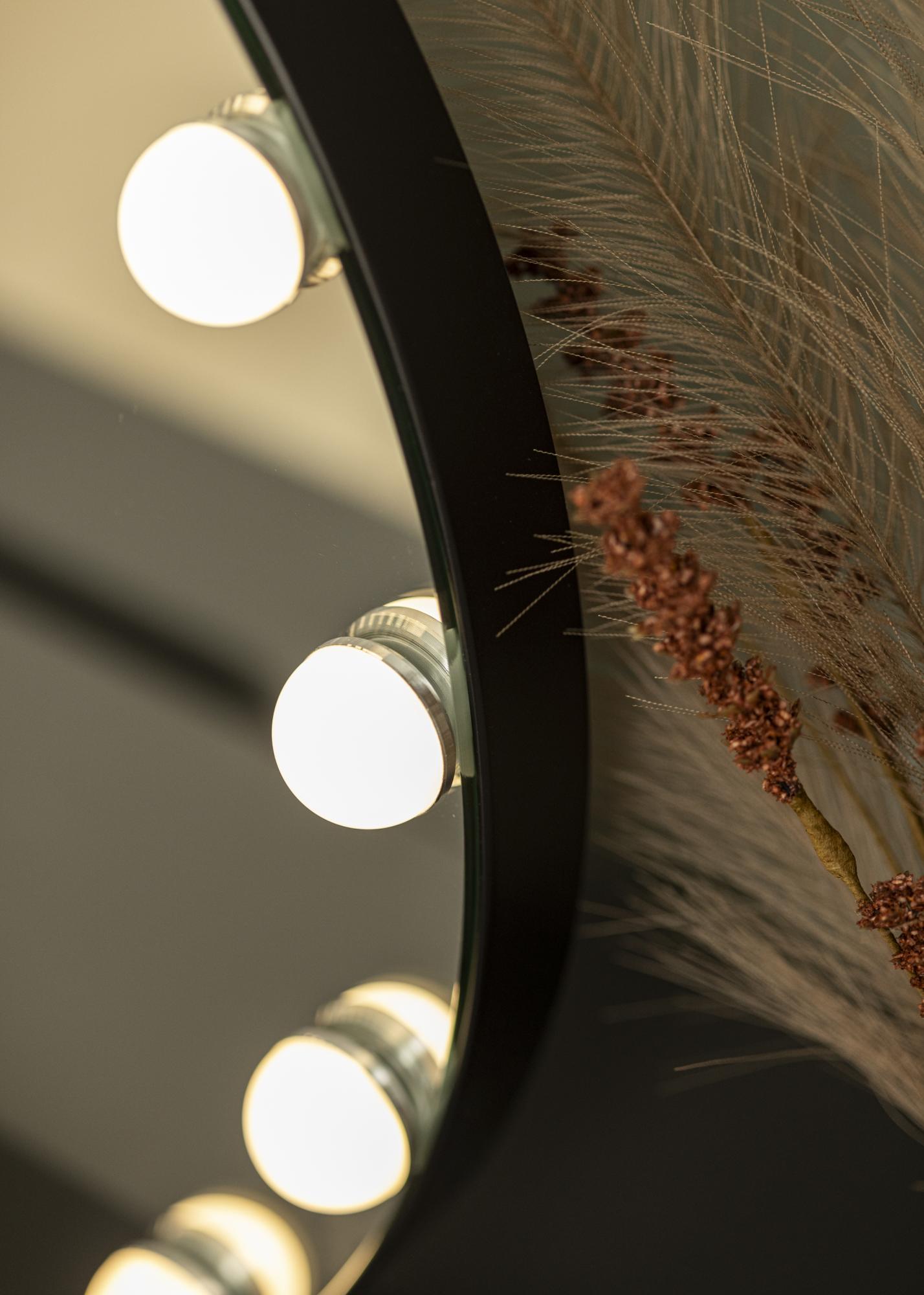 Doživite vrhunski občutek razkošja in hollywoodskega glamurja z našim ogledalom za ličenje z lučmi v elegantnem črnem odtenku. To ogledalo za ličenje je opremljeno z 12 dekorativnimi LED žarnicami, ki ustvarjajo enakomerno in toplo belo svetlobo pri 3000K, kar je optimalno za nanašanje ličil. Osvetlitev se aktivira z gumbom na dotik in jo je mogoče preprosto prilagoditi v moči z držanjem gumba. Poleg tega so LED žarnice energijsko varčne, kar zagotavlja trajnostno in naravno svetlobo. Naše ogledalo za ličenje združuje praktično funkcijo s trendovskim dizajnom, kar ga naredi za popoln dodatek vašemu domu, ne glede na to, ali gre za vašo sobo za ličenje ali spalnico.