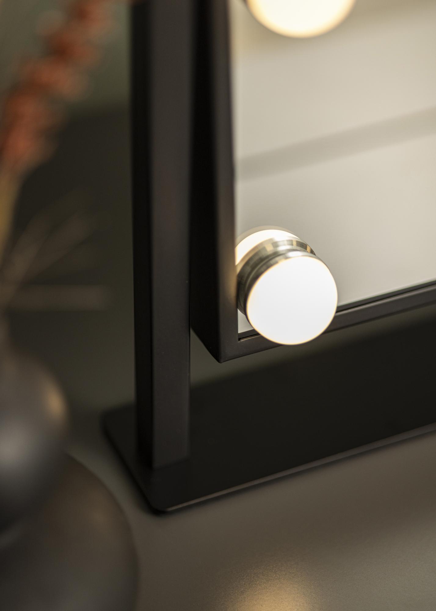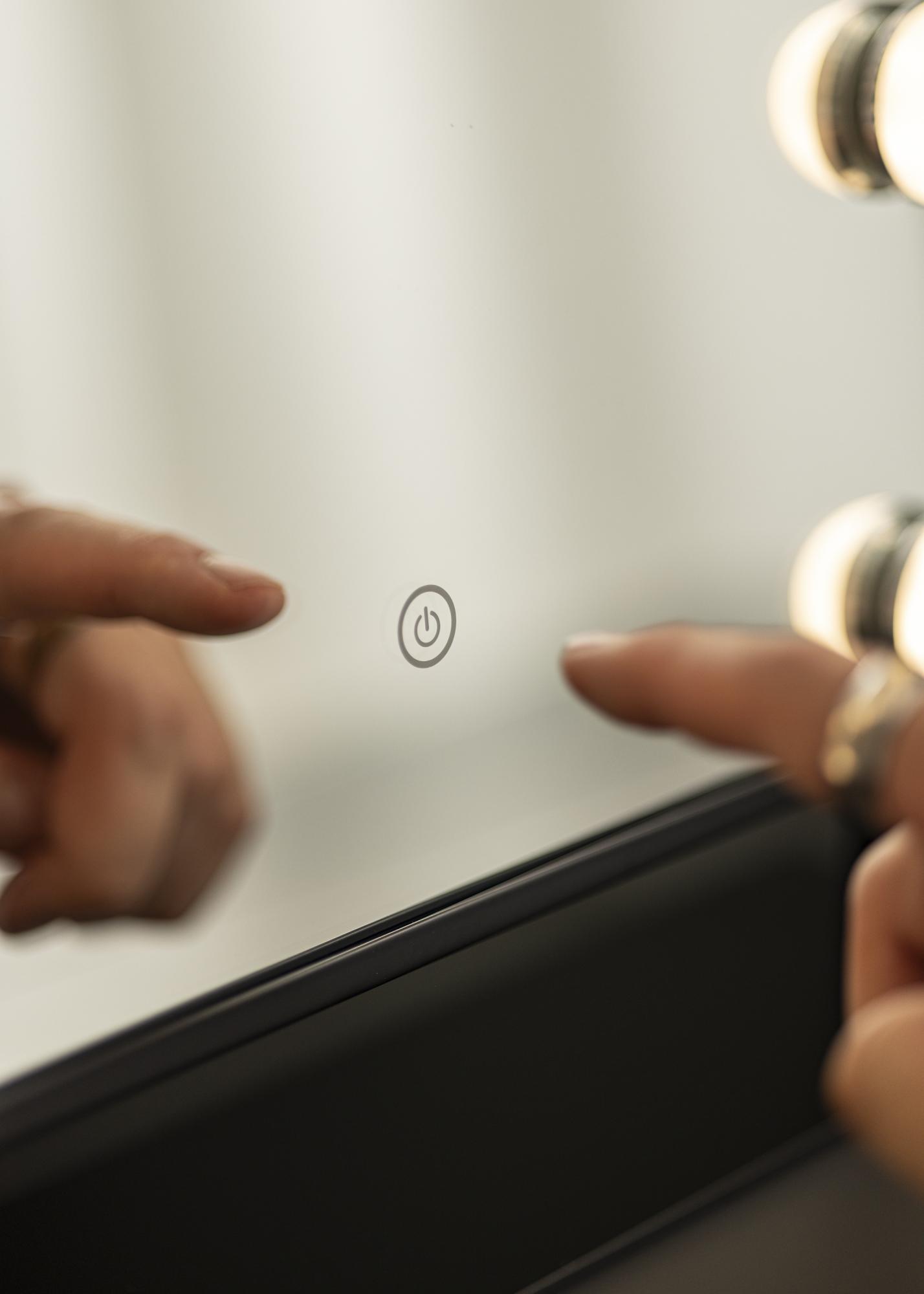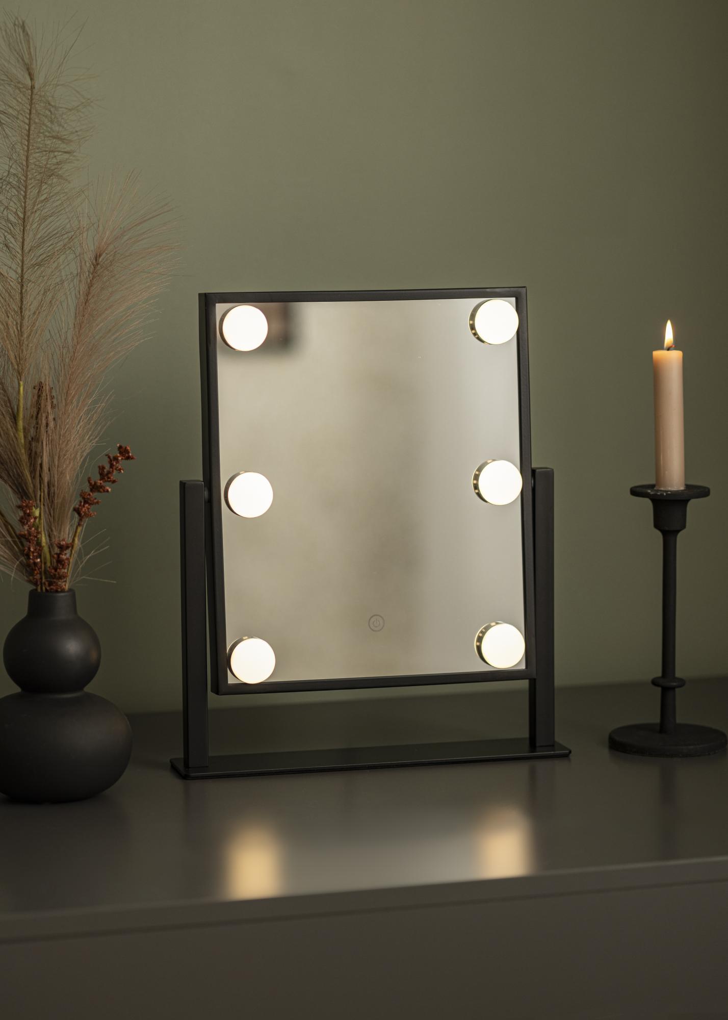 To je resnično luksuzno ogledalo za ličenje s šestimi dekorativnimi in zatemnljivimi LED žarnicami v trendovski črni barvi. Osvetlitev oddaja toplo belo svetlobo pri 3000K in se vklopi s pritiskom na gumb na dotik. Prilagodite jakost svetilk tako, da nekaj sekund držite gumb. LED je vir svetlobe, ki porabi manj energije, ima daljšo življenjsko dobo in nudi bolj naravno in enakomerno svetlobo. Ogledalo za ličenje je mogoče nagibati, tako da lahko svojo ličila nanesete natančneje. Poleg mnogih funkcij ima to ogledalo za ličenje pravi hollywoodski občutek in postane eleganten detajl v domu!