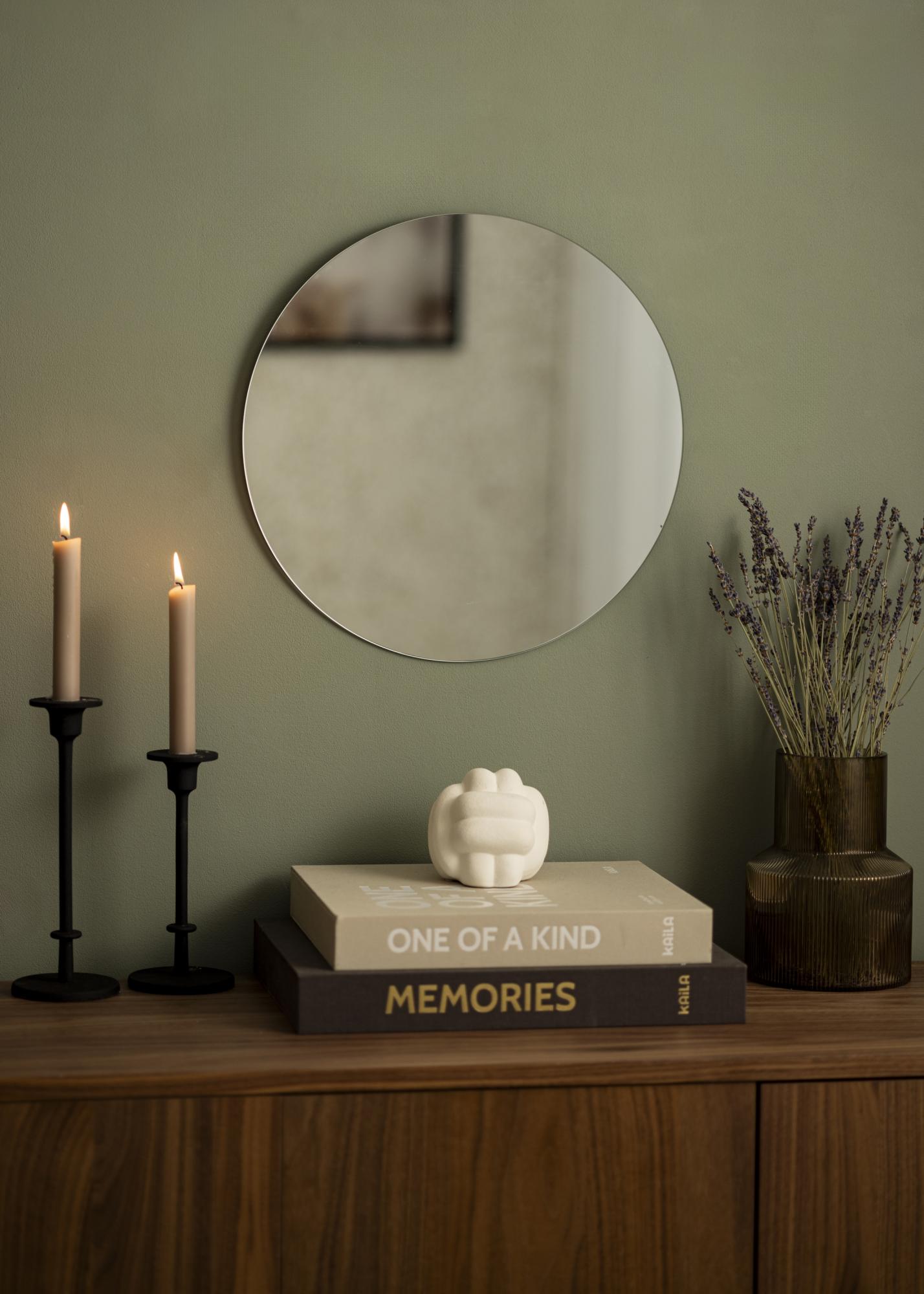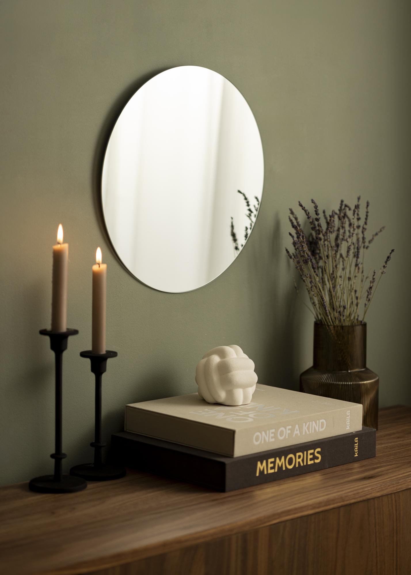 40 cm Ø okroglo ogledalo, ki je del serije okroglih ogledal iz KAILA. Na voljo v kar 13 velikostih, tako da najdete tisto, ki se popolnoma prilega vaši sobi. Ogledalo je izjemno tanko in elegantno ter se prilega v vse vrste sob in slogov notranje opreme.