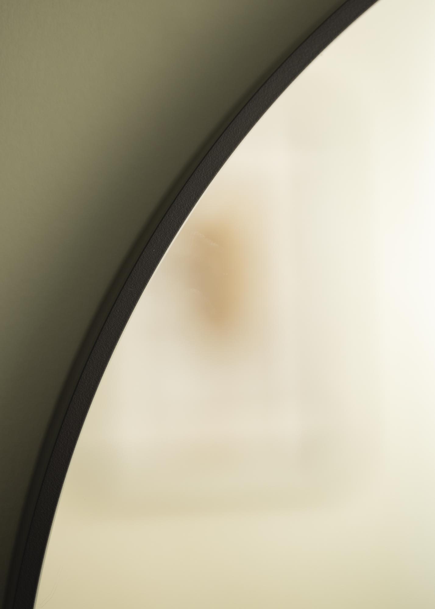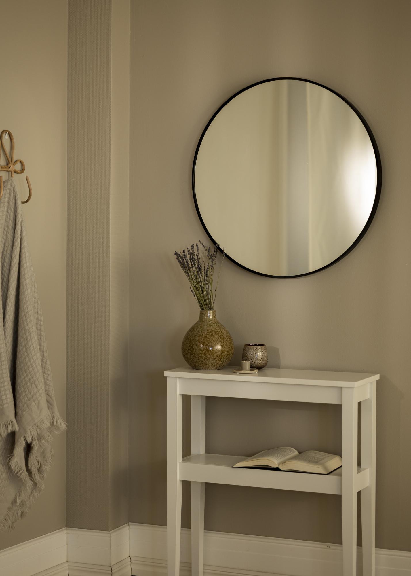 KAILA Okroglo Ogledalo Rob Črna je okroglo ogledalo s stilskim tankim kovinskim okvirjem obarvano v mat črni barvi, kar mu daje industrijski in trendovski videz. Okvir ima – odvisno od velikosti – globino med 30-40 mm, kar pomeni, da ogledalno steklo nekoliko izstopa od stene in ustvarja osupljiv 3D učinek. Globina okvirja prav tako poskrbi, da se ogledalo zdi trdno, hkrati pa ohranja svoj minimalistični videz. Popolno okroglo ogledalo za postavitev v kateri koli prostor, kjer želite dodati funkcionalnost in stilsko švedsko oblikovanje!