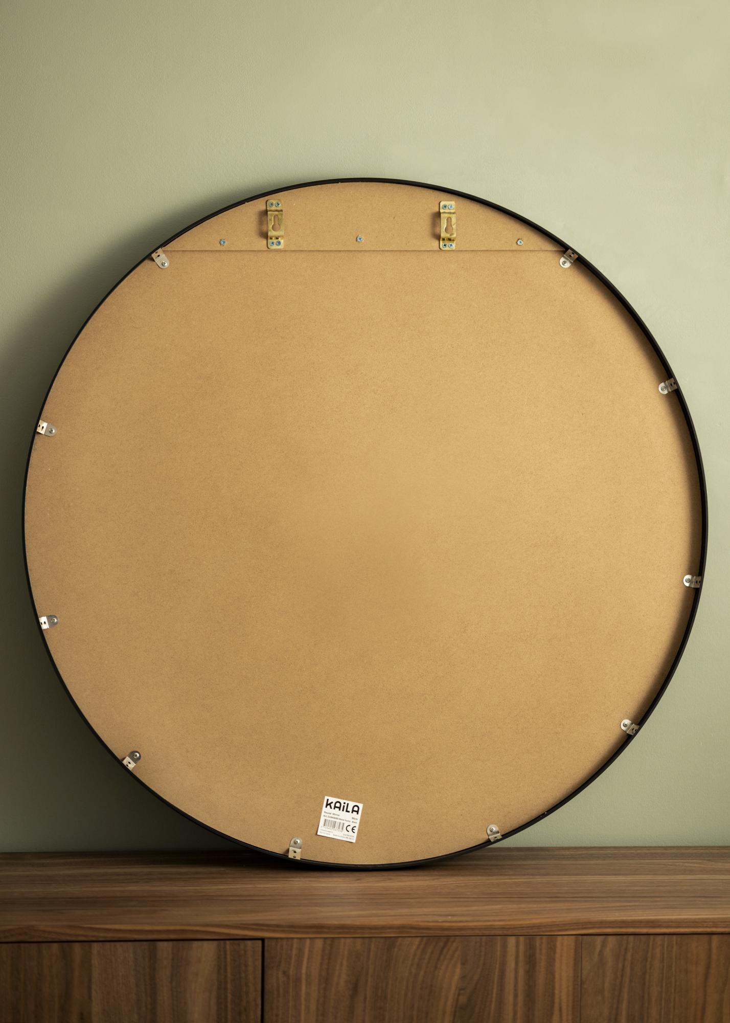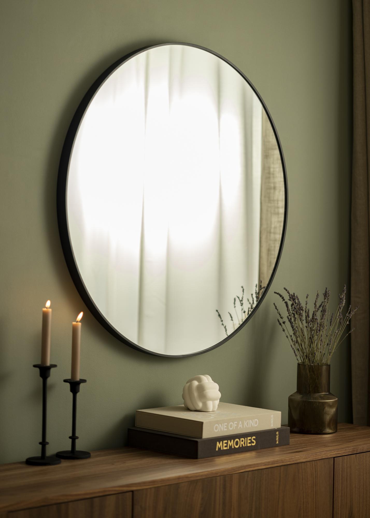 KAILA Okroglo Ogledalo Rob Črno je okroglo ogledalo s preprostim tanjim kovinskim okvirjem obarvanim v mat črni barvi, kar mu daje industrijski in trendovski videz. Okvir ima – odvisno od velikosti – globino med 30-40 mm, kar naredi, da ogledalno steklo pride nekaj časa stran od stene in ustvari izjemen 3D-učinek. Globina okvirja prav tako naredi, da se ogledalo zdi solidno, hkrati pa ohranja svojo minimalistično podobo. Popolno okroglo ogledalo za umestitev v kateri koli prostor, kjer želite dodati funkcionalnost in preprosto švedsko oblikovanje!