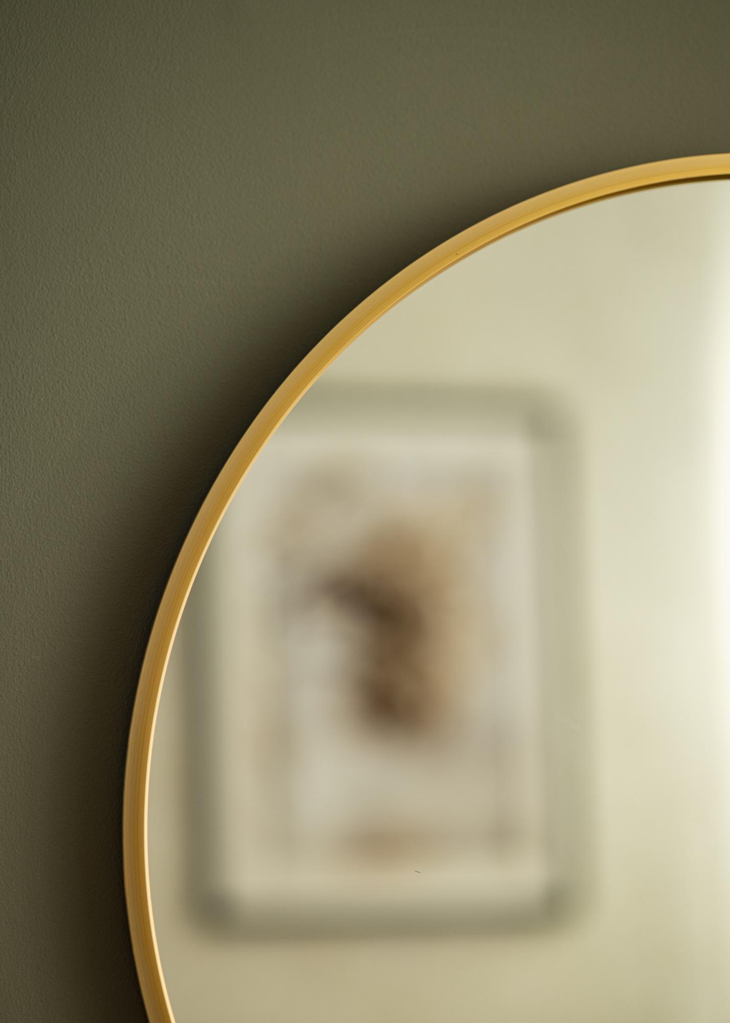 Okroglo ogledalo v elegantnem švedskem dizajnu z kovinskim okvirjem v čudovitem zlatem zaključku. Okvir ima brušeno površino, kar daje lepi zlati barvi nekoliko bolj mat videz. Okvir je tudi trendovsko tanek, a ima hkrati – odvisno od velikosti – globino med 30-40 mm, kar omogoča, da se nekoliko dvigne od stene in ustvari razburljiv 3D-učinek. Globina okvirja daje ogledalu občutek trdnosti in robustnosti, ne da bi odvzela minimalistični vtis ogledala.