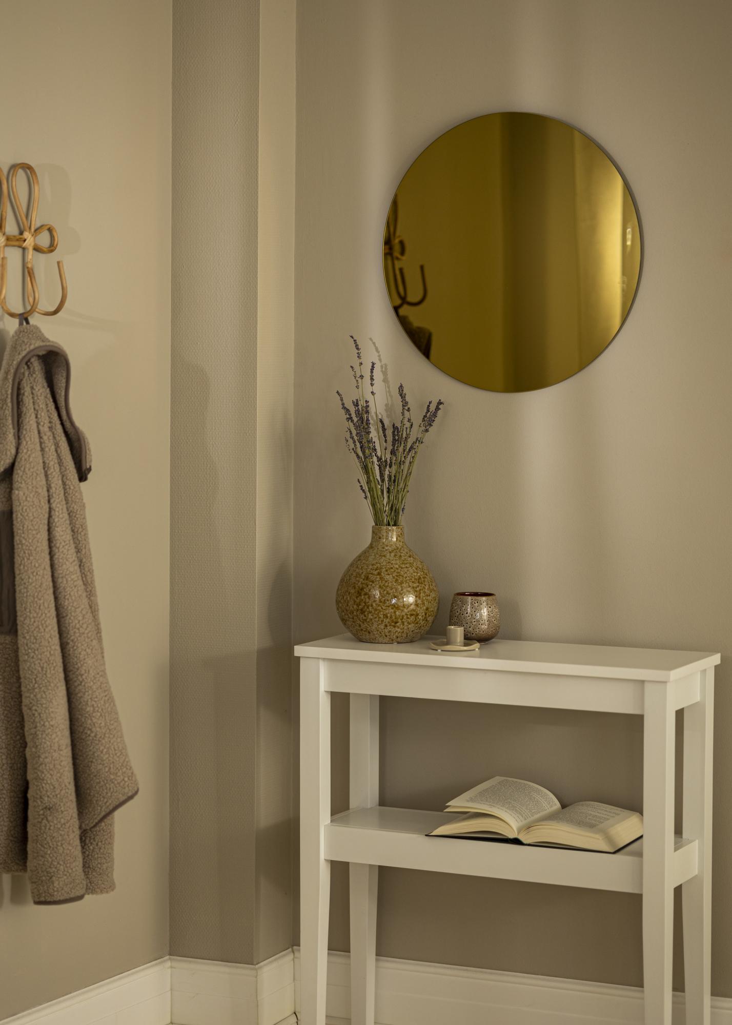KAILA Okroglo Ogledalo Zlato je popoln primer, kako dobro je lahko, ko se elegantna oblika sreča z učinkoviti podrobnostmi. To okroglo ogledalo je tanko in nima okvirja, kar mu daje sodoben in prečiščen videz. To je združeno z lepim zlatim toniranim ogledalnim steklom, ki povzdigne celoto in naredi ogledalo elegantno očarljivo.