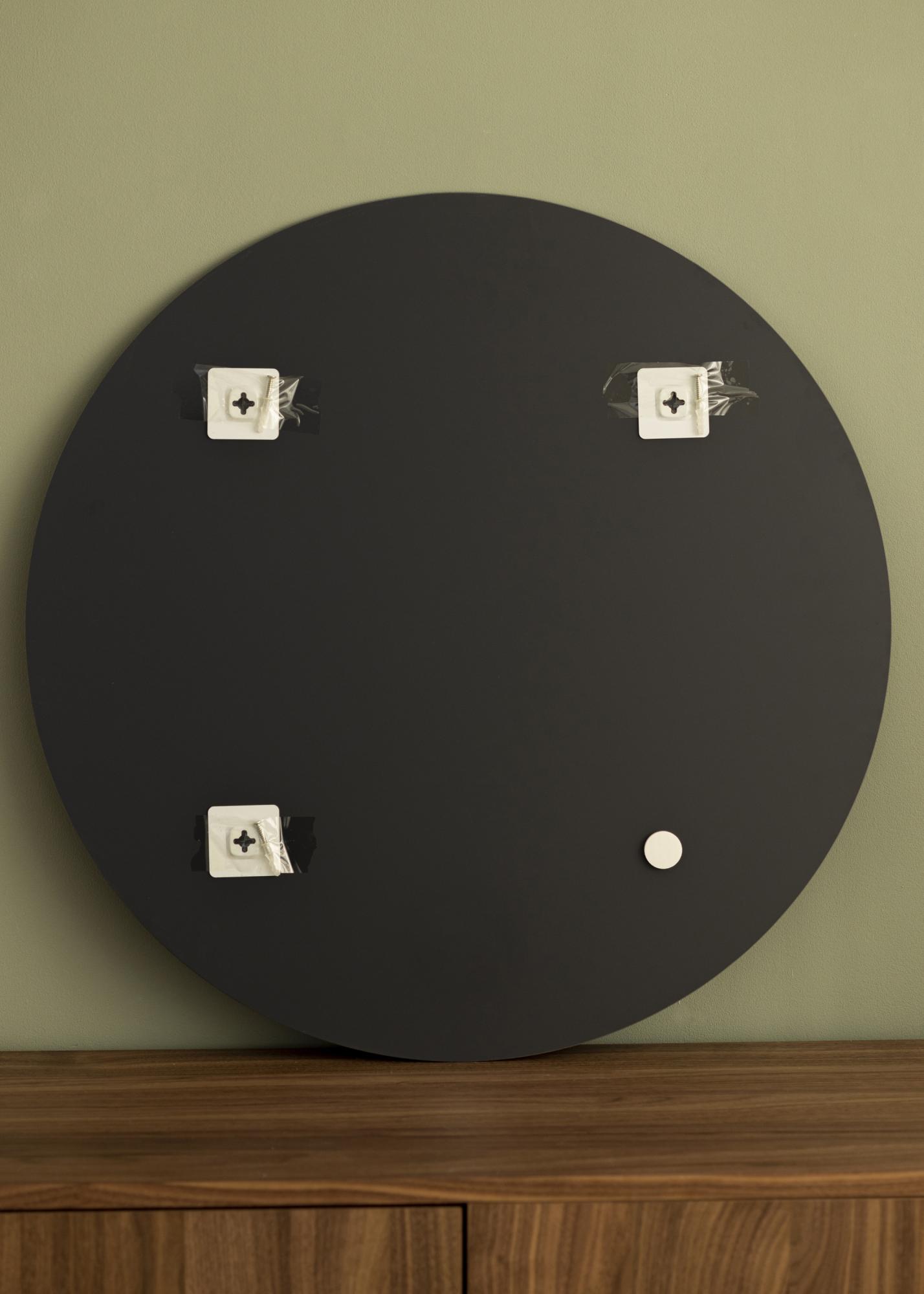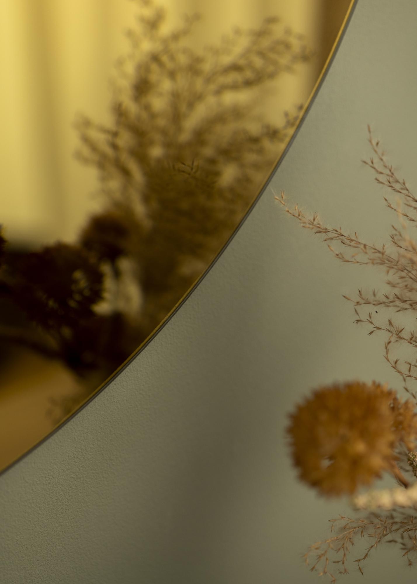 To okroglo ogledalo ima eleganten dizajn z učinkovito podrobnostjo; elegantno zlatensko ogledalo. Ta podrobnost daje ogledalu razkošen videz, hkrati pa v kombinaciji z minimalistično obliko – tanko in brez okvirja – ustvarja sodobno in okusno celoto.