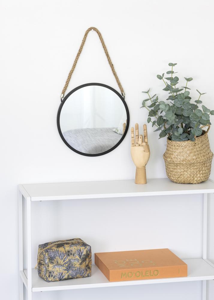Tukaj je okroglo stensko ogledalo, ki je popolno za vas, če vas pritegne notranja oprema, navdihnjena z morjem! Ogledalo je izdelano iz kovine in ima dekorativno vrv iz konoplje za dekorativno obešanje. Stenski nosilec je priložen. Steklo ogledala je obrobljeno s črnim robom, ki ogledalu daje eleganten globok videz. Ogledalo meri 30 cm v premeru.