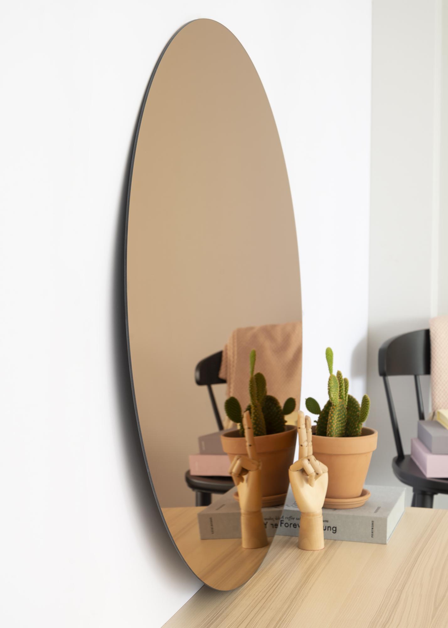 Kadar čista oblika sreča učinkovite podrobnosti, je lahko rezultat čaroben – kot v primeru tega okroglega ogledala. Ogledalo je tanko in nima okvirja, kar mu daje prefinjen vtis, obenem pa steklo v rožnato-zlati barvi naredi ogledalo zelo privlačno. To je klasična oblika z modernim pridihom!