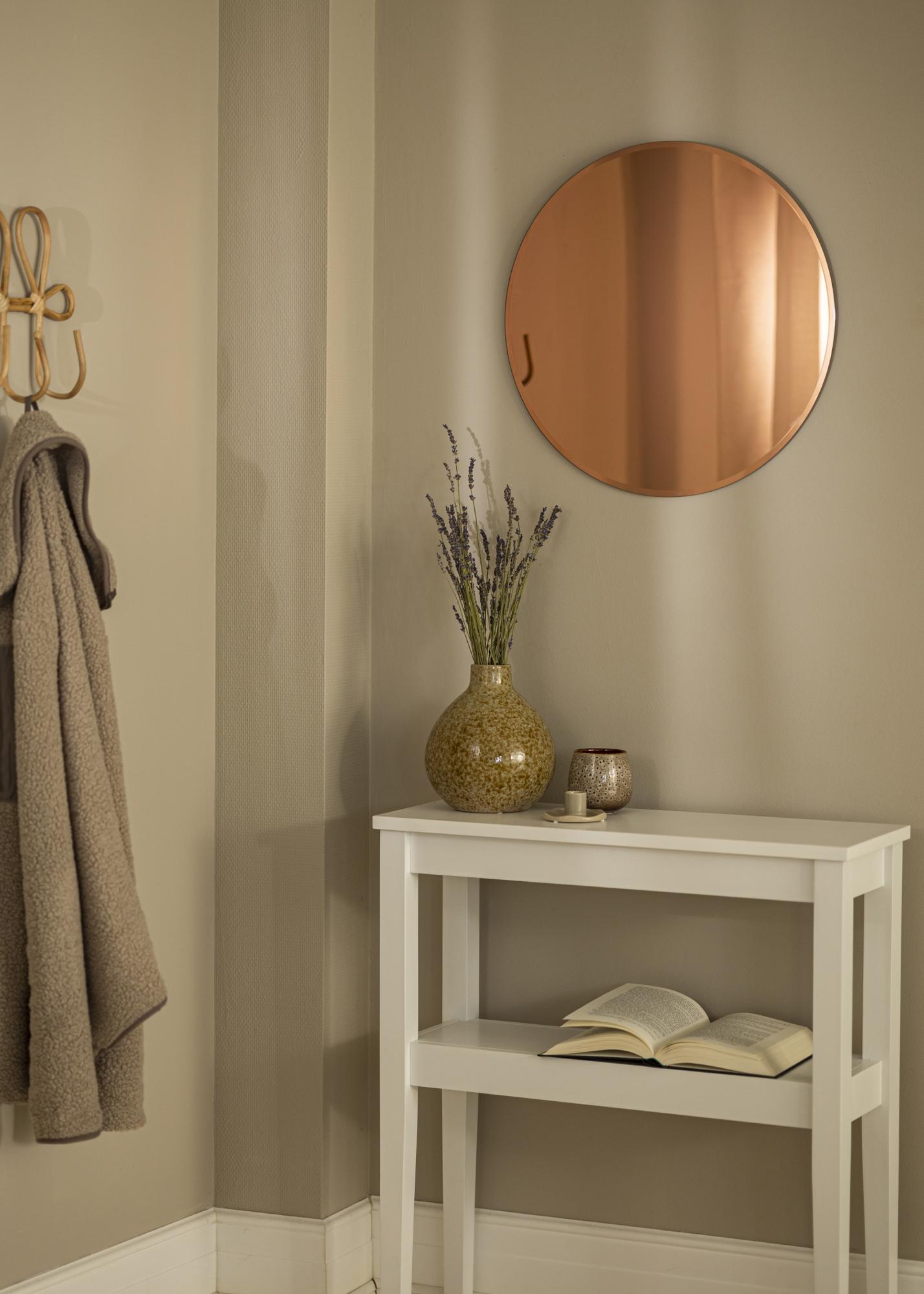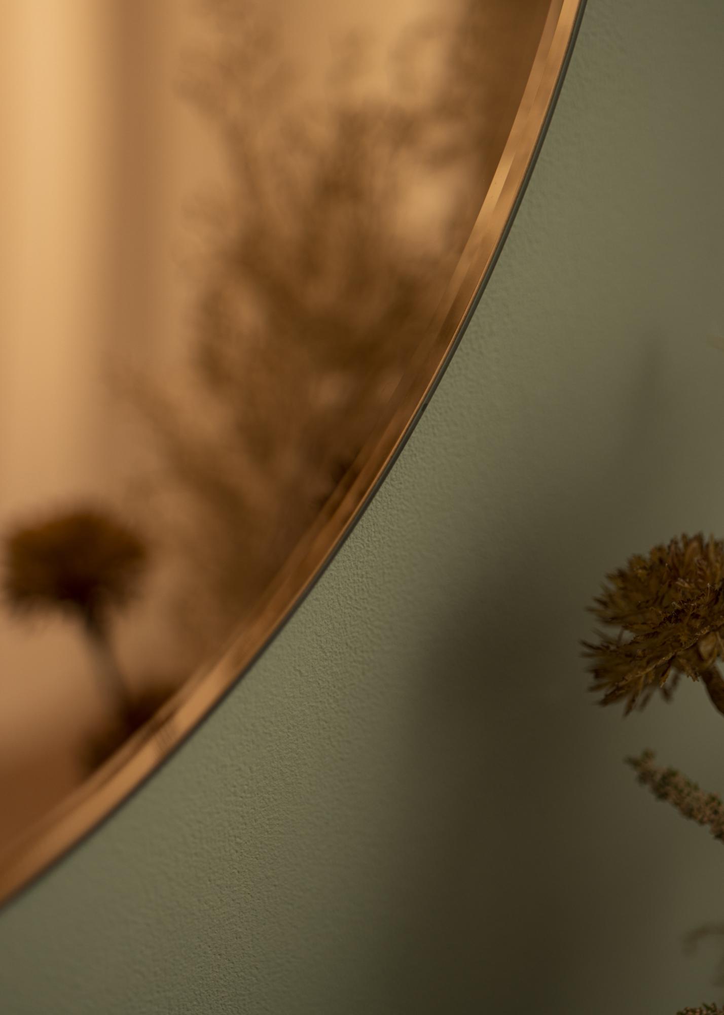 Rose Gold Deluxe je stensko ogledalo v brezčasnem dizajnu, z modernim pridihom v obliki toniranega zrcalnega stekla. Topel odtenek rose zlatega zrcalnega stekla daje ekskluziven in unikaten izraz, ki se popolnoma ujema z elegantno okroglo obliko. Za dodatno dodelanost je to ogledalo opremljeno tudi s poševnim robom.