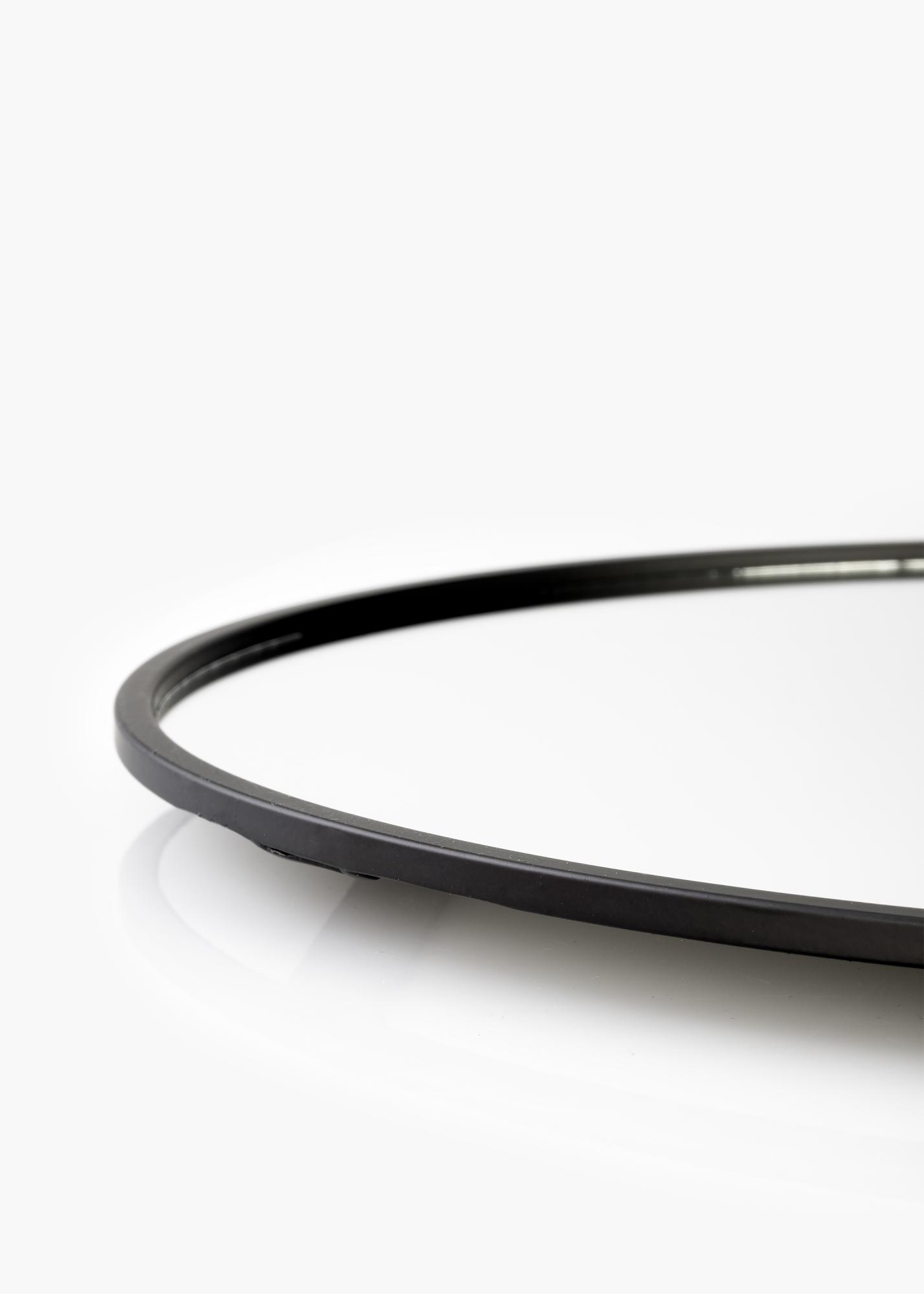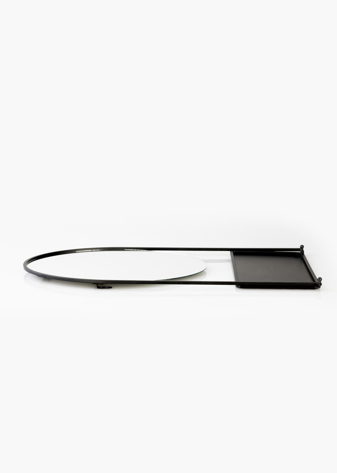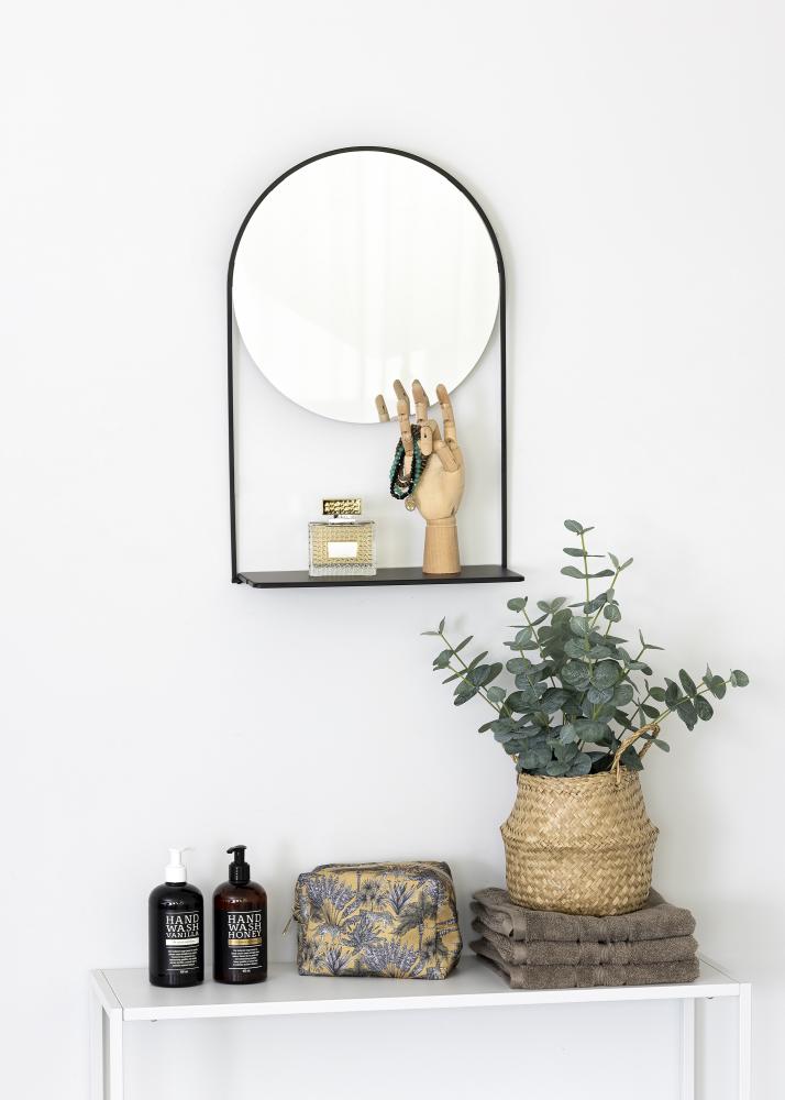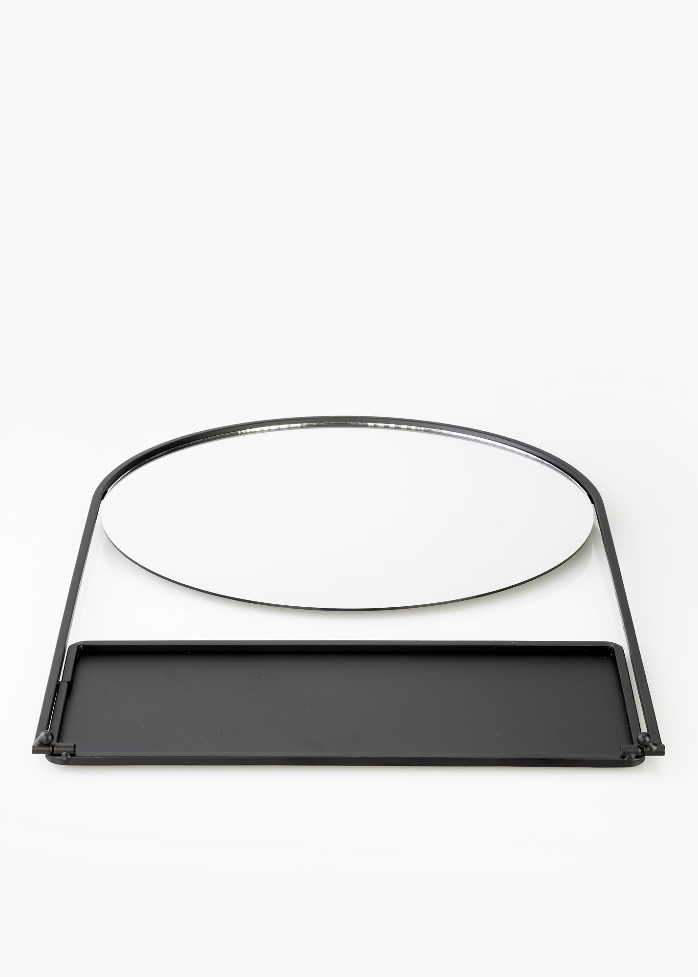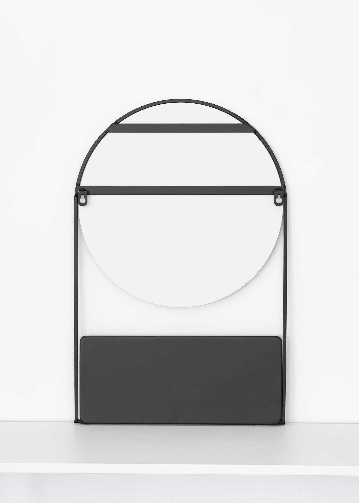 Ta elegantno stensko ogledalo s polico je švedski dizajn podjetja KAILA. Ogledalo je v črnem odtenku in je izdelano iz kovine. Sama površina ogledala je okrogla in meri 35 cm v premeru. Okoli površine ogledala je črn kovinski rob ter na dnu polica - popolna za lepe dekoracije ali malo shranjevanja ličil! Ogledalo meri 35x55 cm in ima stensko pritrditev.