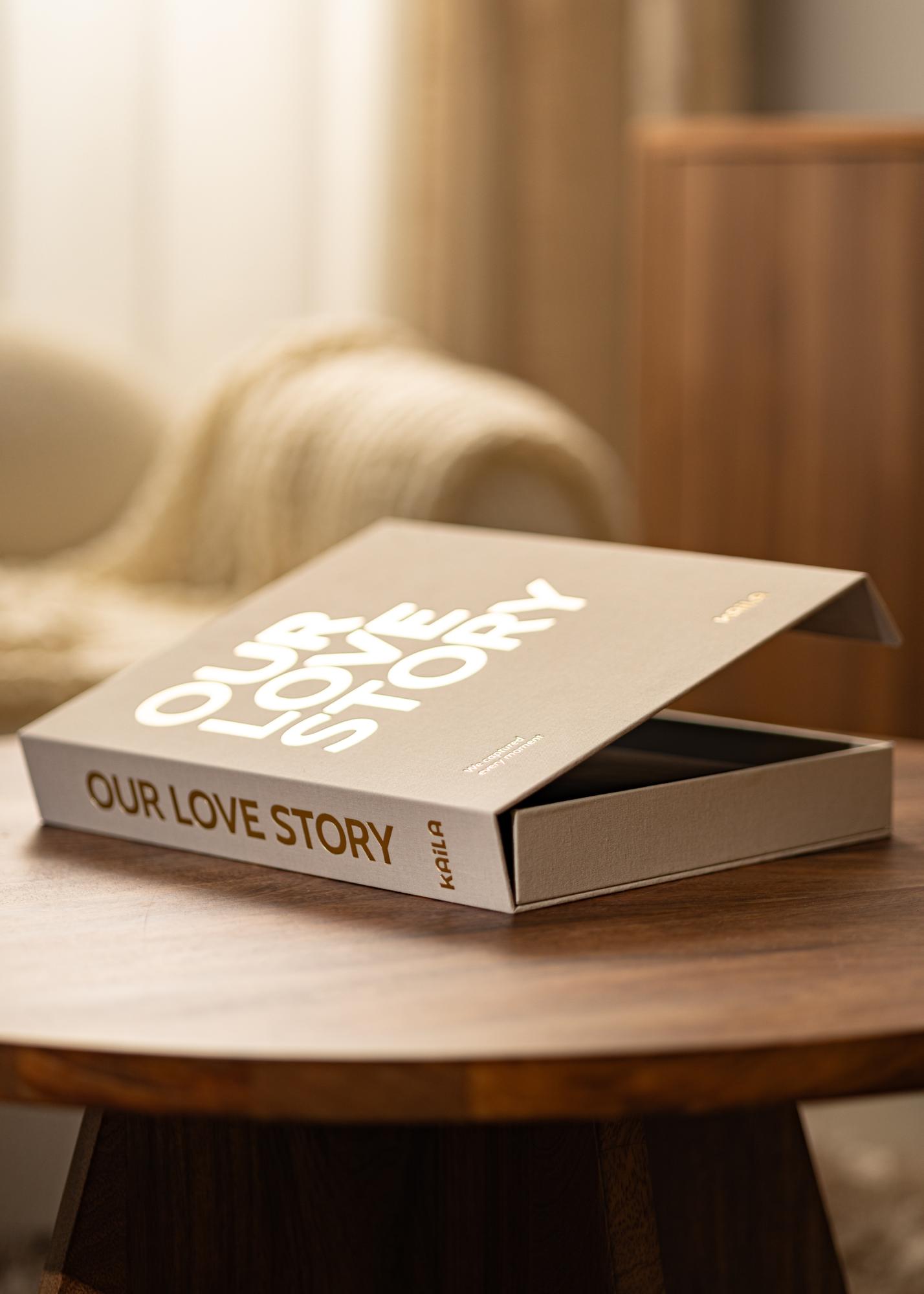 To je foto album in knjiga za na mizo v enem, ki je hkrati dekorativni element v vašem domu. Foto album je oblikovan kot škatla prekrita s tkanino in ima čudovito kremno barvo. Na sprednji strani foto albuma je naslov "OUR LOVE STORY" natisnjen z velikimi belimi črkami in podnaslov "We captured every moment", kar naredi ta album popoln za ohranjanje lepih spominov na vaše najdražje odnose ali kot lepo darilo. Zakaj ne bi shranili čudovitih poročnih fotografij v tem elegantnem foto albumu? Na notranji strani foto albuma boste našli diskretno natisnjen vzorec in obročni veznik s 30 (60 strani) črnimi listi, kamor lahko sami prilepite fotografije, kar vam omogoča ustvarjalnost.