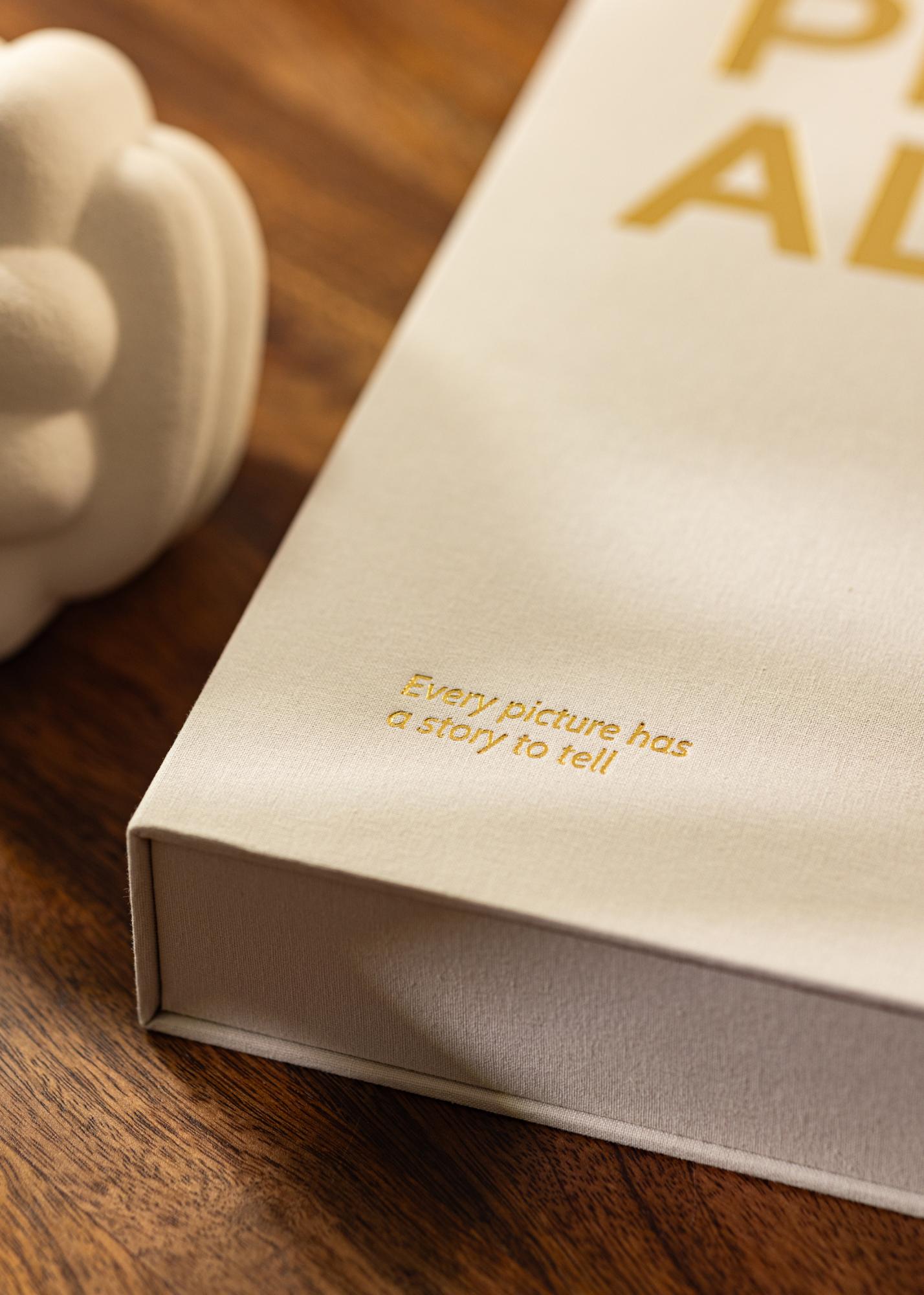 To je foto album za vas, ki iščete album, ki bo shranjeval vaše najlepše foto spomine in ki bo hkrati lepo nameščen na vidnem mestu. Album je zasnovan kot Coffee Table Book, z modernim dizajnom, ki je kot nalašč za okras na mizici v dnevni sobi ali na knjižni polici. Zasnovan je kot ekskluzivna škatla s pokrovom iz elegantne kremne tekstilije. Ko odprete album, vas pričaka obročna mapa s 60 črnimi albumskimi stranmi (30 listov), ki jih lahko napolnite s fotografijami iz lepih trenutkov. Fotografije prilepite sami, točno tam, kjer želite.