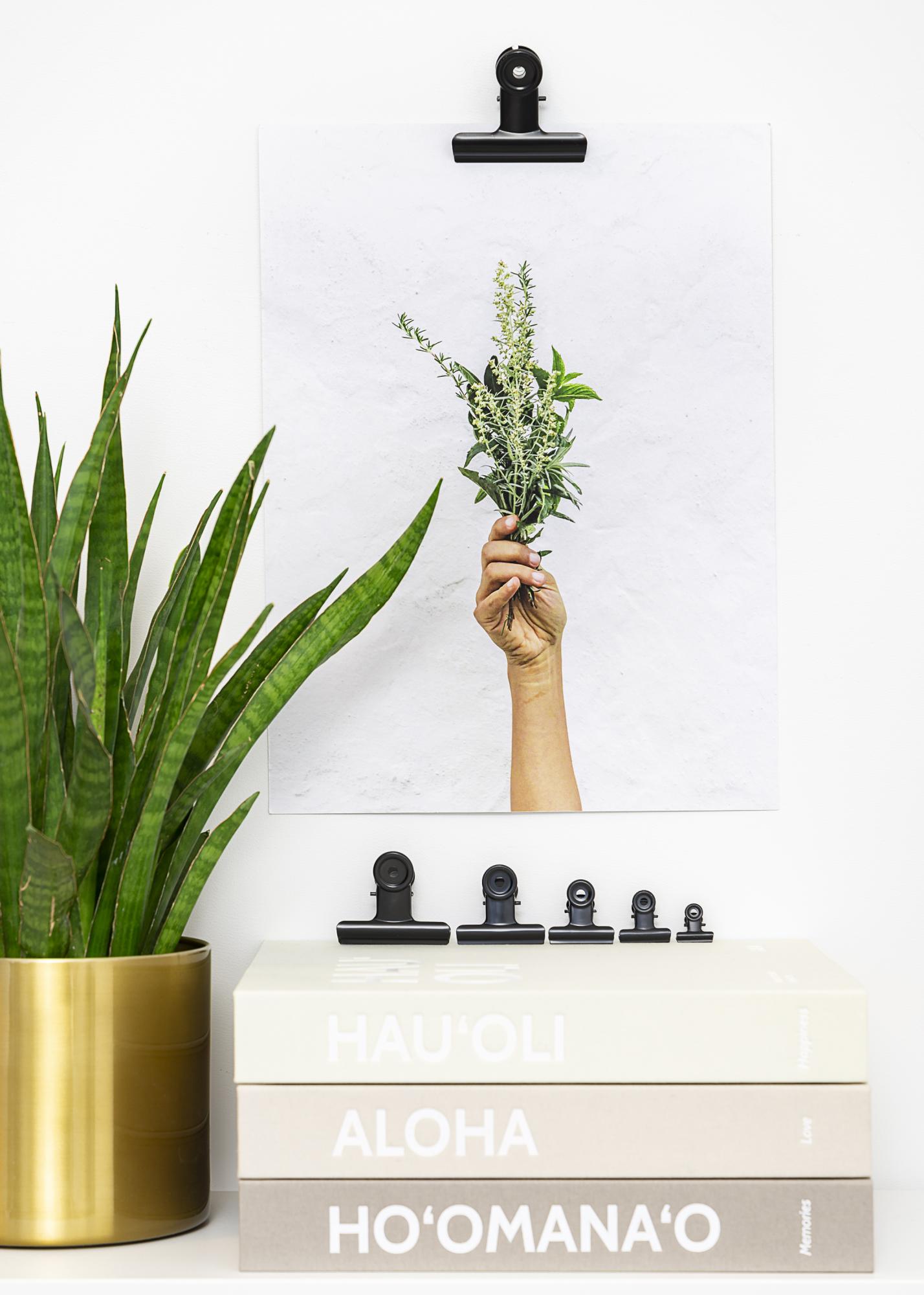 Ta črna kovinska sponka ima elegantno mat površino in daje vašim plakatom in tiskom šik in trendovsko obešanje. Odprtina sponke ima močan prijem, ki omogoča, da pritrdite tudi najtanjše papirje, hkrati pa jo lahko uporabite tudi za motive z nekoliko večjo debelino. Če imate velik plakat, ki ga želite obesiti, se lahko odločite za uporabo dveh sponk za plakate. Dizajn kovinske sponke je eleganten, in luknje v okrogli zgornji strani sponke omogočajo enostavno in enostavno obešanje na steno z majhnim žebljem ali vijakom.