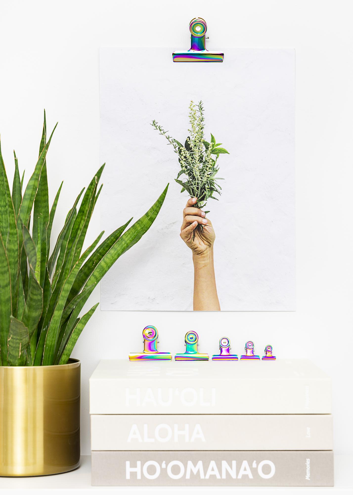 Ena sponko iz kovine v mavričnih barvah z bleščečim zaključkom, ki vašim posterjem in tiskom nudi trendovsko in malo drugačno visečo rešitev. Močen, a fleksibilen prijem sponke omogoča pritrditev najtanjših papirjev kot tudi posterjev z malo večjo debelino. In če imate velik poster, ki ga želite obesiti, je dovolj, da uporabite dve kovinski sponki. Dizajn poster sponke je eleganten in prečiščen, zahvaljujoč luknjam v okrogli vrhovi sponke pa jo enostavno pritrdite na steno s pomočjo majhnega žeblja ali vijaka.