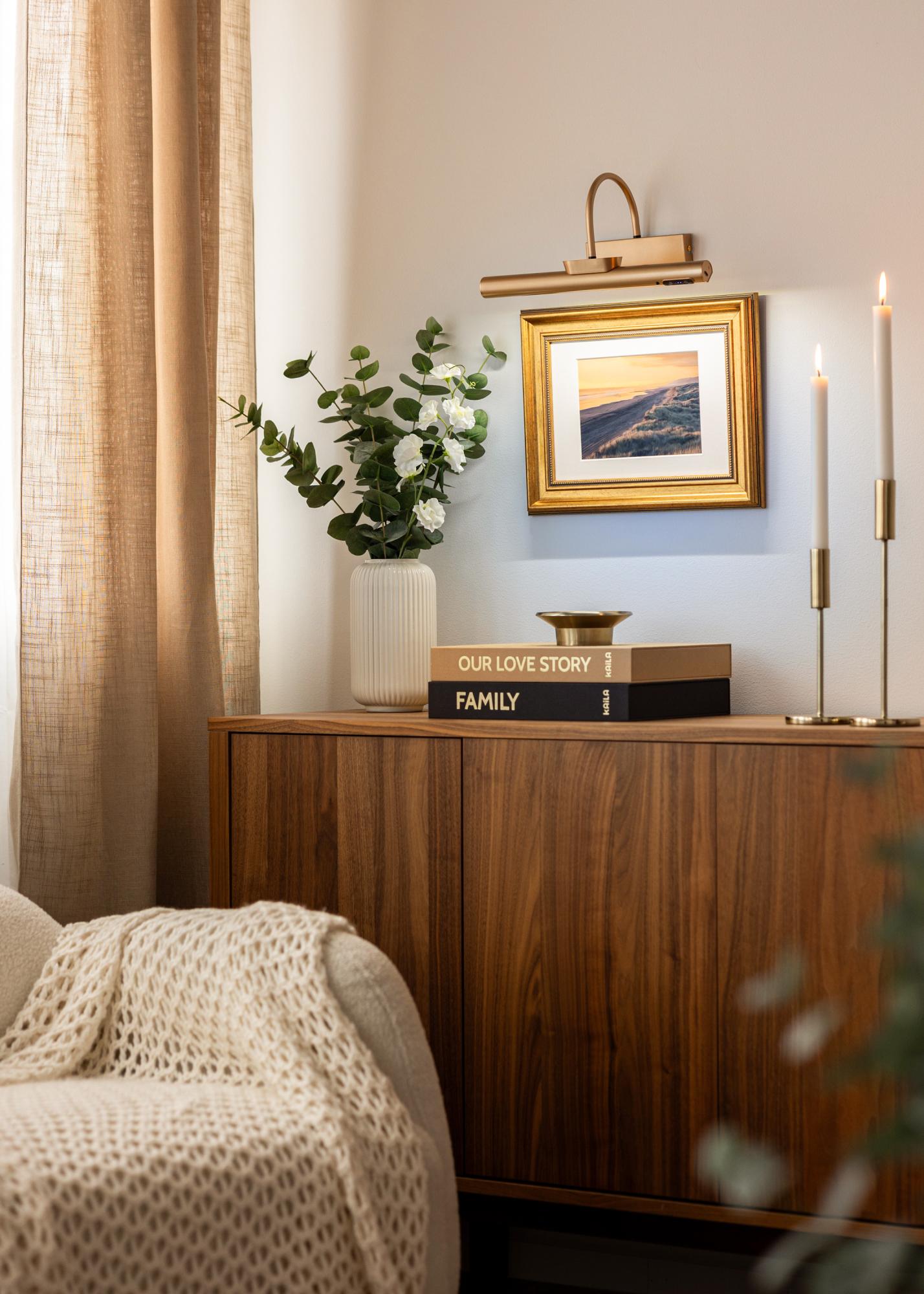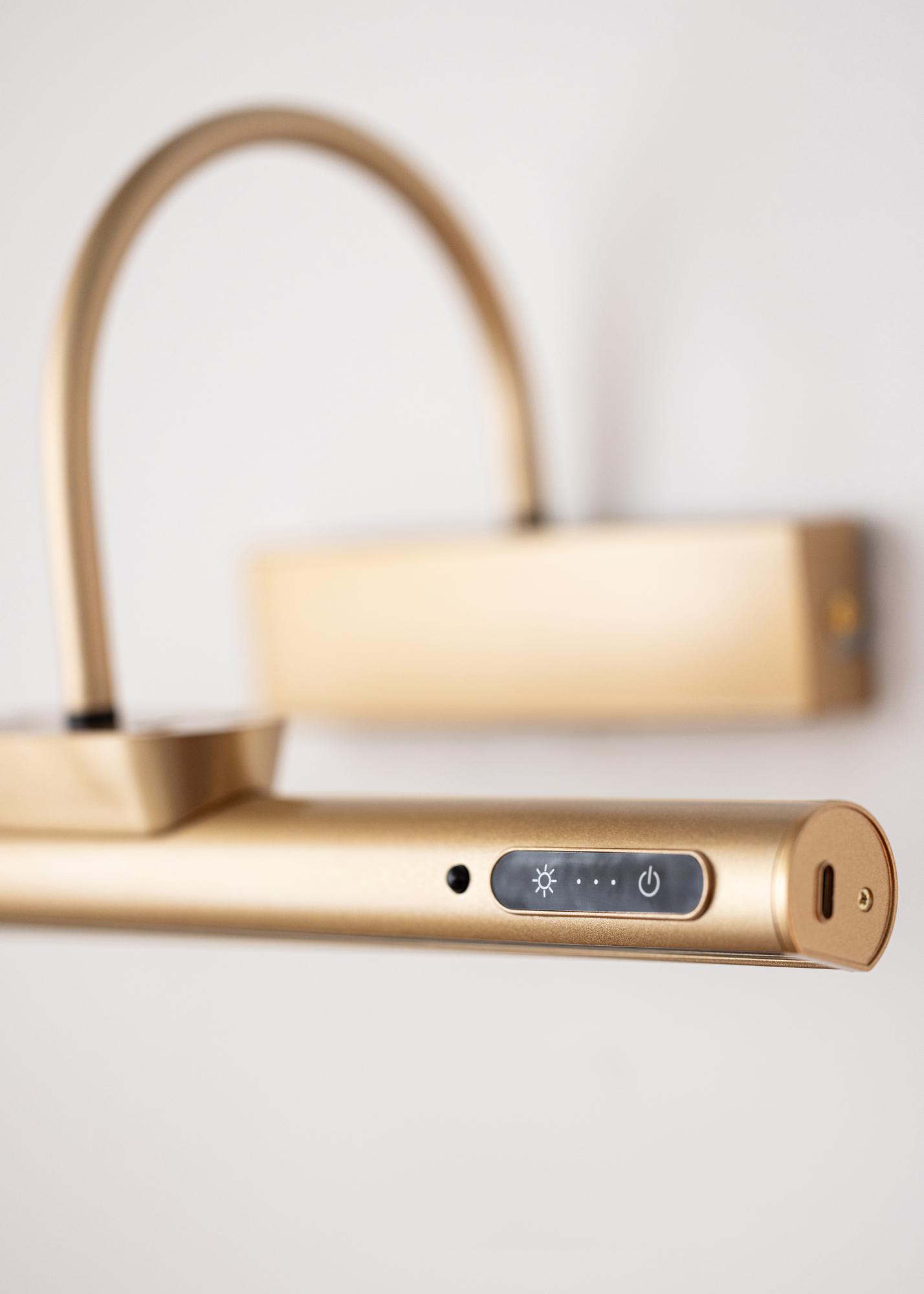 Svetilka za slike ima globino 14 cm in dolžino 35 cm, kar jo naredi idealno za osvetlitev slik do širine 60 cm. Elegantna zlata barva ji daje razkošen in prefinjen občutek, ki se popolnoma prilega v vse vrste notranje opreme. Vir svetlobe je energijsko učinkovita LED z nastavljivo svetlostjo med 262 in 300 lumni, kar zagotavlja prijetno svetlobo, ki poudari vaše slike na mehak in naraven način.