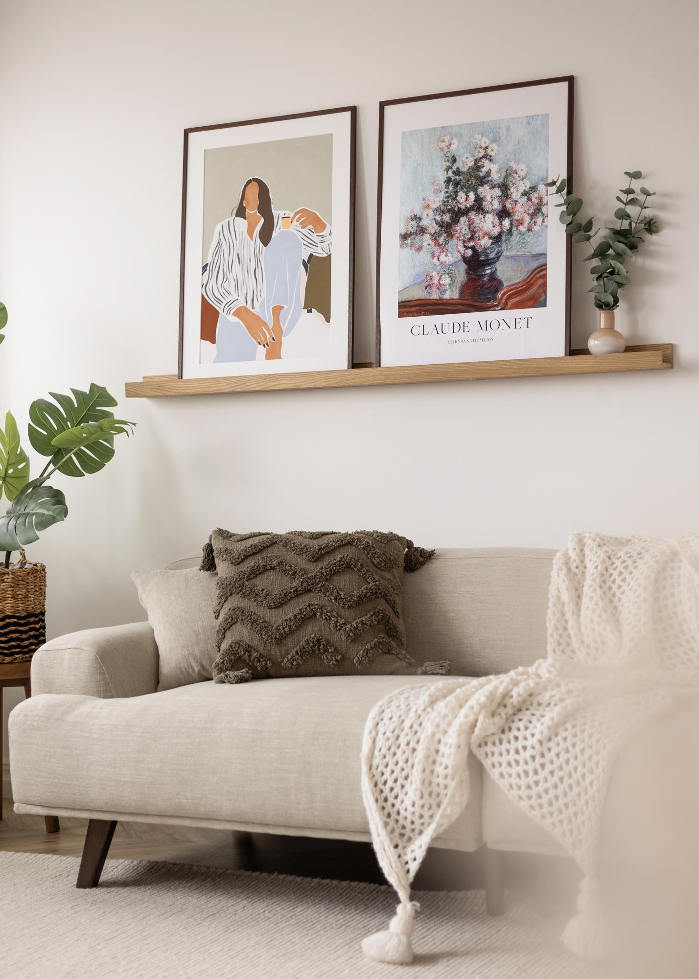 Z uporabo praktične poličke za slike lahko na eleganten način razstavite slike in obenem omogočite izjemne možnosti za spreminjanje vaše stenske umetnosti. Ta polička za slike je izdelana iz masivnega hrasta in ima elegantno oblikovanje s preprostimi, ravnimi linijami. Sama polica ima zarezano utor, ki nudi oporo vašim slikam in omogoča, da so postavljene pod lepim kotom, naslonjene na steno. Polička za slike je na voljo v več različnih dolžinah, pri čemer ta različica meri 150 cm. Polička za slike ima tudi predvrtane luknje, za lažjo montažo pa so priloženi primerni vijaki in vložki.