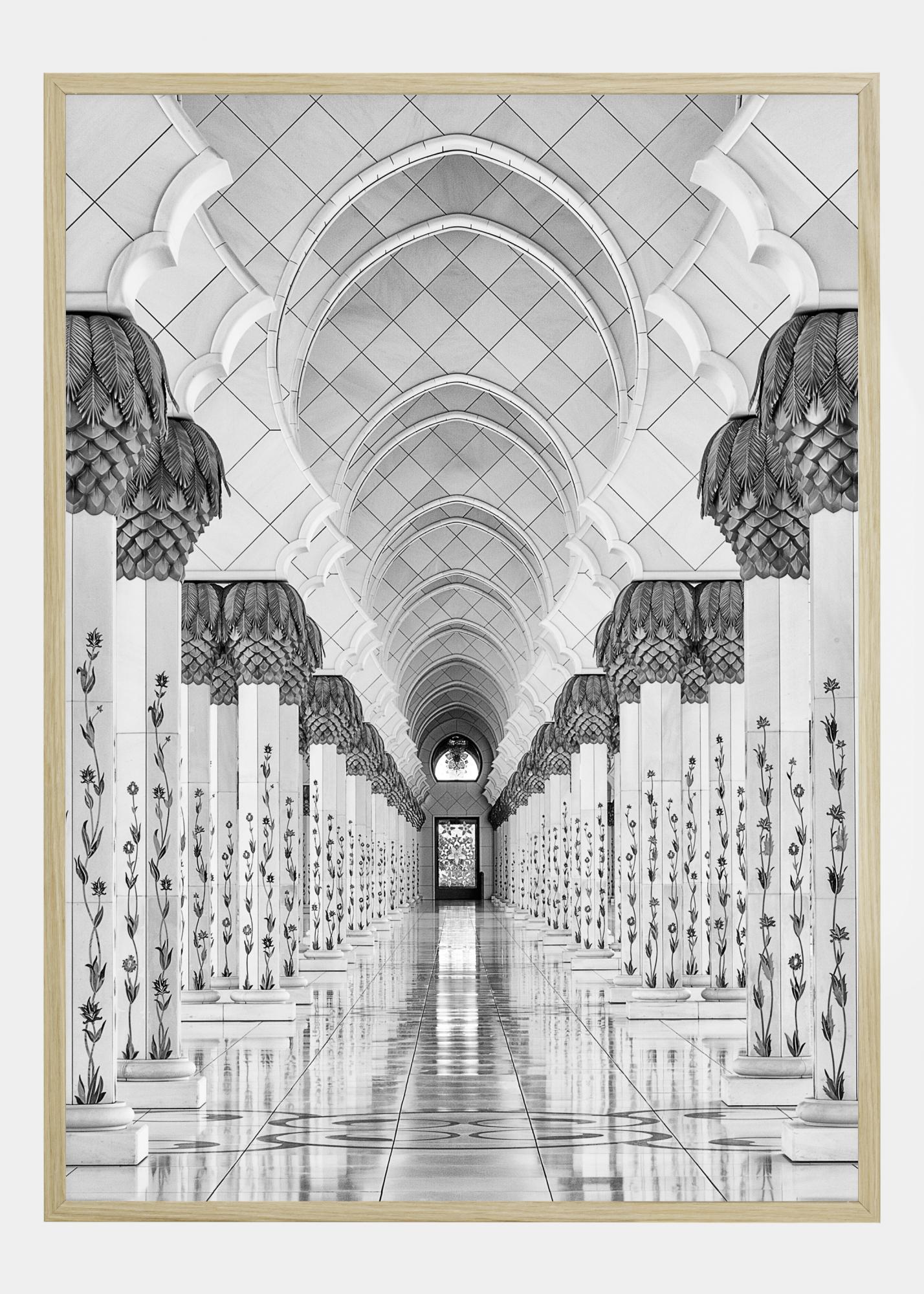 Črno-bela plakat, ki ustvarja iluzijo globine. Dve vrsti stebrov vodita do oddaljenih steklenih vrat. Stebri so lepo okrašeni s cvetovi. Naravna svetloba sije skozi steklena vrata in ustvarja odsev na tleh. Obesite ta tisk za ustvarjanje občutka dodatnega prostora.