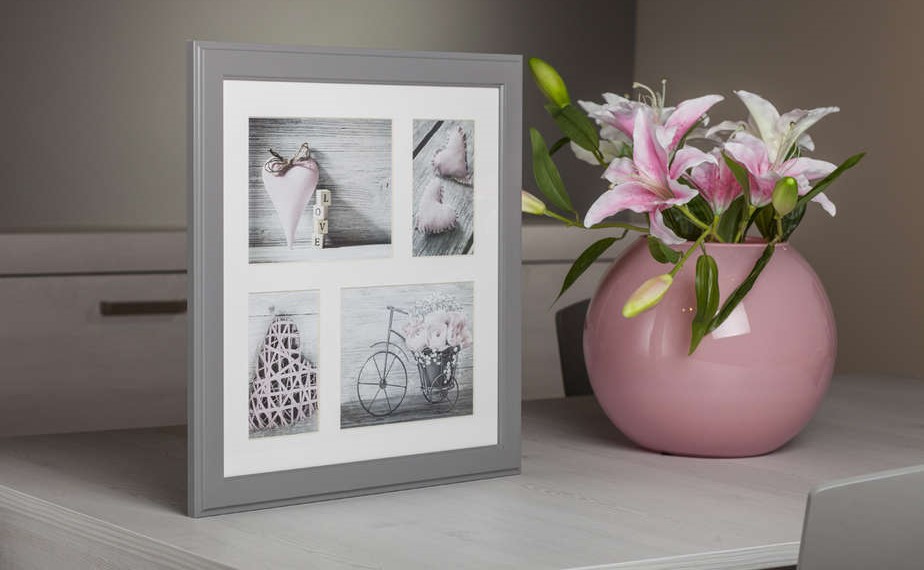 Ko je življenje dolgočasno in nimate načrtovanih nobenih zabavnih stvari, se lahko vedno vrnete k svojim najboljšim spominom s pogledom na fotografije. Ta elegantni kolažni okvir zbira štiri najljubše slike in jih združuje v lepo celoto. Foto okvir je v svetlo sivi barvi in ima luksuzne podrobnosti. Svetlo siva barva se odlično ujema s črno-belimi ali pastelno obarvanimi fotografijami.
