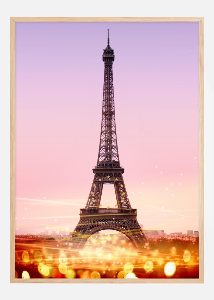Ta plakat ujame veličastni Eifflov stolp v razpoloženjskem mraku. Mehki pasteli na nebu ustvarijo romantično ozadje za ta ikonični spomenik, medtem ko mestne luči spodaj sijejo kot zvezde, kar dodaja občutek čarovnije in sanjskosti. To je poklon Parizu, mestu luči, in njegovi sposobnosti, da navdihuje ljubezen in čudenje.