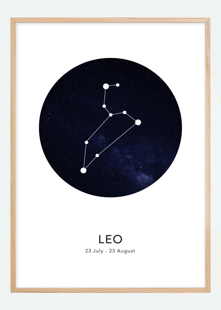 Podarite osebno sliko nekomu, ki ga imate radi! Ta stilsko dovršen plakat ima motiv zvezdnega znamenja Lev na ozadju v obliki črnega in modrega zvezdnega neba. Spodaj je ime skupaj z ustreznim datumom v angleščini.