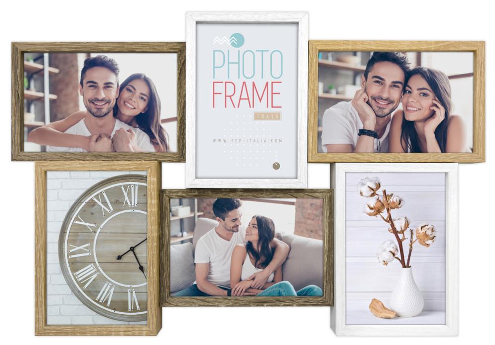 Elegantni okvir za kolaž, izdelan iz lesa. Okvir je v več različnih odtenkih, vendar ima kljub temu eleganten dizajn z nežnimi okvirji v naravnih tonih. Zakaj ne bi zbrali svojih 6 najlepših foto spominov in jih ovekovečili v tem okviru, da boste vedno lahko pogledali nazaj nanje! Ta okvir za kolaž sprejme 6 motivov v velikosti 13x15 cm. Na voljo je pritrditev na steno.