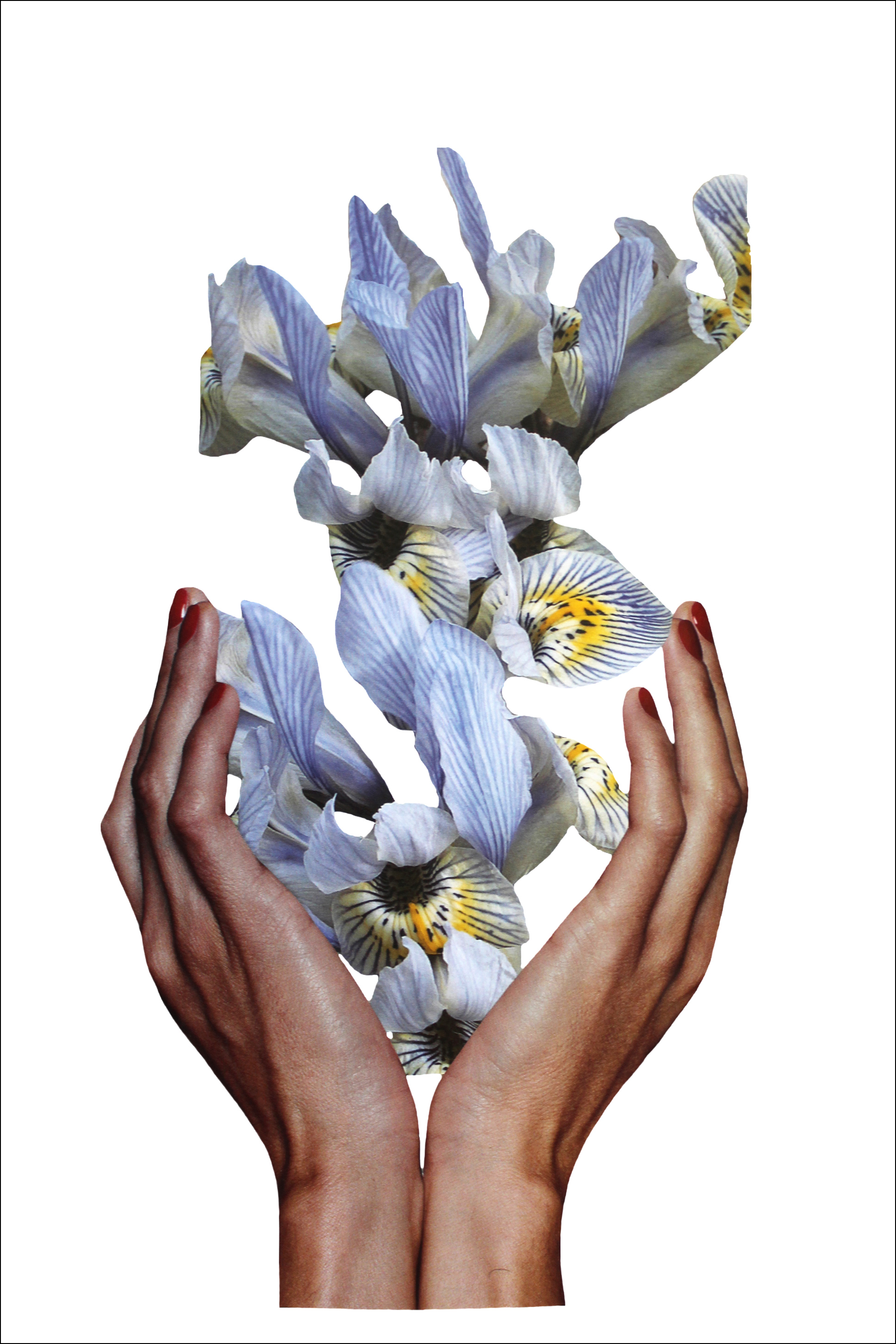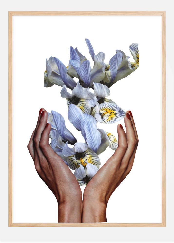 Čudovita cvetlična slika bledoljubičastih šarenic. Nežne odprte roke z lepo pobarvanimi nohti nežno držijo šarenice. Bela podlaga poudari mehke vijolične in rumene barve ter ustvari delikatno, vendar čudovito cvetlično sliko. Sproščujoč plakat, ki poživlja preprosto belo steno.