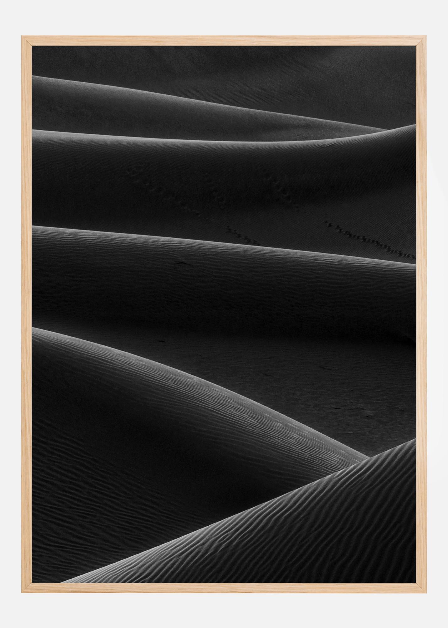 Čudovit črno-bel plakat s peščenimi sipinami v puščavi. Valoviti pesek poudarja naravna svetloba, ki pade na peščene sipine in ustvari efekt robov. Čudovita, a tiha slika za obešanje na belo steno, da se ustvari občutek neskončnosti.