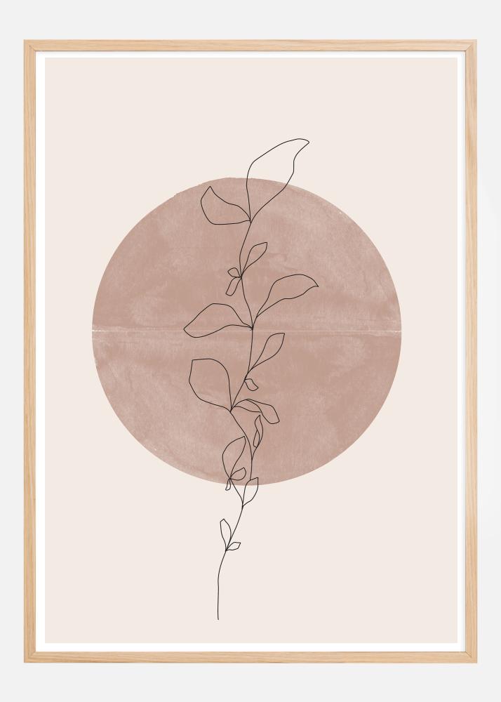 Ta plakat prikazuje nežno linijsko ilustracijo cvetoče veje, katere obrisi se igrajo proti veliki, naslikani krogi v pomirjujoči, zemeljski barvi. Kontrast med minimalističnim cvetličnim motivom in močno barvo ozadja ustvarja zanimivo dinamiko, ki je tako pomirjujoča kot estetsko privlačna.