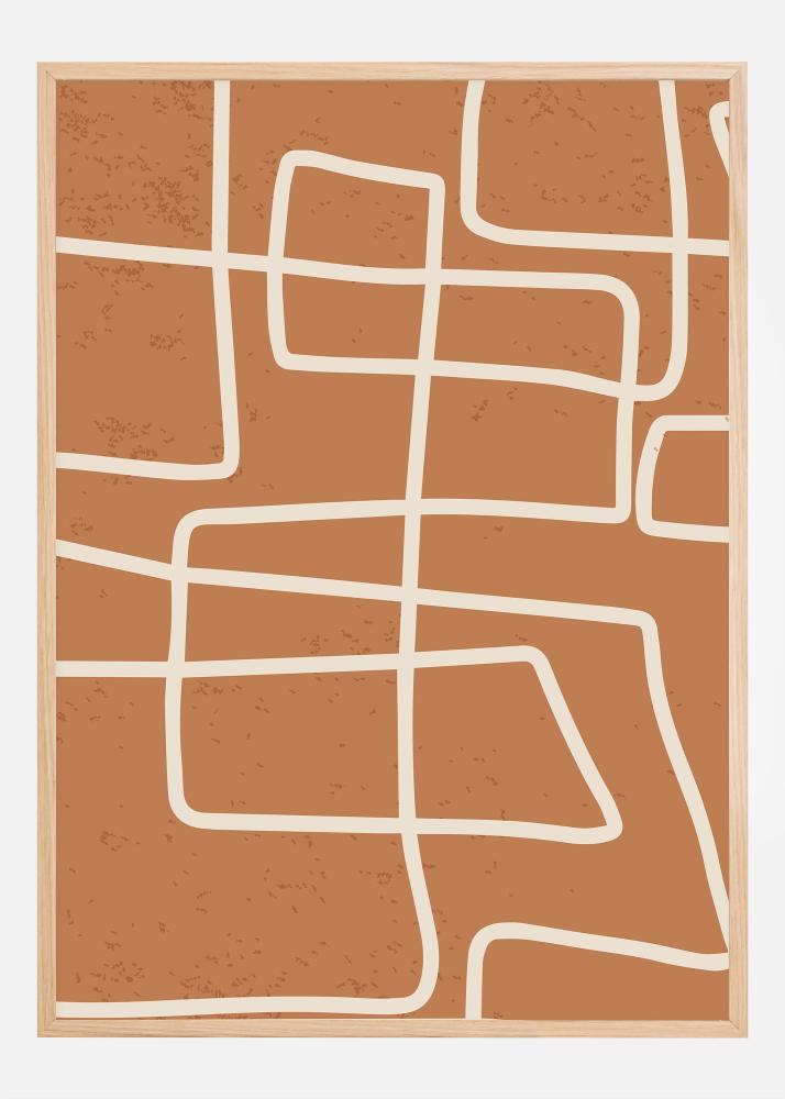 Ta minimalistični in elegantni plakat predstavlja mrežo čistih linij, ki tvorijo nekakšen abstrakten zemljevid ali kubistično pokrajino. Bež linije prečkajo toplo terakotno ozadje in ustvarjajo občutek reda in strukture na mehko teksturiranem platnu. To je tisk, ki se odlično prilega tistim, ki cenijo moderno oblikovanje in toplejši barvni spekter v svojem domu ali pisarni.