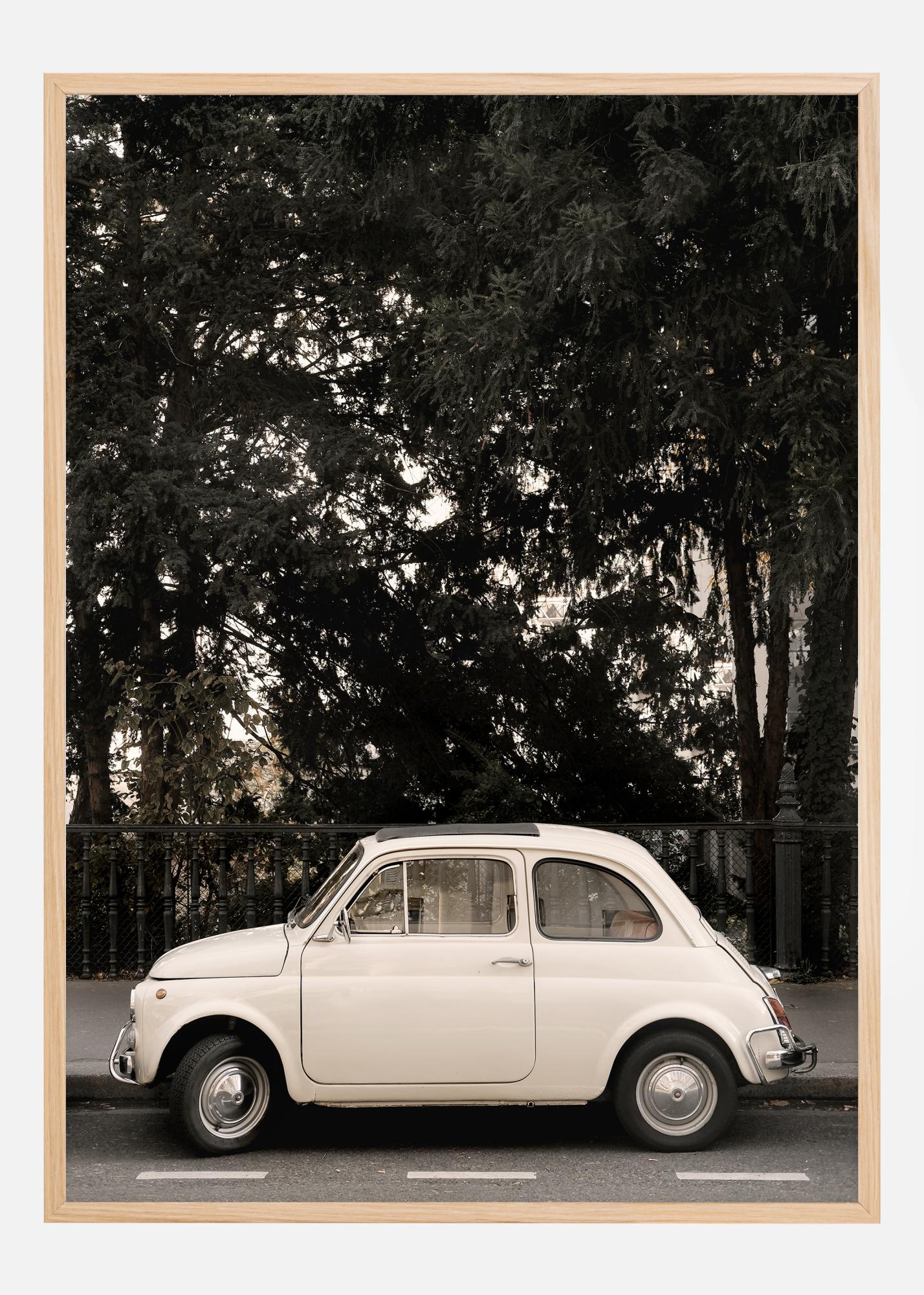 Na tem plakatu se odraža popolno ravnovesje med čistimi belimi površinami vozila in temnejšimi zelenimi toni dreves v ozadju, ki skupaj ustvarjajo mirno in harmonično sliko. Sepijasti obarvano nebo in subtilno mestno okolje dodata dodatno dimenzijo topline in globine. Ta plakat bo dodal pridih sofisticiranosti vsakemu prostoru in je idealno darilo za ljubitelje avtomobilov ali za tiste, ki cenijo klasično estetiko v svojem notranjem oblikovanju.