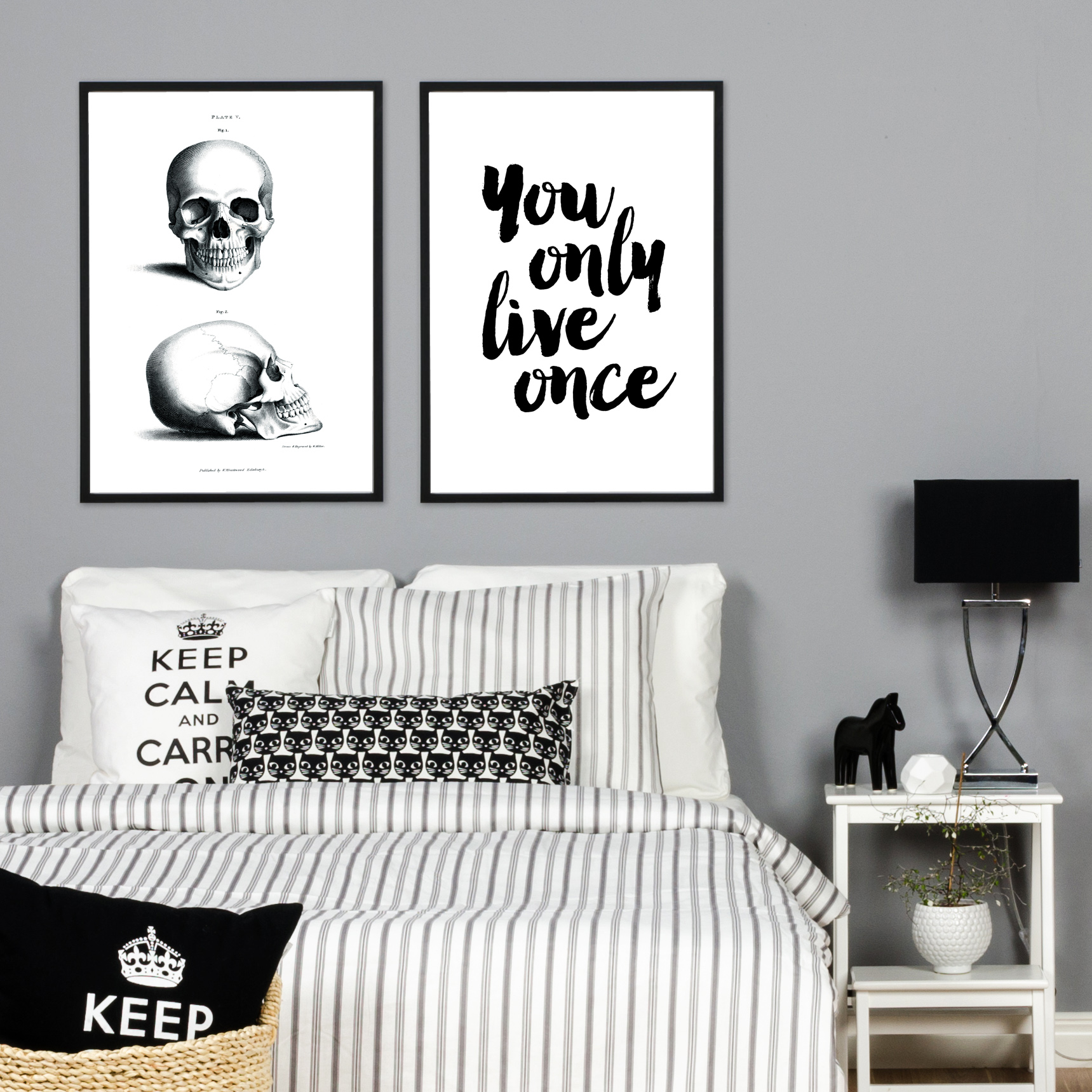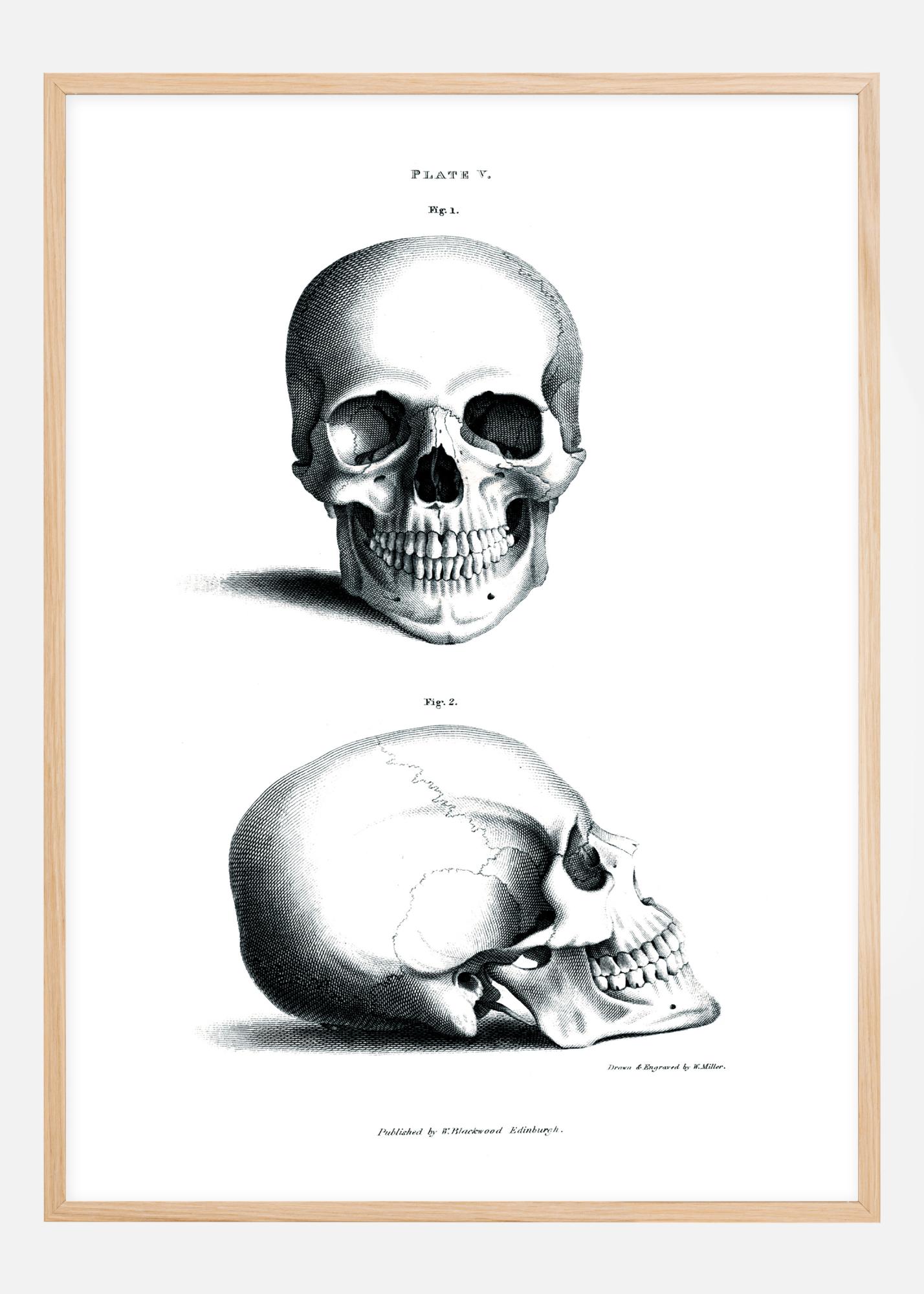 Ne bojte se obesiti plakatov z nekoliko makabričnimi motivi, ko opremljate - vse je odvisno od tega, s čim jih kombinirate! Ta eleganten plakat je vzet iz starega učbenika, izdanega v 19. stoletju. Ilustrator je bil William Miller in bil je uspešen gravurec. Motiv prikazuje človeško lobanjo, gledano od spredaj in s strani, z zelo dobro izdelanimi detajli. Pod motivom najdete ime gravurca in informacije o založniku. Ker je plakat črno-bel, se enako dobro ujema s črnim okvirjem kot z bolj barvitim. Na voljo je v več različnih velikostih, tako da zlahka najdete takšnega, ki ustreza vašemu domu.