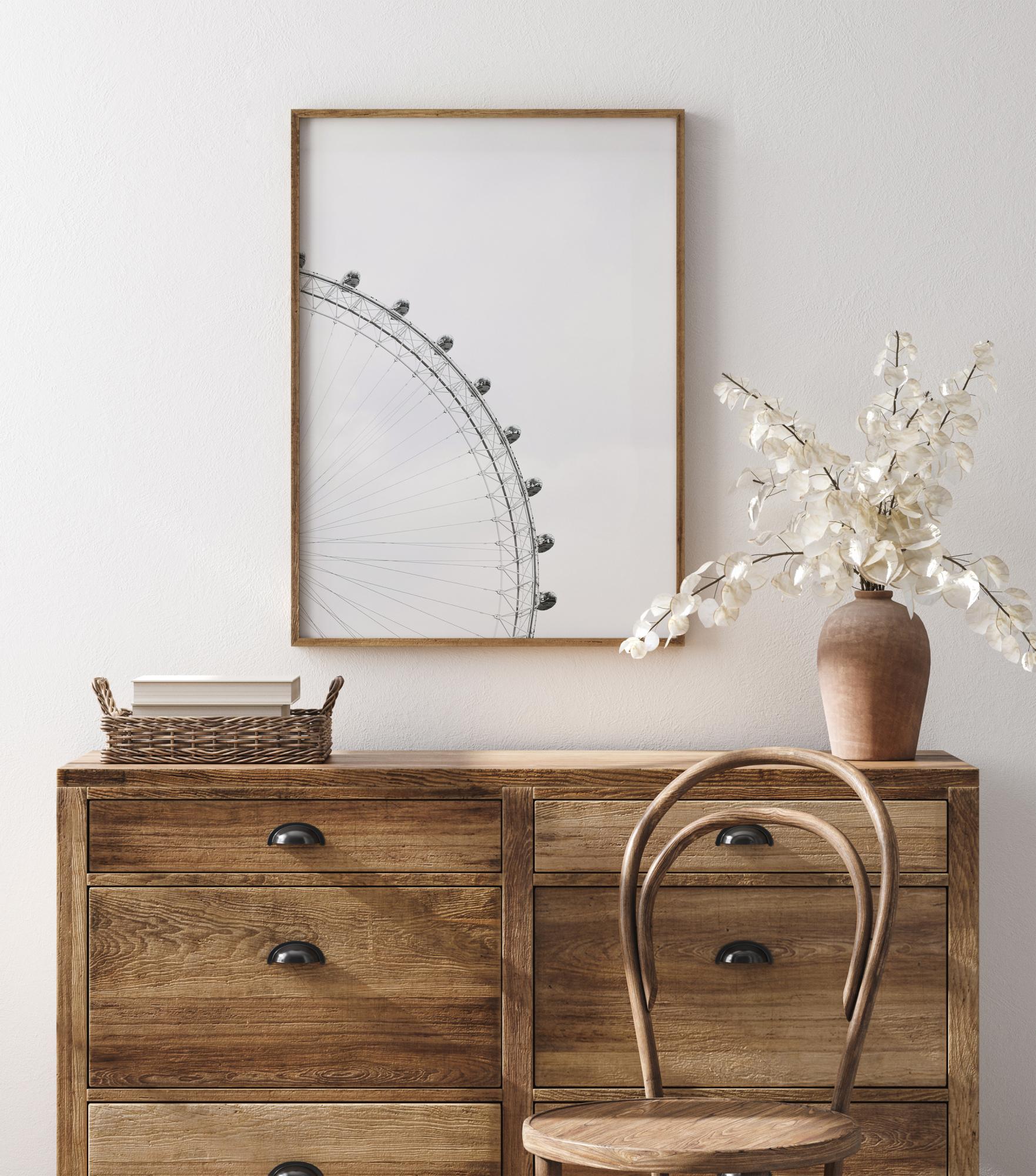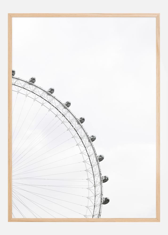 Impresivna črno-bela tiskovina Londonskega Očesa. Z sivo londonsko nebo v ozadju, naperi kolesa usmerjajo pogled na devet potniških kabin. Resnično impresiven plakat, ki izpostavlja to veličastno tehnično konstrukcijo. Predstavljajte si razgled iz ene od teh kabin.