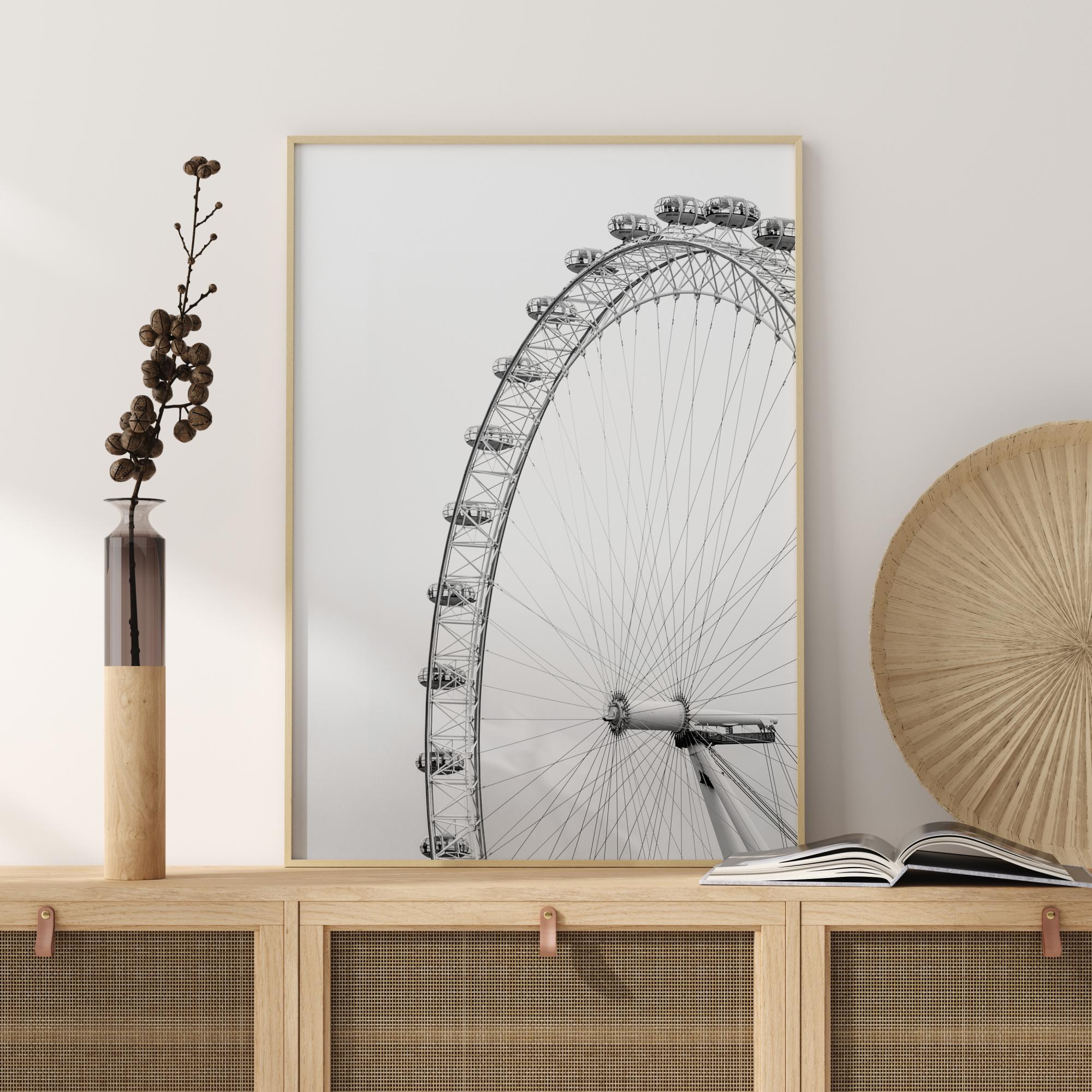 Osupljiv poster z London Eye. S sivim obzorjem črna kontura London Eye vodi pogled do potniških kabin, ki so na kolesu. Impresiven tisk, ki poudarja velikost kolesa. Lep tisk, ki ustvarja občutek neskončnosti.